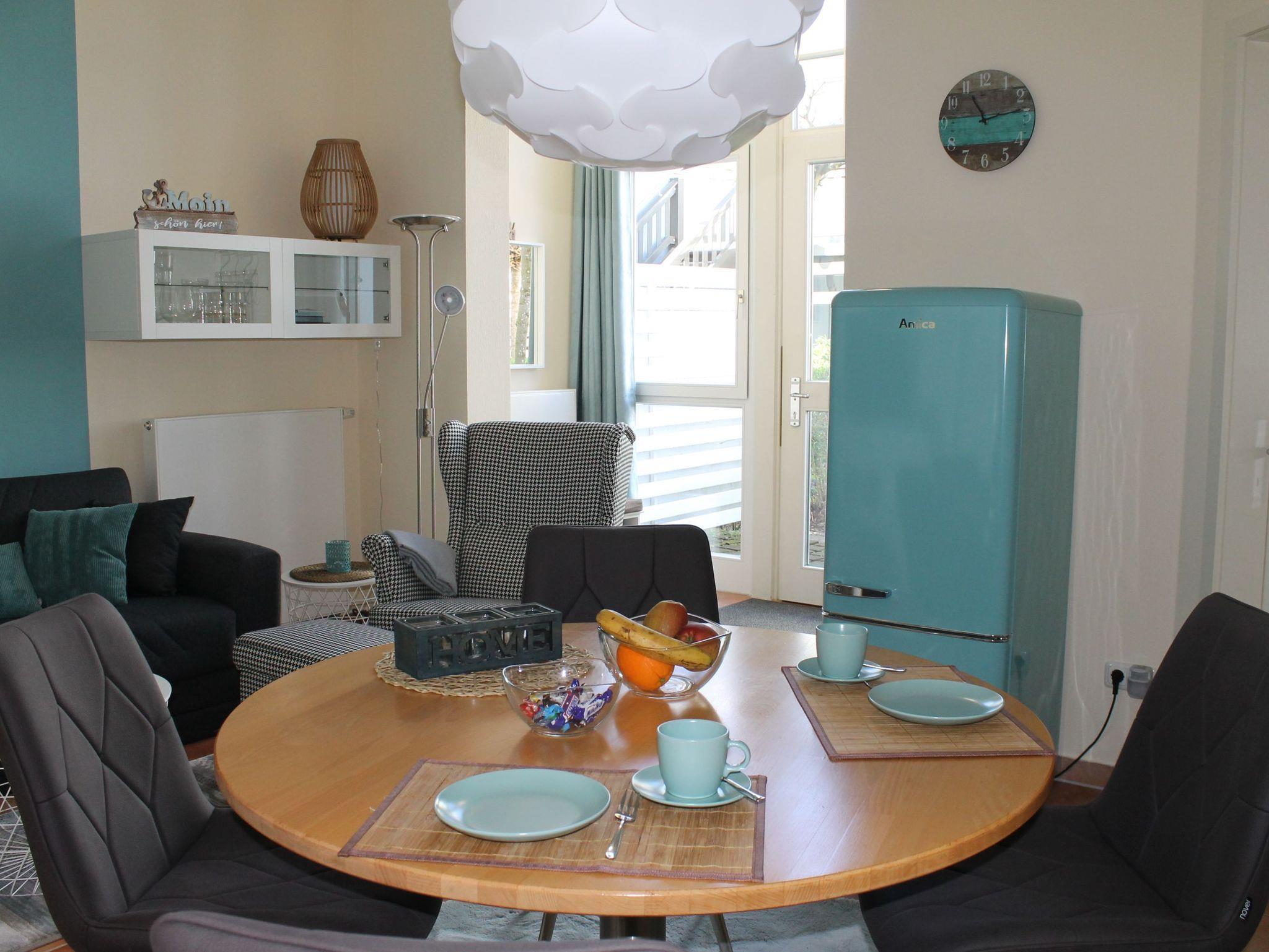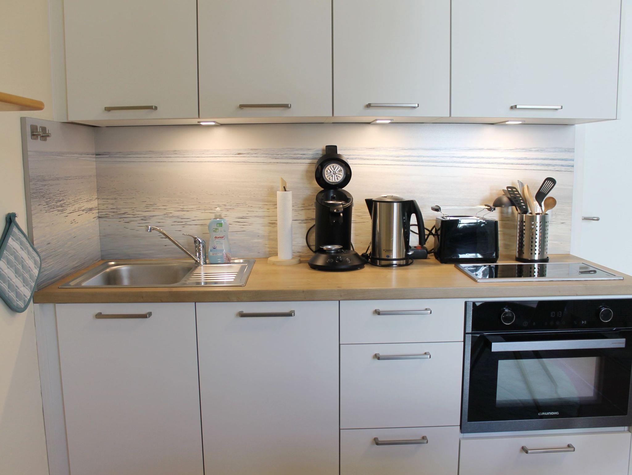 Die Wohnung verfügt über eine neue Küchenzeile mit einem Geschirrspüler, einem 2-Platten-Ceranfeld und einem Backofen mit integrierter Mikrowelle. Ebenfalls zur Ausstattung gehören ein Toaster, Wasserkocher, Eierkocher, Kaffeemaschine und eine zusätzliche Senseo Kaffeepadmaschine. Auch ein separater Kühl-/Gefrierschrank steht zur Verfügung. Die Mahlzeiten können an einem großen runden Tisch eingenommen werden, an dem 5 Stühle bereitstehen.