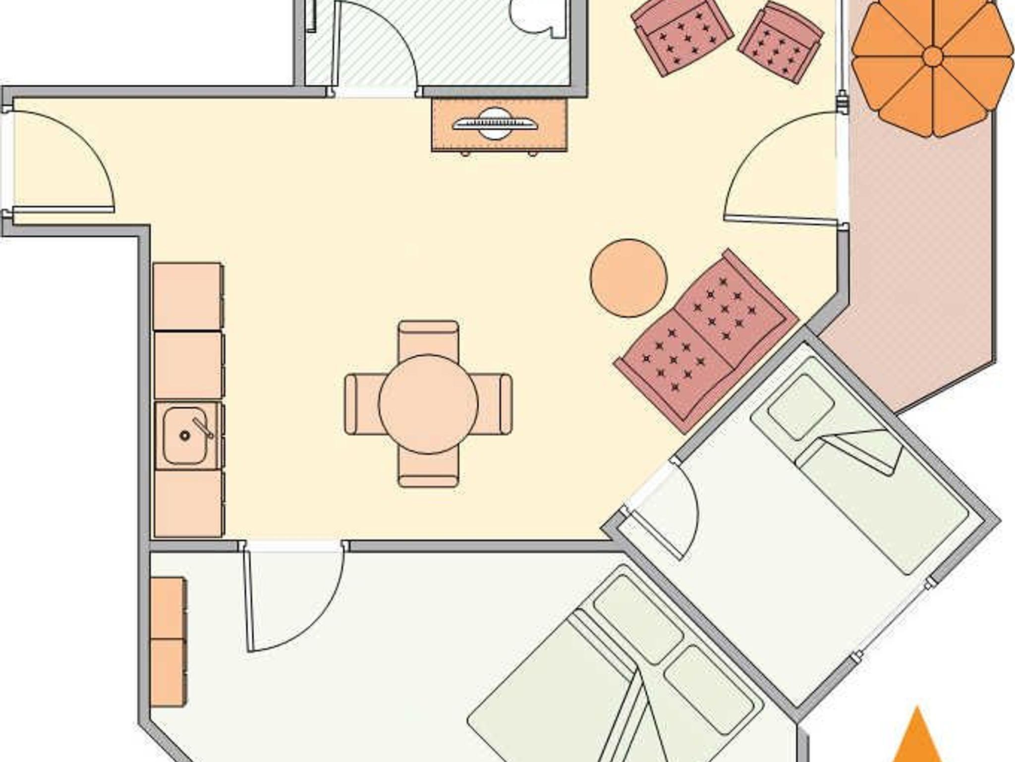 Die Wohnung ist in Parterre gelegen und hat eine Terrasse zur Ostseite. Die Wohnungsgröße beträgt ca. 48 qm und teilt sich in Wohnzimmer, Küchenzeile, Schlafzimmer, kl. Kinderzimmer, Bad mit Dusche und Flur. Im Wohnzimmer befindet sich ein Esstisch mit 4 Stühlen, eine Küchenzeile, Kühlschrank, Cerankochfeld, Mikrowelle mit Backofen, Tresor, HD-Sat TV und Telefon.