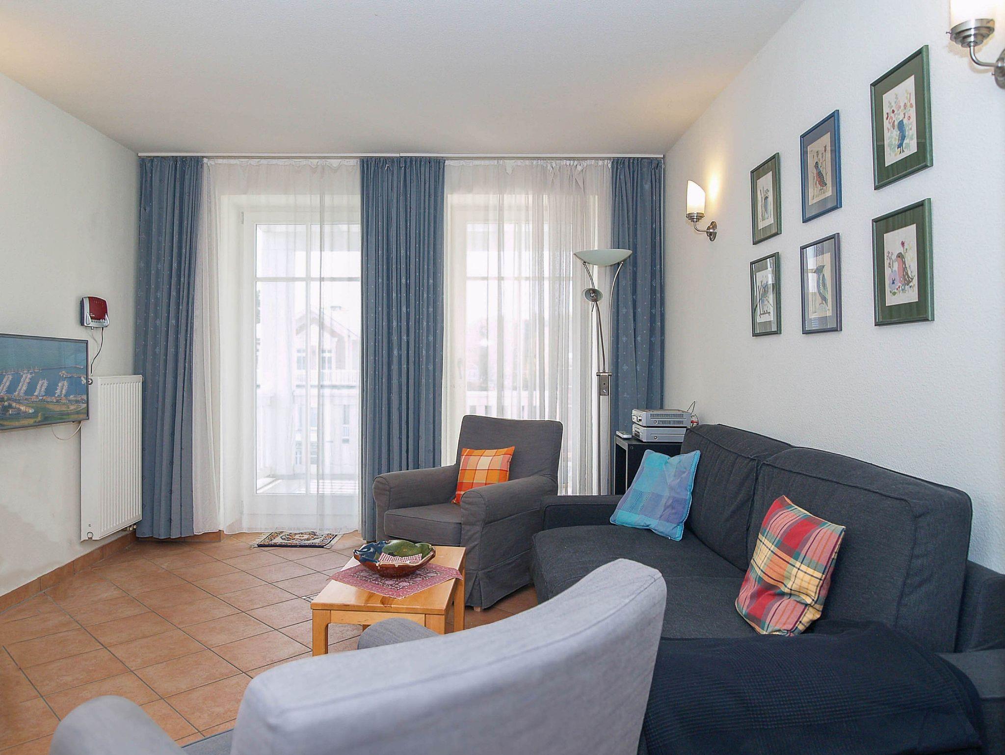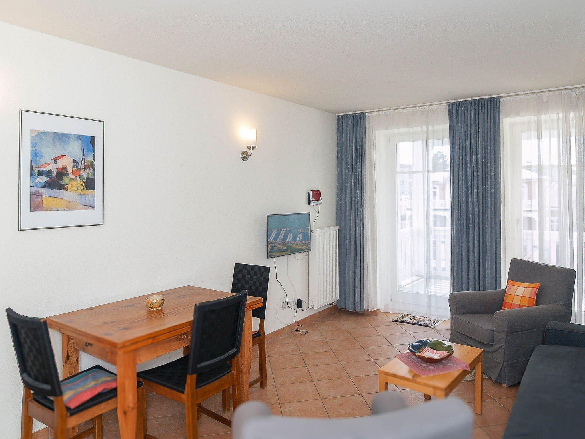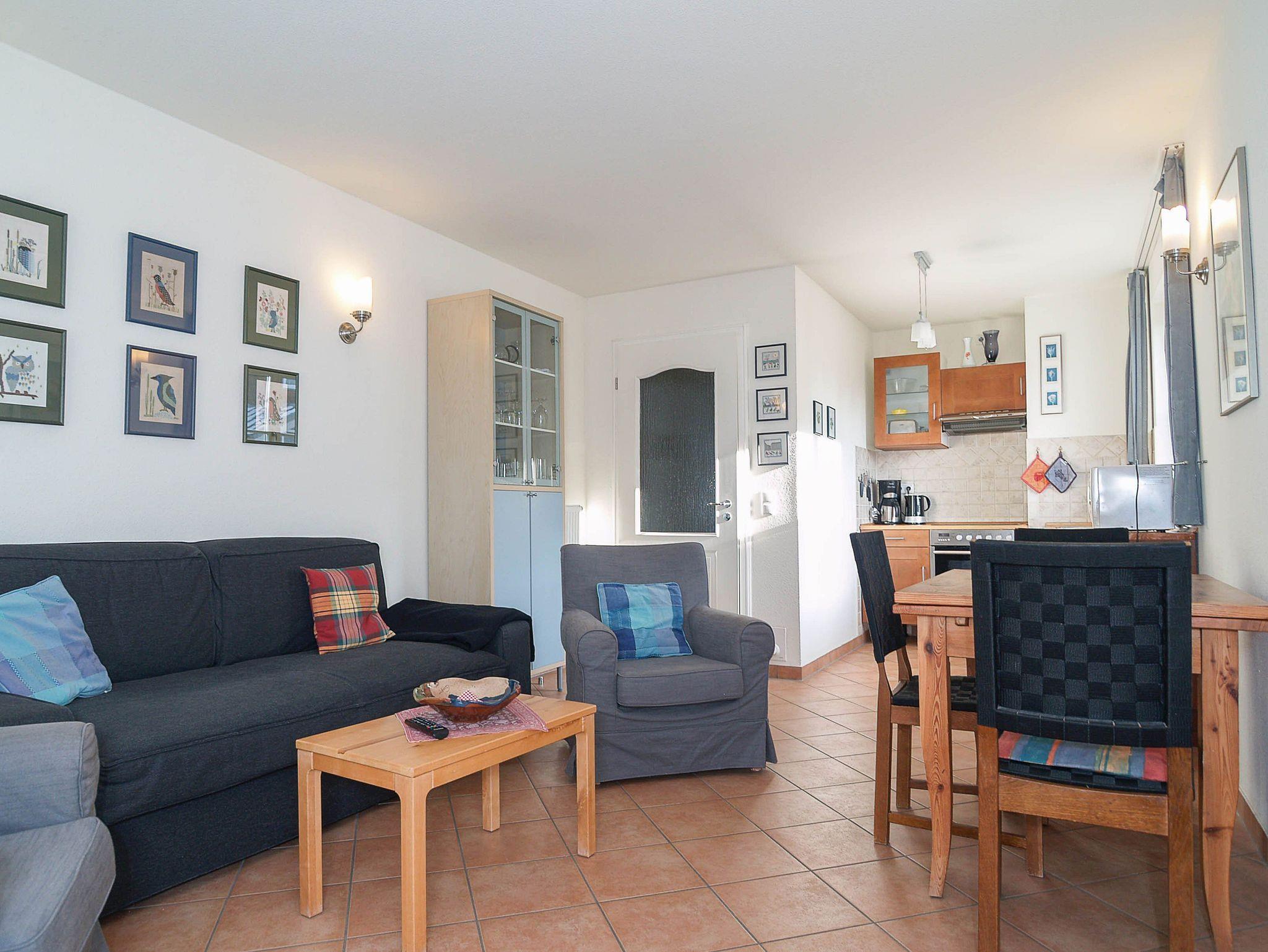 Der komfortabel eingerichtete Wohnbereich ist ausgestattet mit einer Couchgarnitur, Radio mit CD-Player und einem 32-Zoll-Flat-TV-Gerät. Die Couch können Sie m it nur wenigen Handgriffen in einen bequemen Schlafplatz für 2 Personen (160cm Breite) umwandeln. Der angrenzende Essbereich bietet Ihnen reichlich Platz für gemeinsame Mahlzeiten. Vom Wohnbereich betreten Sie den nach Süd-Westen ausgerichteten Balkon. Hier können Sie Sonne tanken, relaxen und den Abend nach einem schönen Tag am Meer ausklingen lassen.