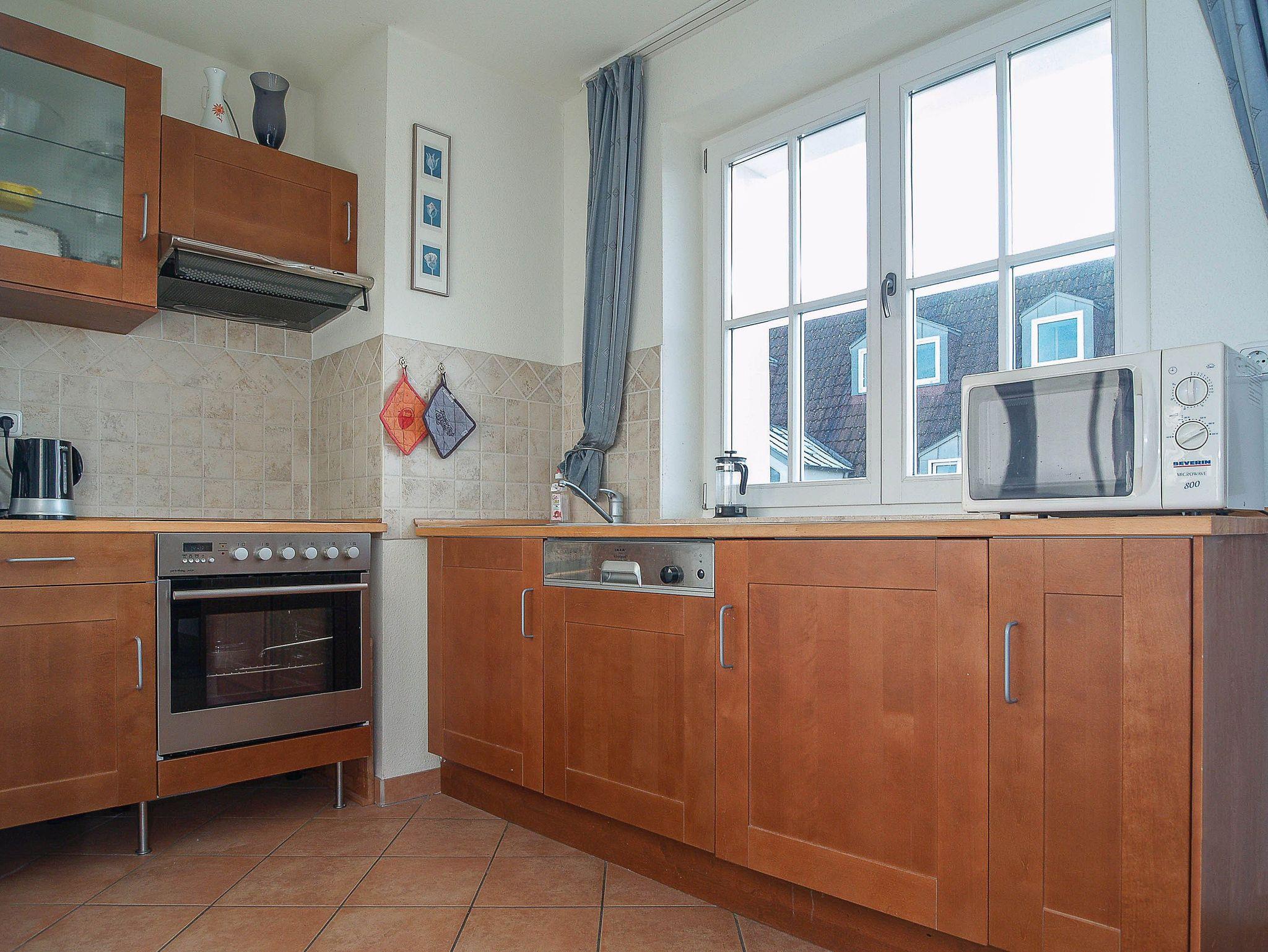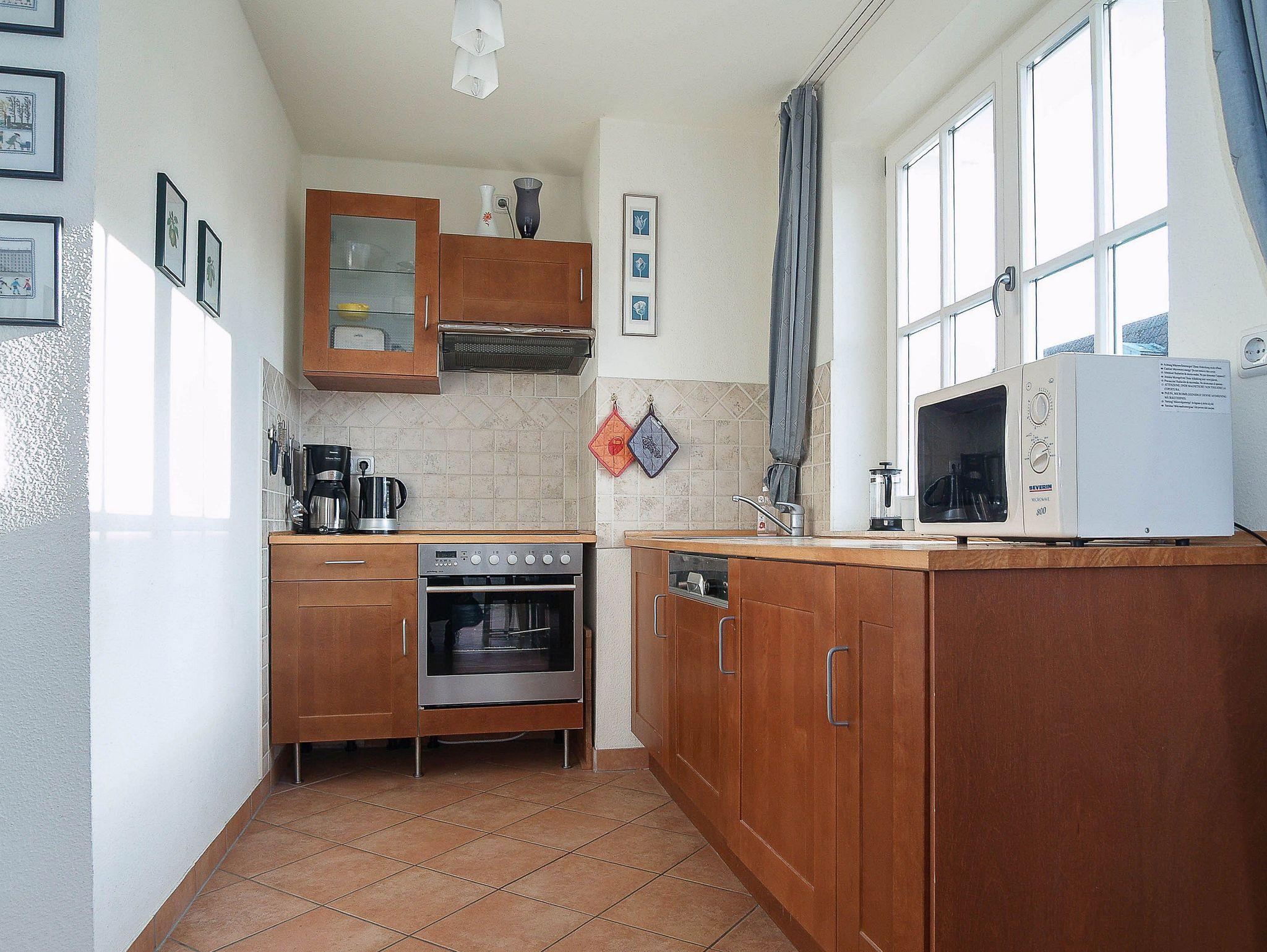 Die offene Küchenzeile im modernen Landhausstil hält für Sie alle wichtigen Küchengeräte und -utensilien bereit, die Sie für Ihr perfektes Dinner benötigen: Ein 4-Zonen-Cerankochfeld, ein Geschirrspüler, eine Mikrowelle sowie ein Kühlschrank mit Gefrierfach befinden sich in der Küche. Eine Kaffeemaschine, ein Wasserkocher und ein Toaster sowie genügend Koch- und Essgeschirr vervollständigen die Kücheneinrichtung.