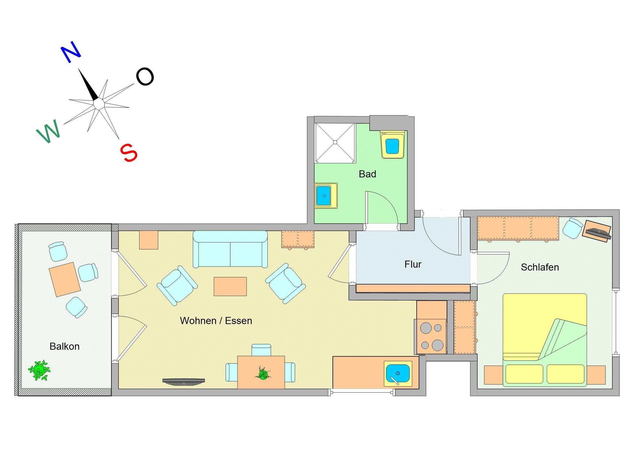 Herzlich willkommen in der Wohnung Nr. 04 im Haus Metropol! Sie entspannen sich in einer gemütlich eingerichteten 2-Raum-Ferienwohnung von ca. 51 m² Größe, die sich im 2. Obergeschoss des Hauses befindet. Es empfangen Sie ein offener Wohnraum mit einer Küchenzeile, ein Schlafzimmer, ein Duschbad sowie ein Balkon mit Süd-West-Ausrichtung.
