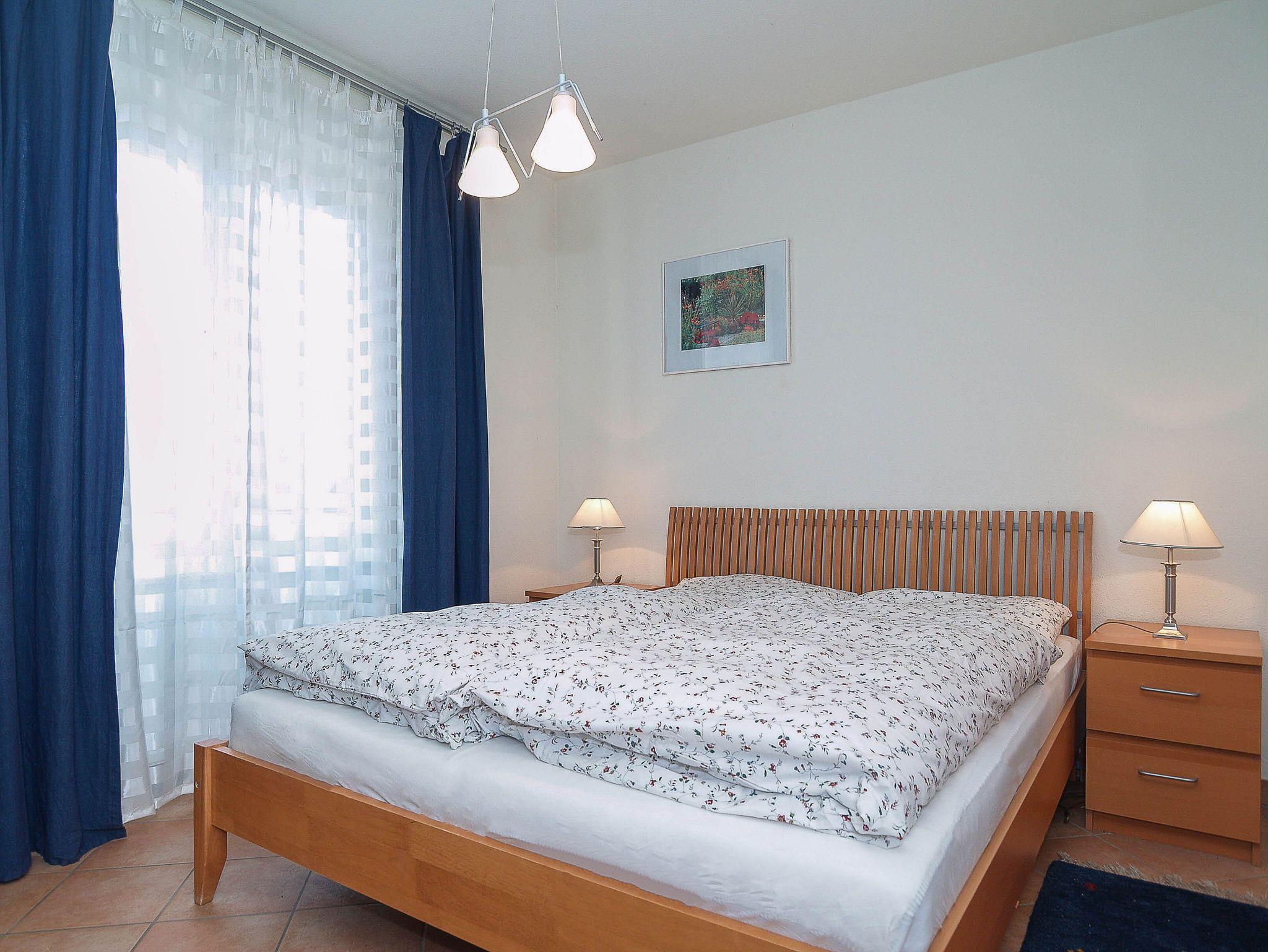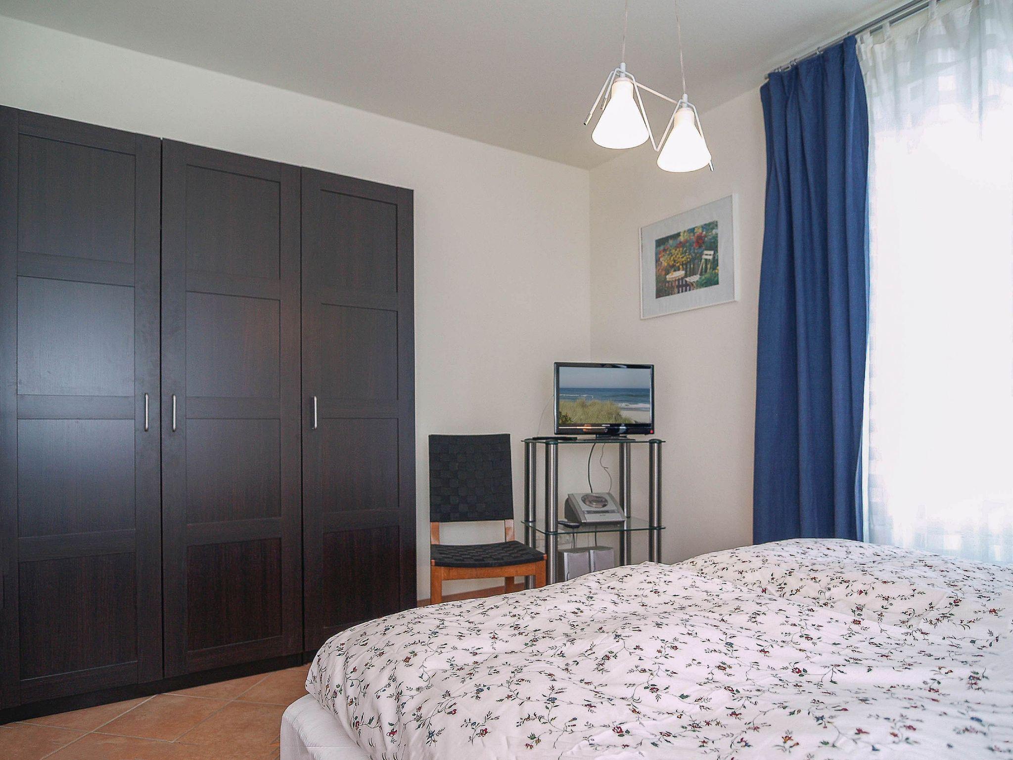 Im Schlafzimmer lädt Sie ein komfortables Doppelbett (2 x 80cm x 200 cm) zur Nachtruhe ein. Der großzügige Kleiderschrank bietet genügend Platz für Ihre Urlaubsgarderobe. Als Sichtschutz bzw. zum Verdunkeln sind im Schlafzimmer eine Gardine und ein Vorhang am Fenster angebracht. Das Schlafzimmer ist zudem mit einem kleinen Flachbild-Fernseher (28 Zoll) und einem Radio ausgestattet.