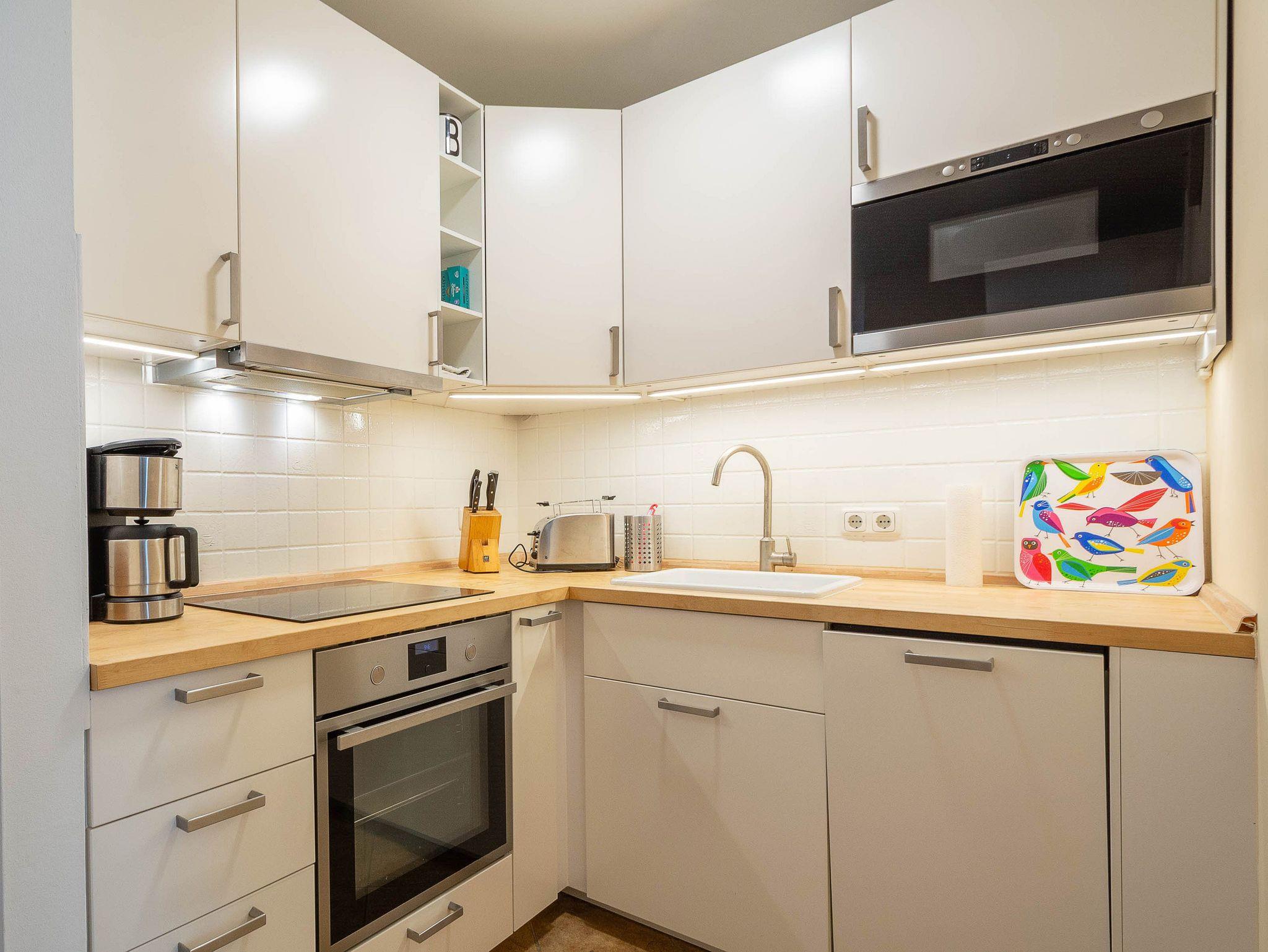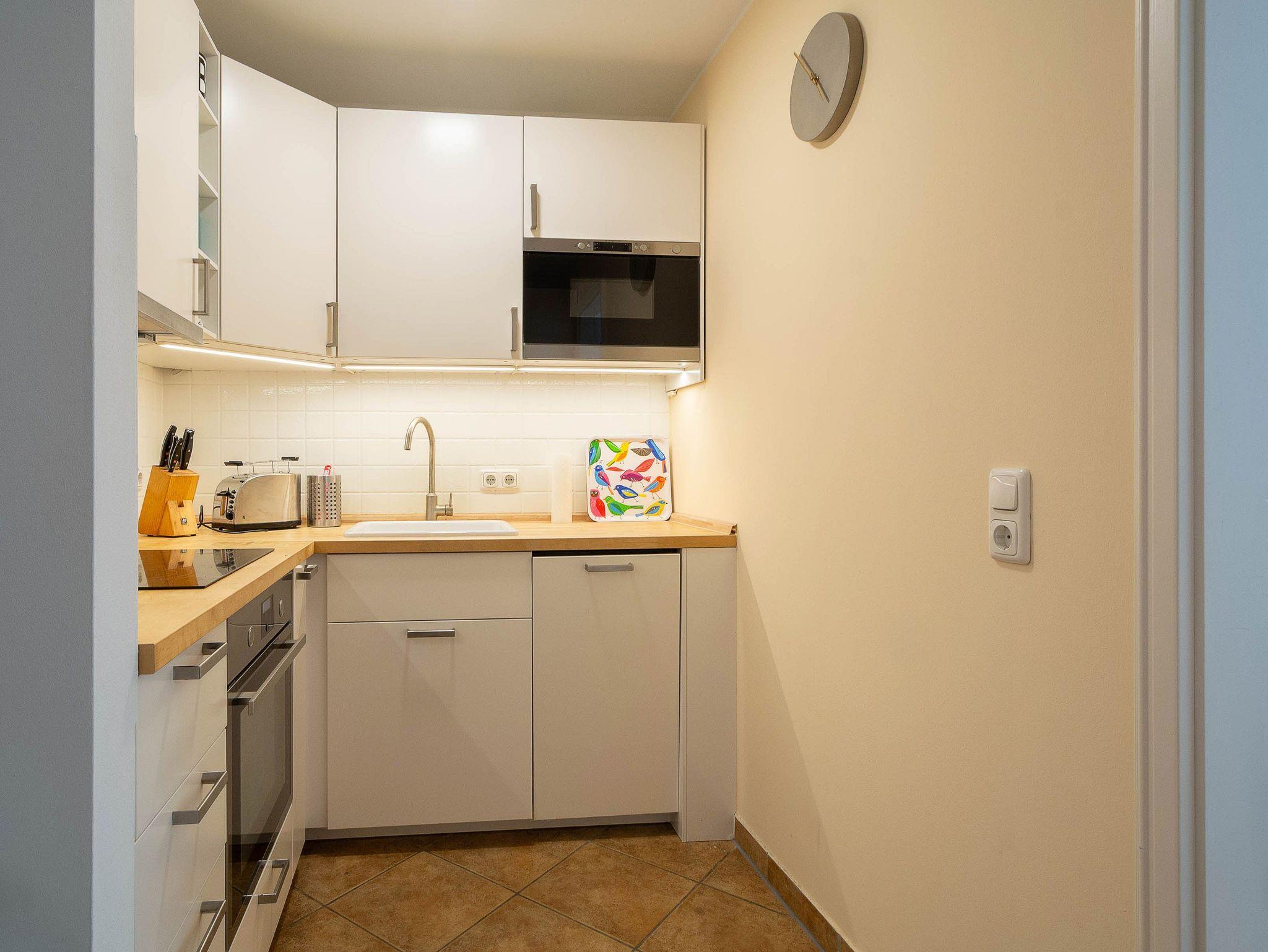 Die offene Küchenzeile ist vollständig ausgestattet und bietet mit Backofen, Cerankochfeld, Spülmaschine, Mikrowelle, Kühlschrank mit Gefrierfach, Kaffeemaschine, Wasserkocher und Toaster alles, was Sie für die Zubereitung Ihrer Lieblingsgerichte benötigen.