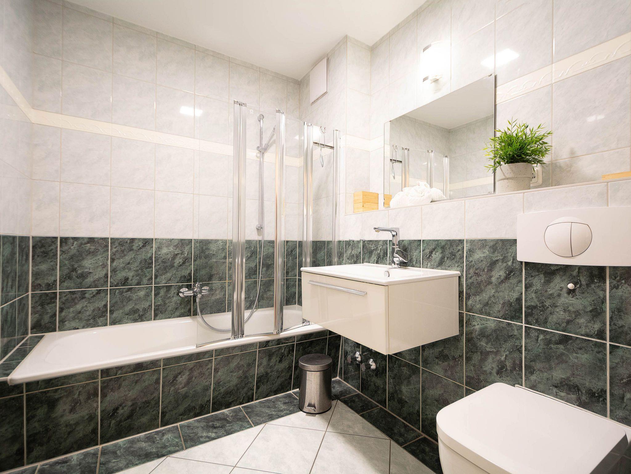 Das Badezimmer ist mit einer Duschwanne, einem Waschbecken, einem WC sowie einem Handtuchheizkörper ausgestattet. Ein Fön und ausreichend Ablageflächen runden die komfortable Ausstattung ab.
