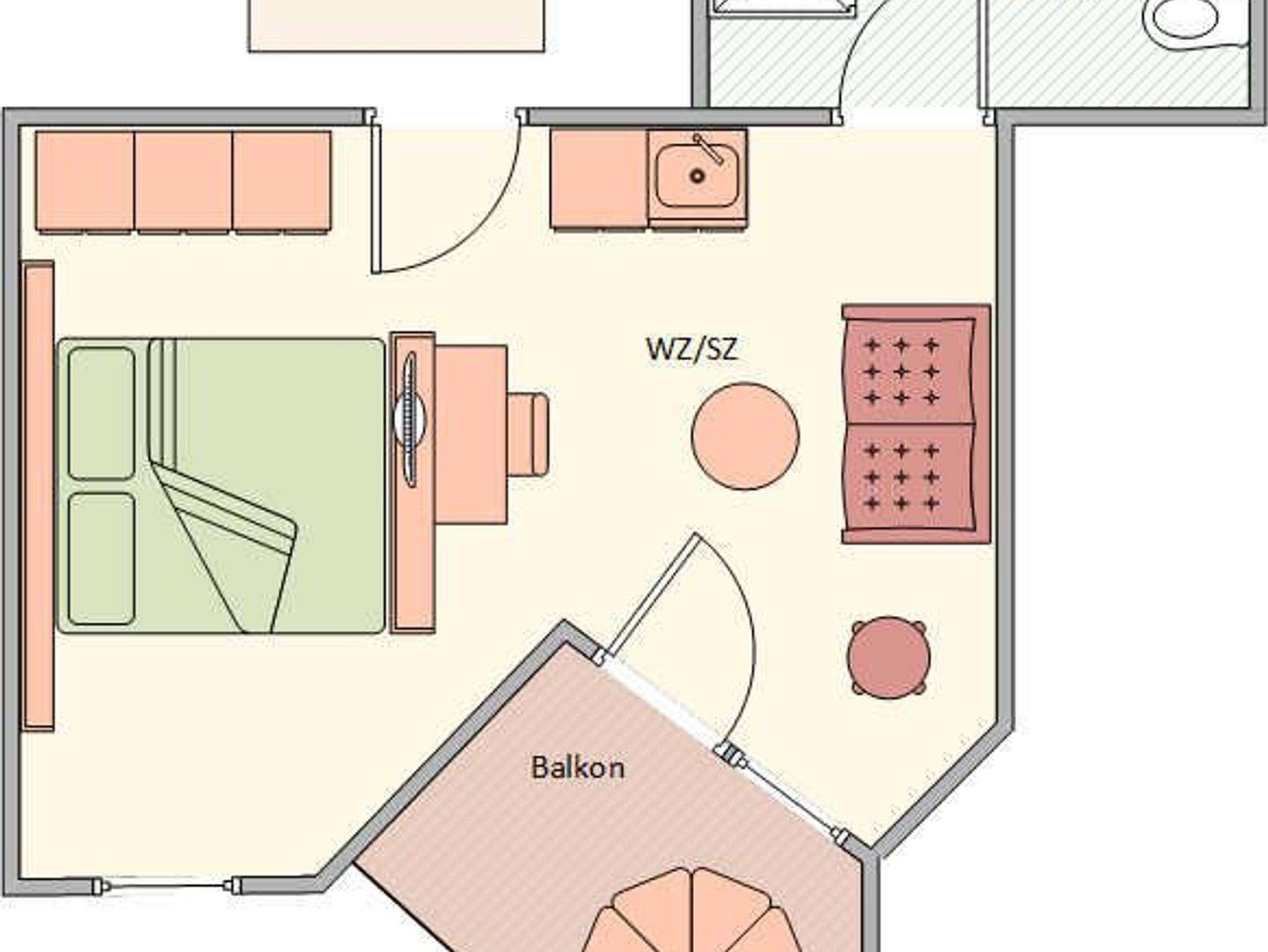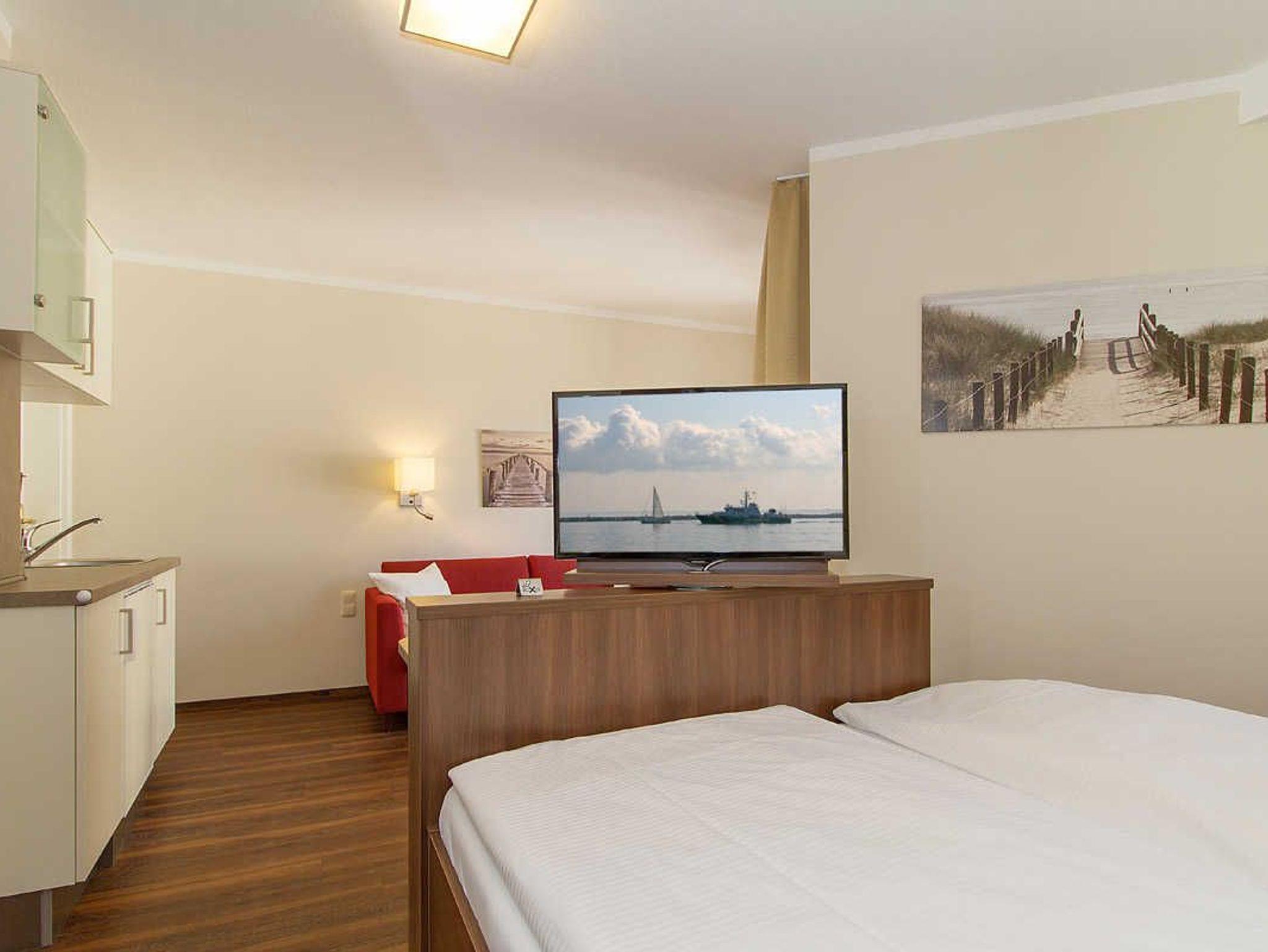 Umfangreich renoviertes 1 Raumappartment mit Platz für 2 Personen. Die Wohnung liegt in der 3ten Etage und ist mit dem Balkon zur Ostseite ausgerichtet. Im Schlafzimmer befindet sich ein komfortables Bett. Das helle Appartement ist mit ansprechenden Polstermöbeln ausgestattet und verfügt über eine kleine Pantryküche.