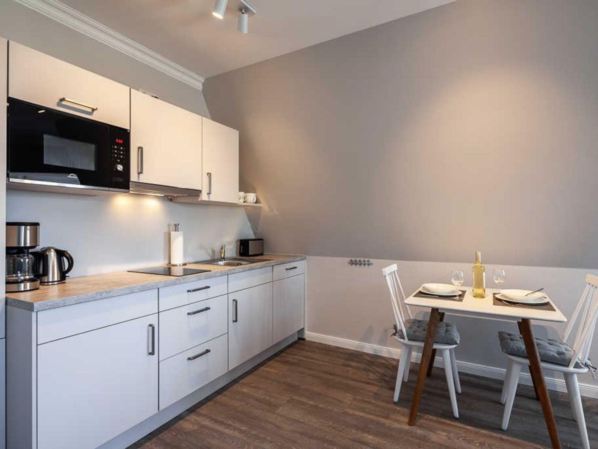 Kühlschrank, Mikrowelle, Wasserkocher, Toaster, Kaffeemaschine und div. Geschirr ausgestattet.