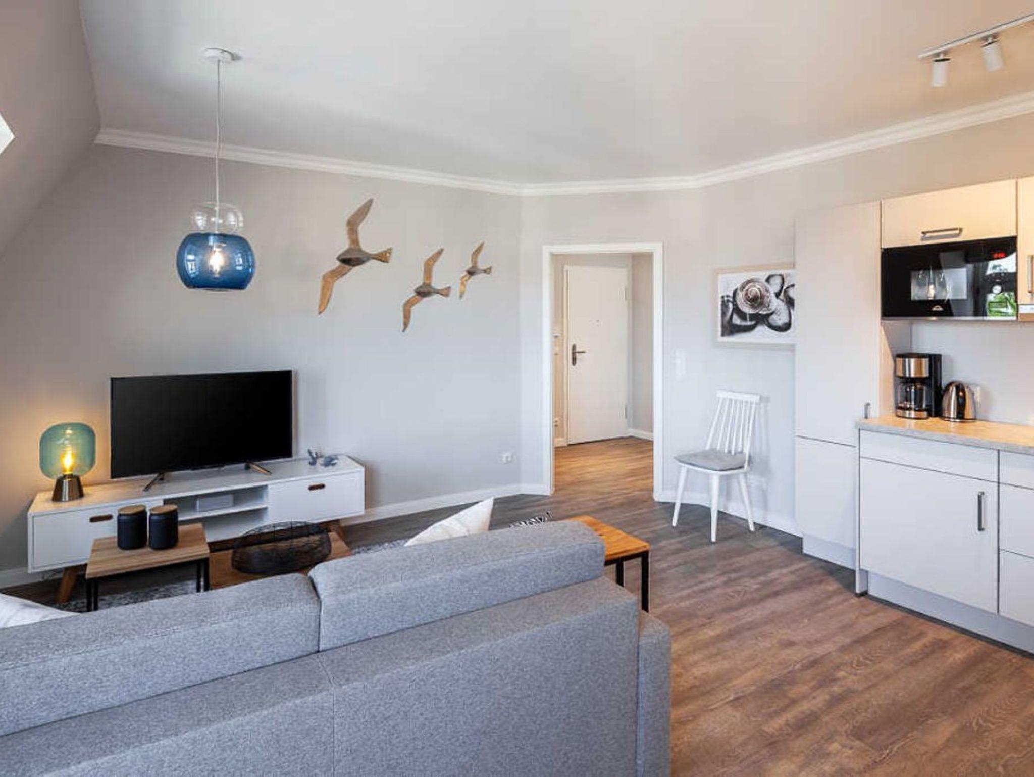 Wohnzimmer mit Couch, Esstisch, Küchenzeile, Kabel-TV, Radio und passwortgeschütztes Wlan