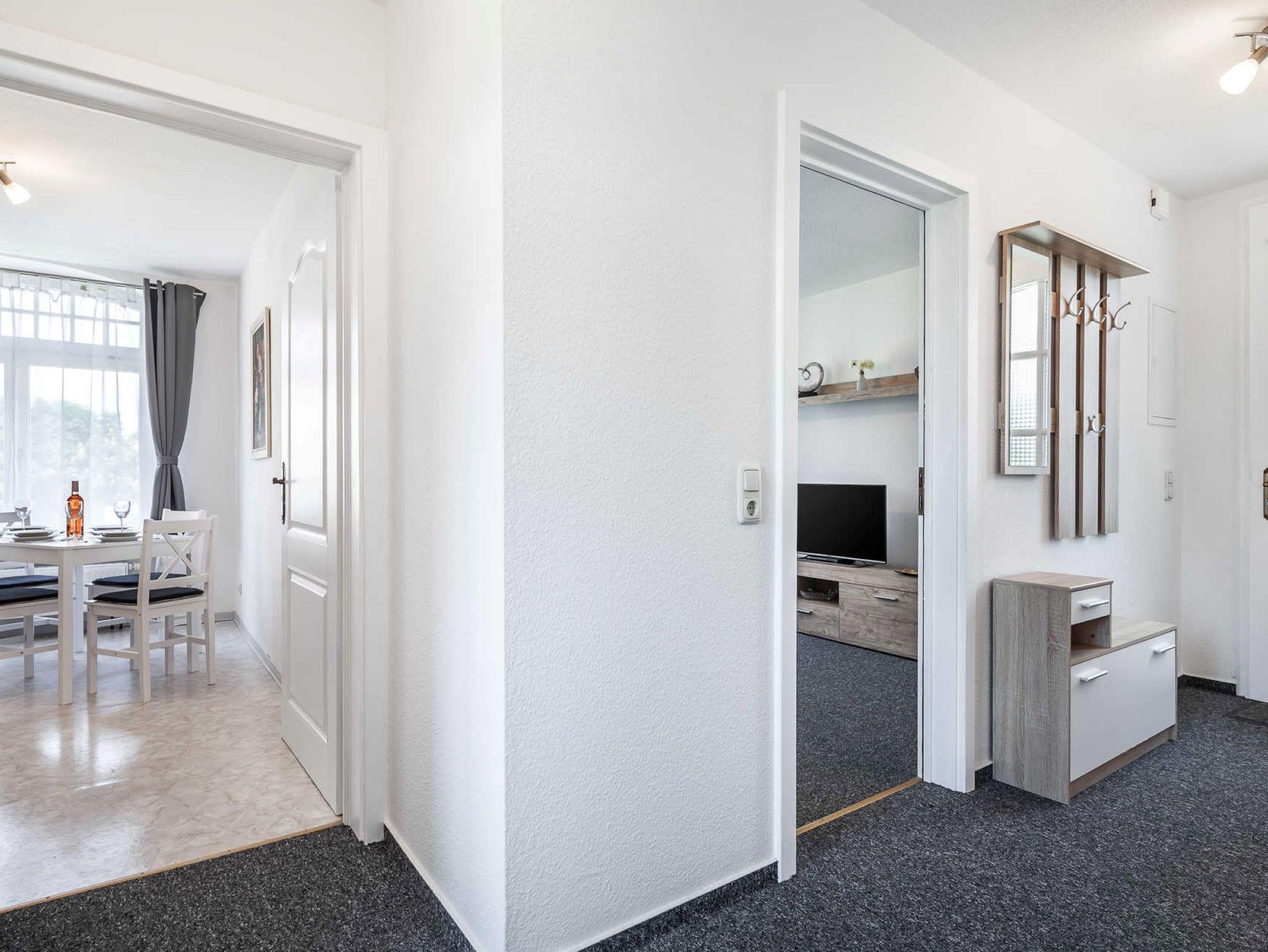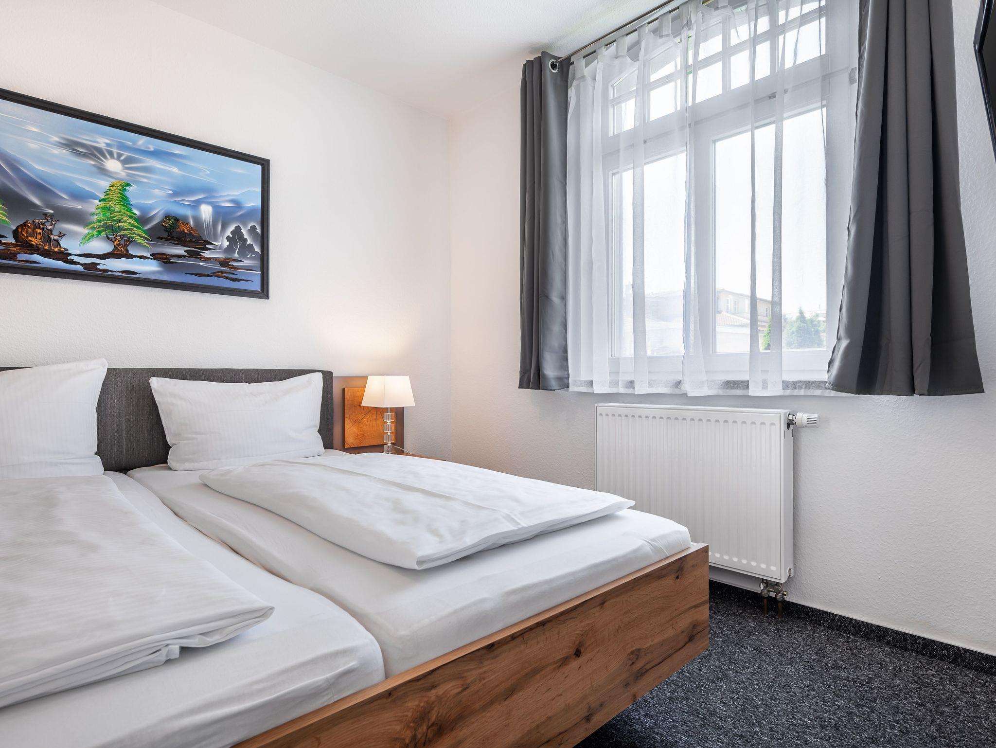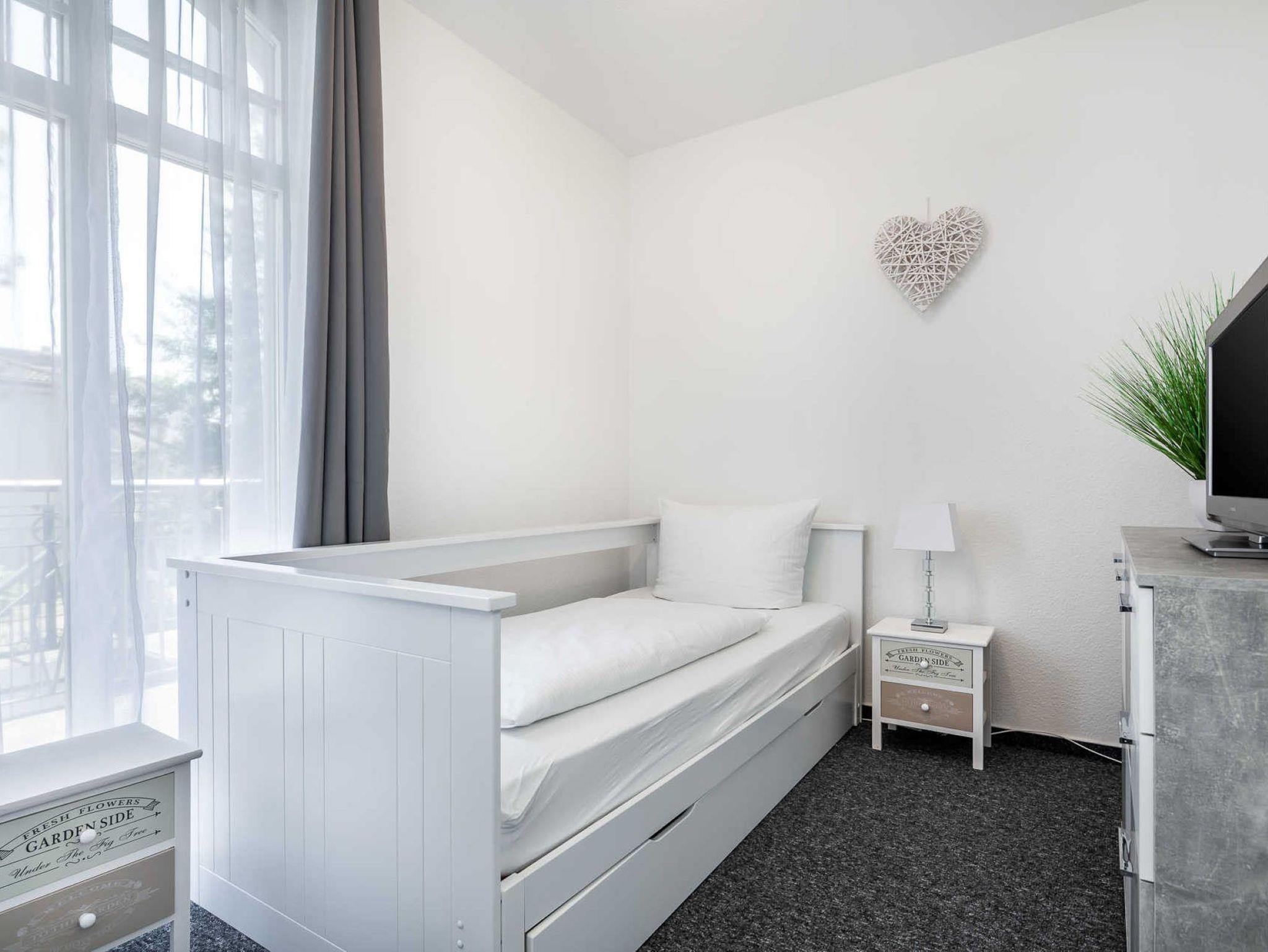 Nur 150 m vom Strand wohnen Sie in einer 3-Raum-Ferienwohnung. Die 55 qm große Wohnung liegt in der 1. Etage. Das Wohnzimmer ist mit einer Couch, Couchtisch, Sessel, Anrichte, mit Kabel-TV, Radio, Essbereich (Tisch und Stühle) und Küchenzeile ausgestattet. Der Balkon mit Tisch und Stühle geht zur Ostseite. Im Schlafzimmer stehen ein Doppelbett und ein Kleiderschrank. Im Gästezimmer stehen ein Bett und ein kleiner Schrank mit TV . Die Küchenzeile wurde ausgestattet mit Mikrowelle, Kühlschrank, Kaffeemaschine, Ceran-Kochfeld und Backofen, Geschirrspüler, Toaster und Wasserkocher. Das Bad mit Dusche und WC komplettiert die Wohnung.
