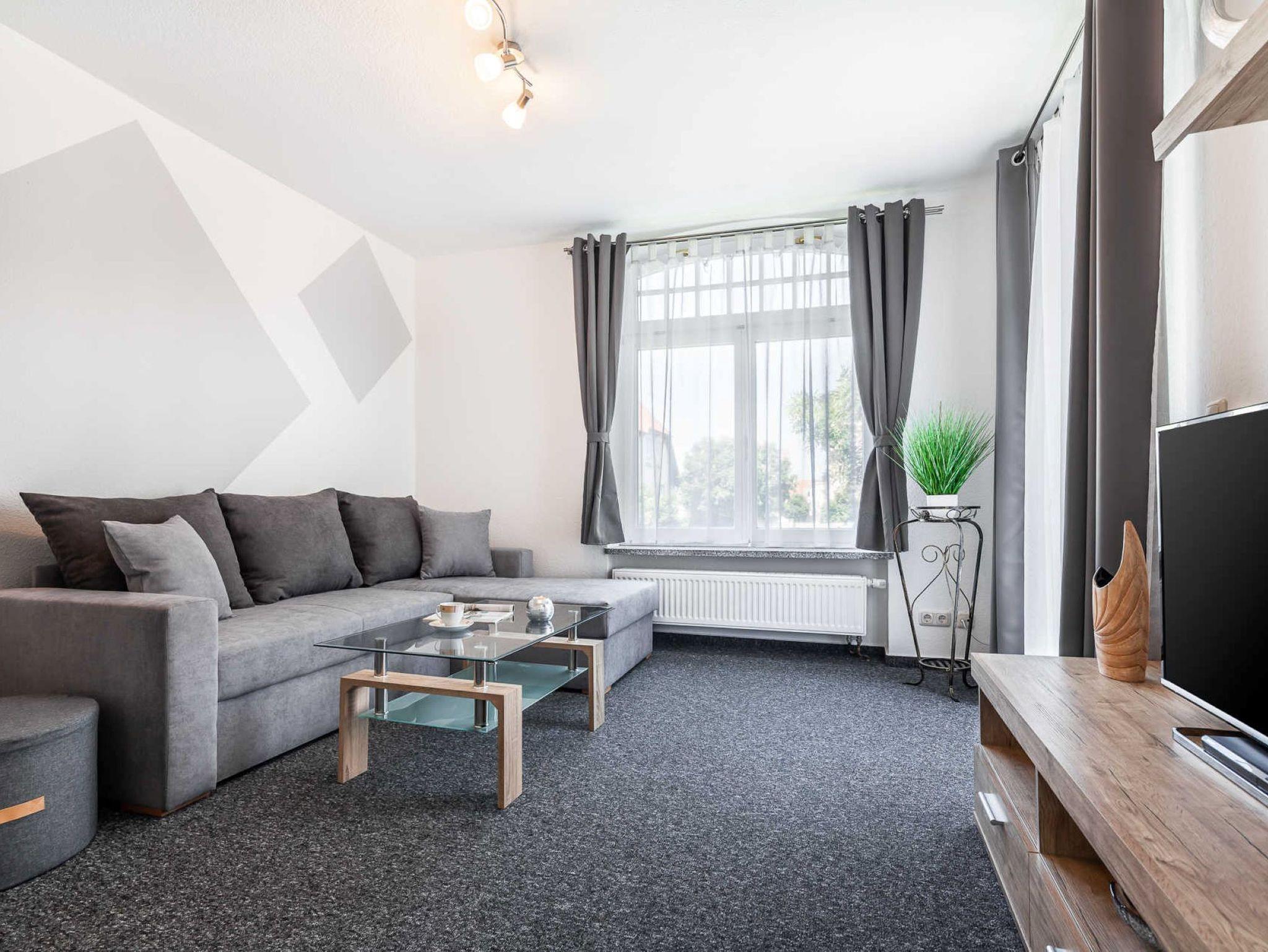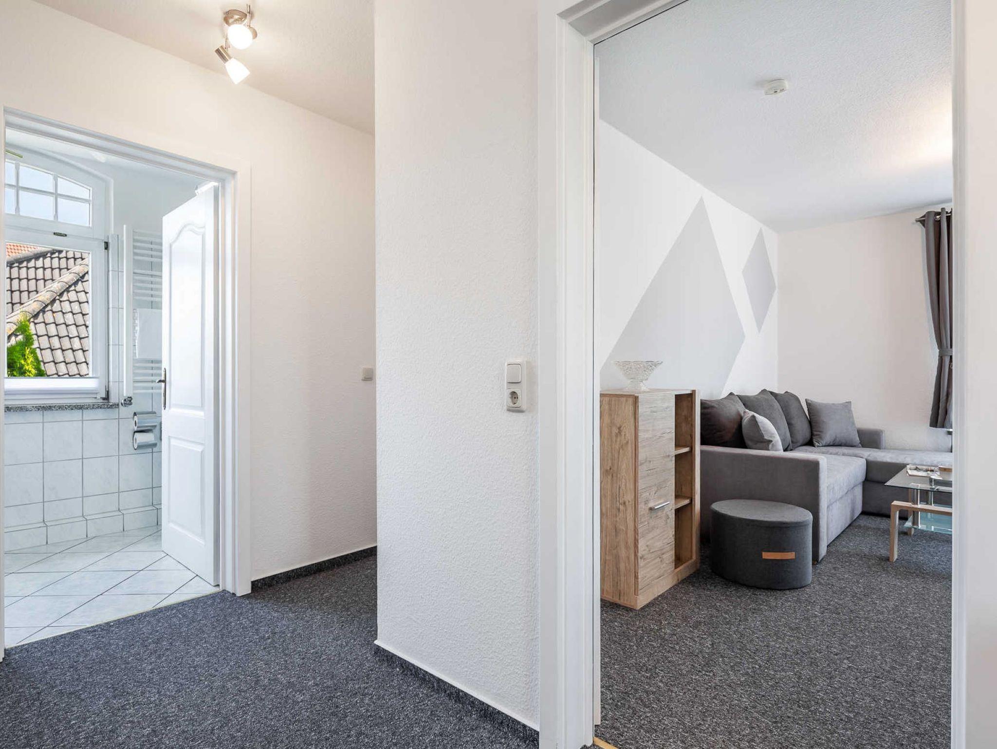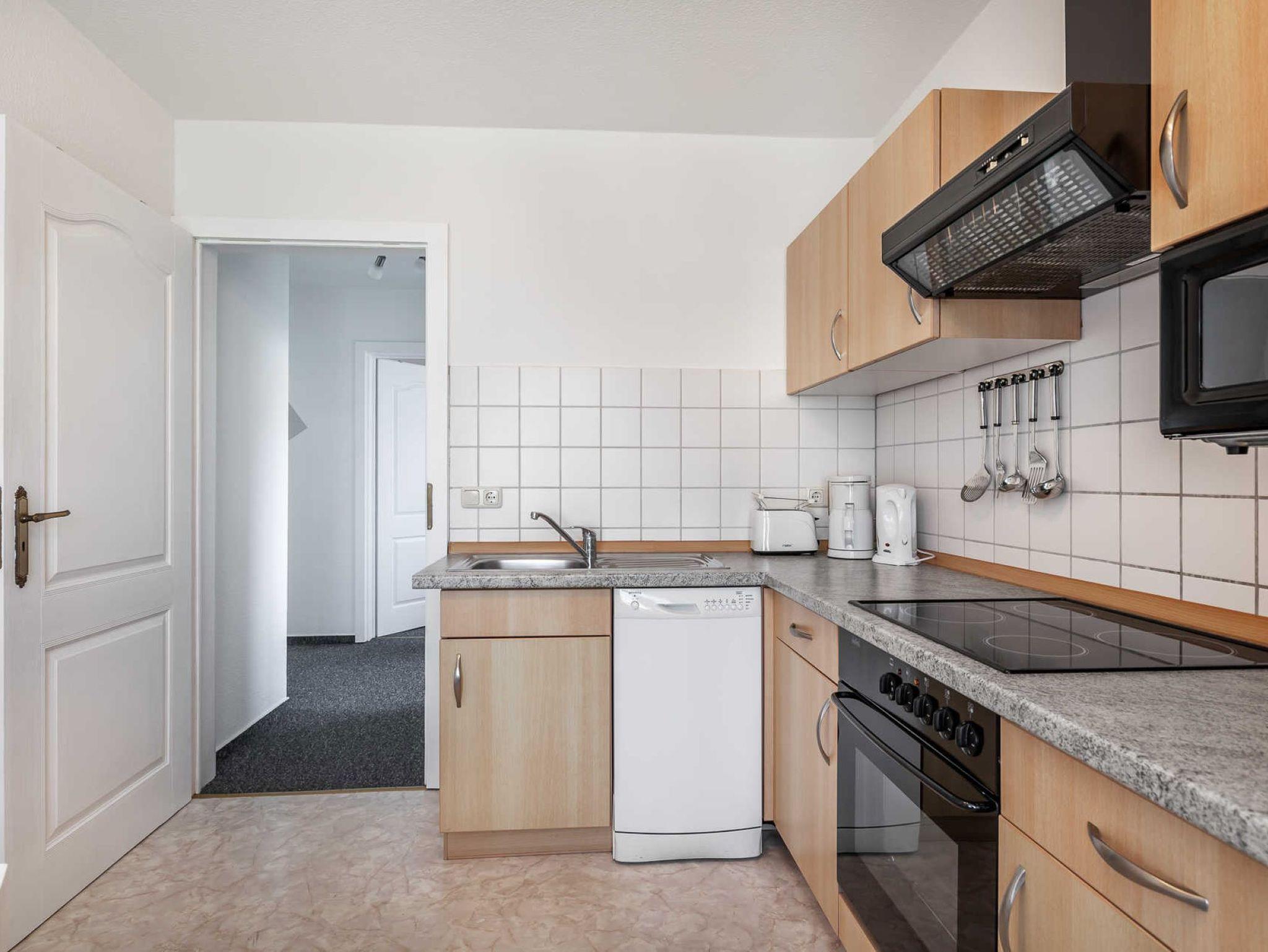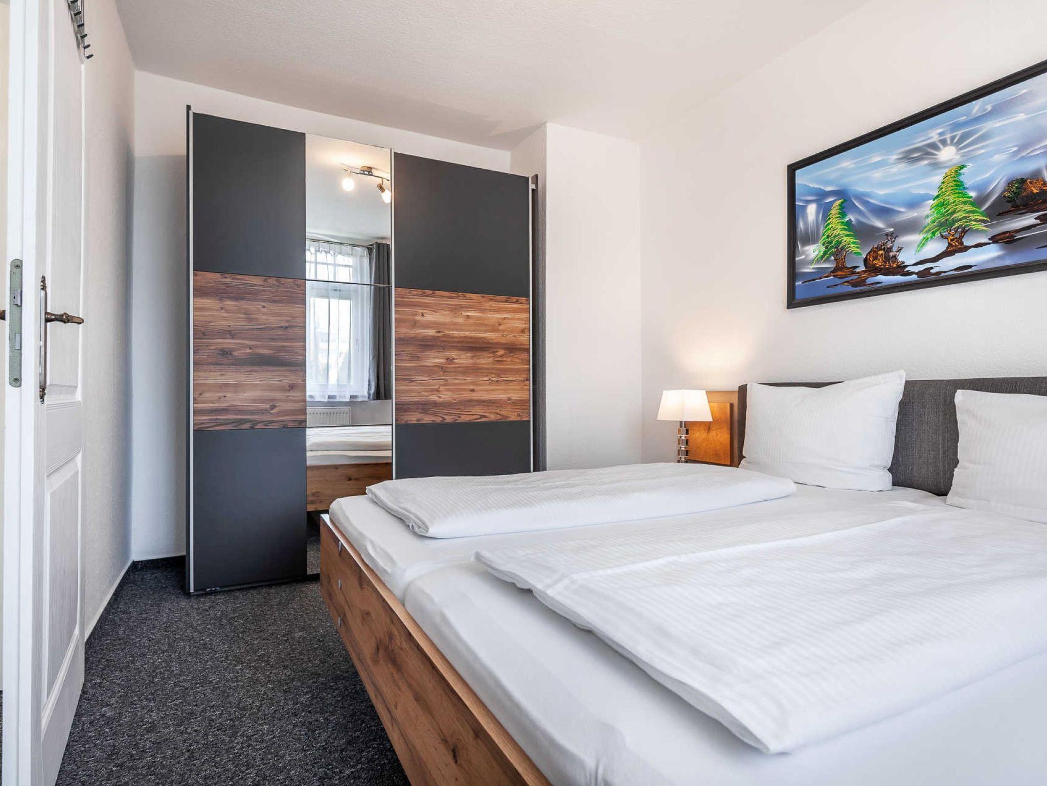Die funktional gestaltete Ferienwohnung in der 1. Etage hat ein Wohnzimmer mit bequemer Sitzecke, eine Küche mit Esstisch und Stühle, ein Schlafzimmer mit Doppelbett, Nachttische, Kabel-Tv und einen Kleiderschrank, ein Gästezimmer mit Einzelbett und ein Balkon. Die funktionale Küche ist mit 4-Platten-Ceranfeld, Backofen, Kühlschrank, kleinen Gefrierschrank, Mikrowelle, Geschirrspüler, Kaffeemaschine, Wasserkocher, Toaster und div. Geschirr ausgestattet. Ein Bad mit Fenster, Dusche, Waschbecken und WC komplettieren den guten Gesamteindruck der Wohnung.