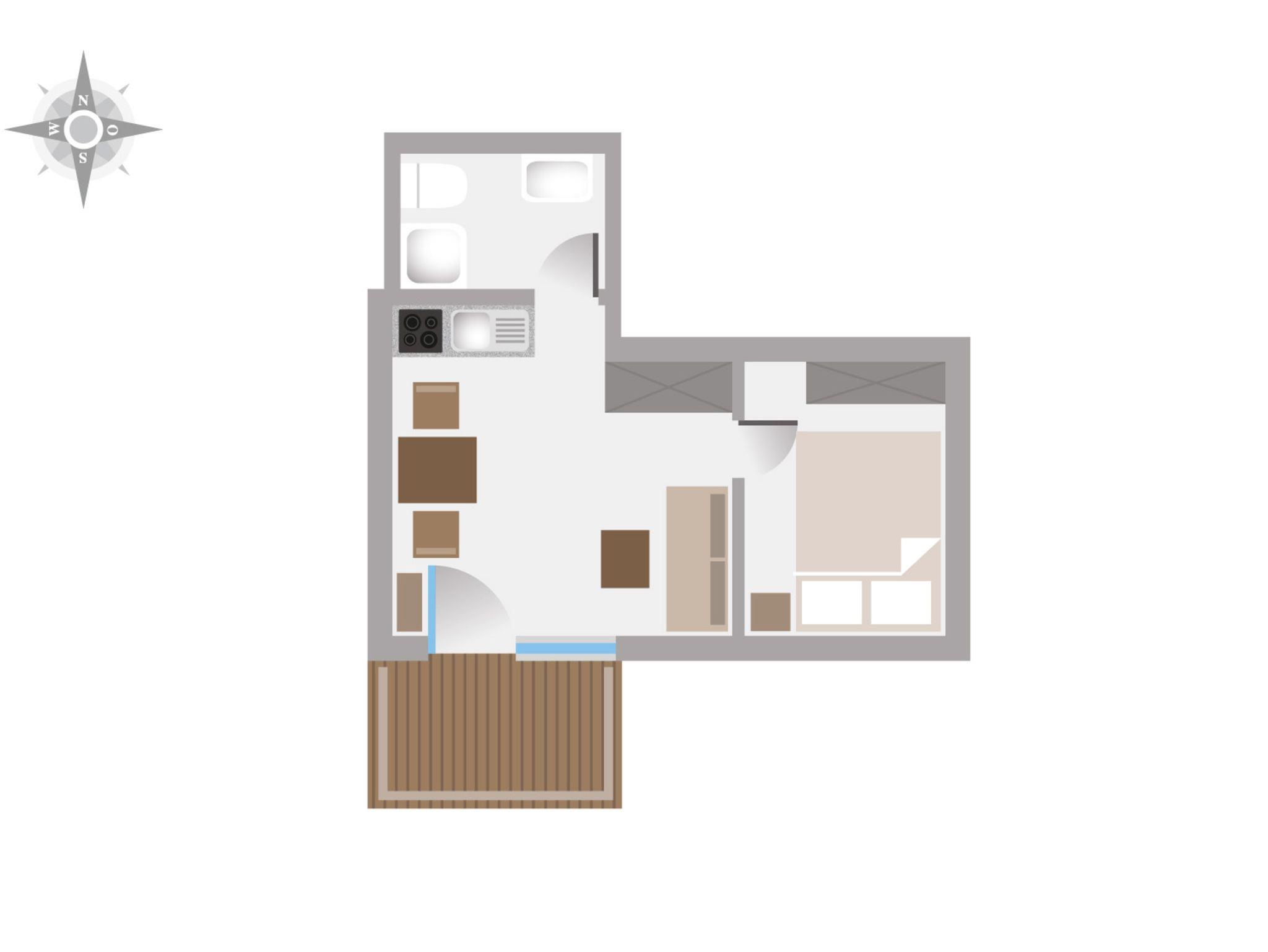 Wohnraum mit Küchenzeile und Esstisch, ein Schlafzimmer mit Doppelbett, Bad, Südbalkon,