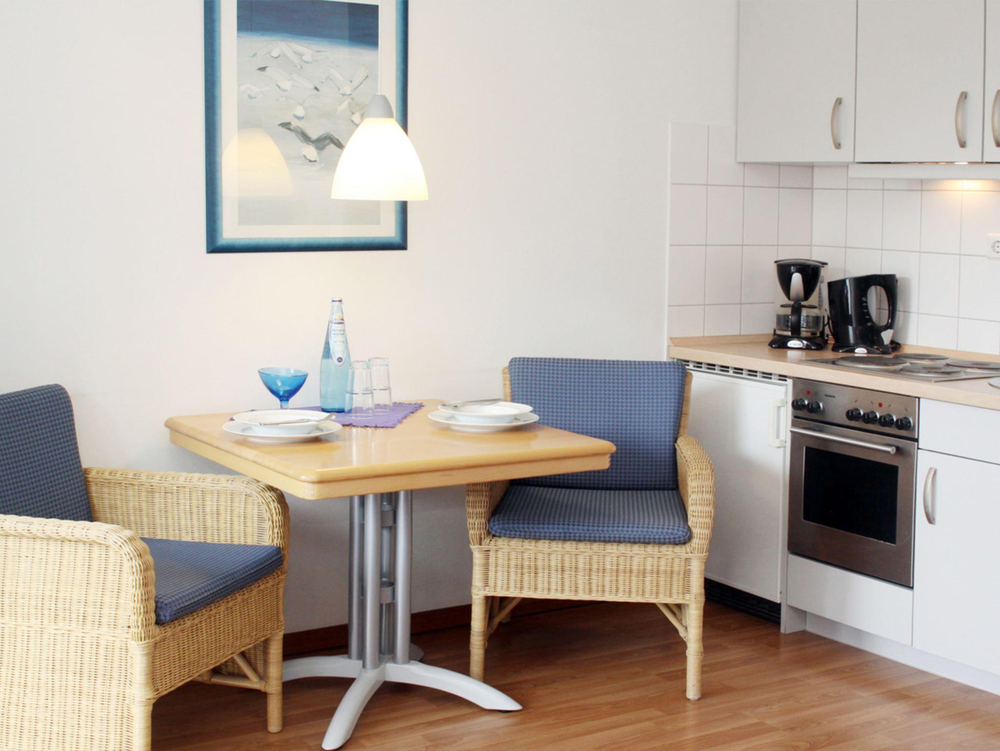 Über den ruhig gelegenen Südbalkon gelangen Sie in den Wohn- / Essraum. Die Küche ist mit Kühlschrank, Backofen, Vierplattenherd, Kaffeemaschine, Toaster, Wasserkocher und ausreichend Geschirr ausgestattet, so dass Sie auch im Urlaub, wenn Sie viel Zeit und Lust haben, ab und zu selbst kochen können.