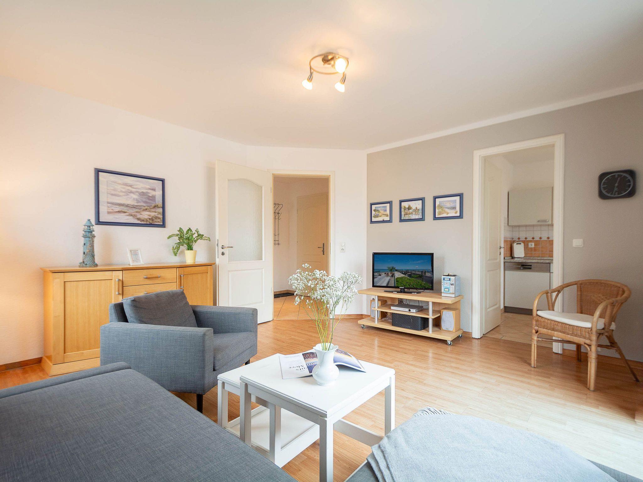 Das helle Wohnzimmer ist mit einer bequemen Schlafcouch, einem Flat-TV und einem DVD-Player ausgestattet. Von hier aus gelangen Sie direkt auf den sonnigen Balkon in Süd-West-Lage. Hier können Sie den Tag bei einem ausgedehnten Frühstück beginnen oder abends mit einem Glas Wein den Sonnenuntergang genießen. Der möblierte Balkon bietet einen ruhigen Platz im Freien, um frische Ostseeluft zu tanken und die Urlaubsstunden entspannt ausklingen zu lassen.