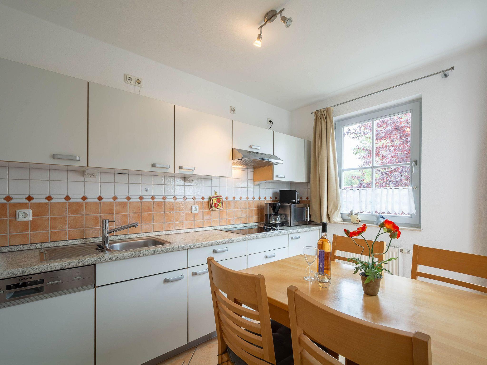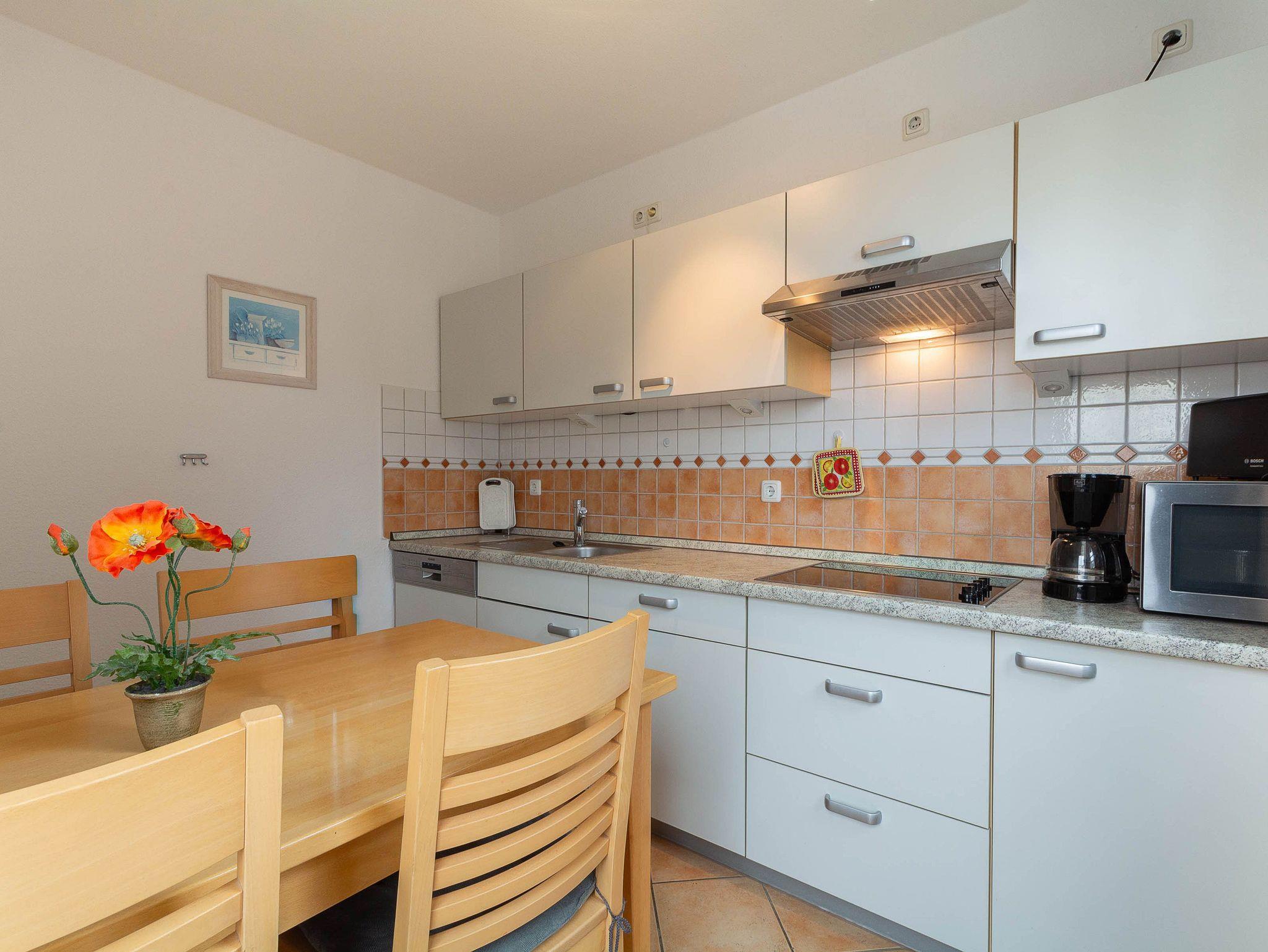 Die separate Küche verfügt über einen Geschirrspüler, ein Cerankochfeld mit vier Kochzonen, eine Mikrowelle sowie einen Kühlschrank mit Gefrierfach. Kaffeemaschine, Wasserkocher und Toaster stehen ebenfalls bereit. In der Küche befindet sich auch der Esstisch, an dem sich gemeinsame Mahlzeiten in gemütlicher Atmosphäre genießen lassen.