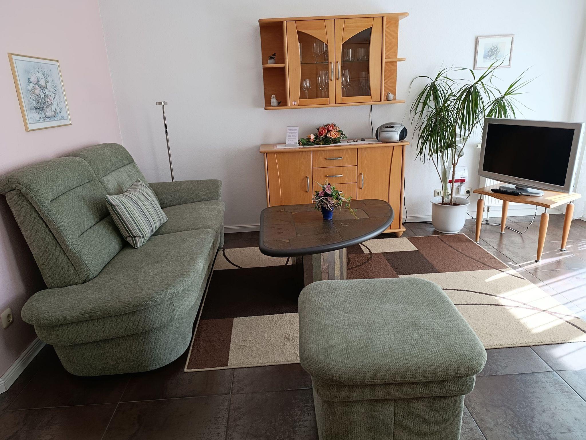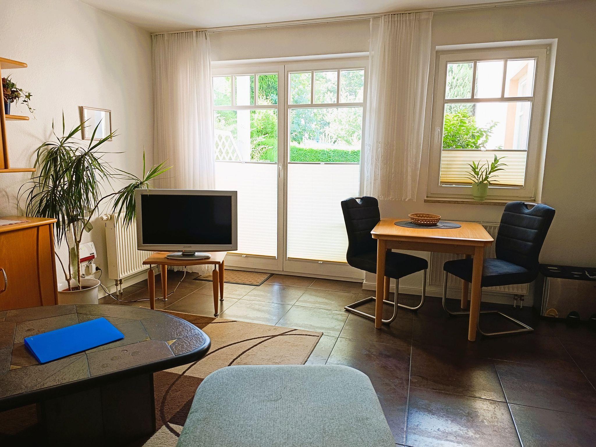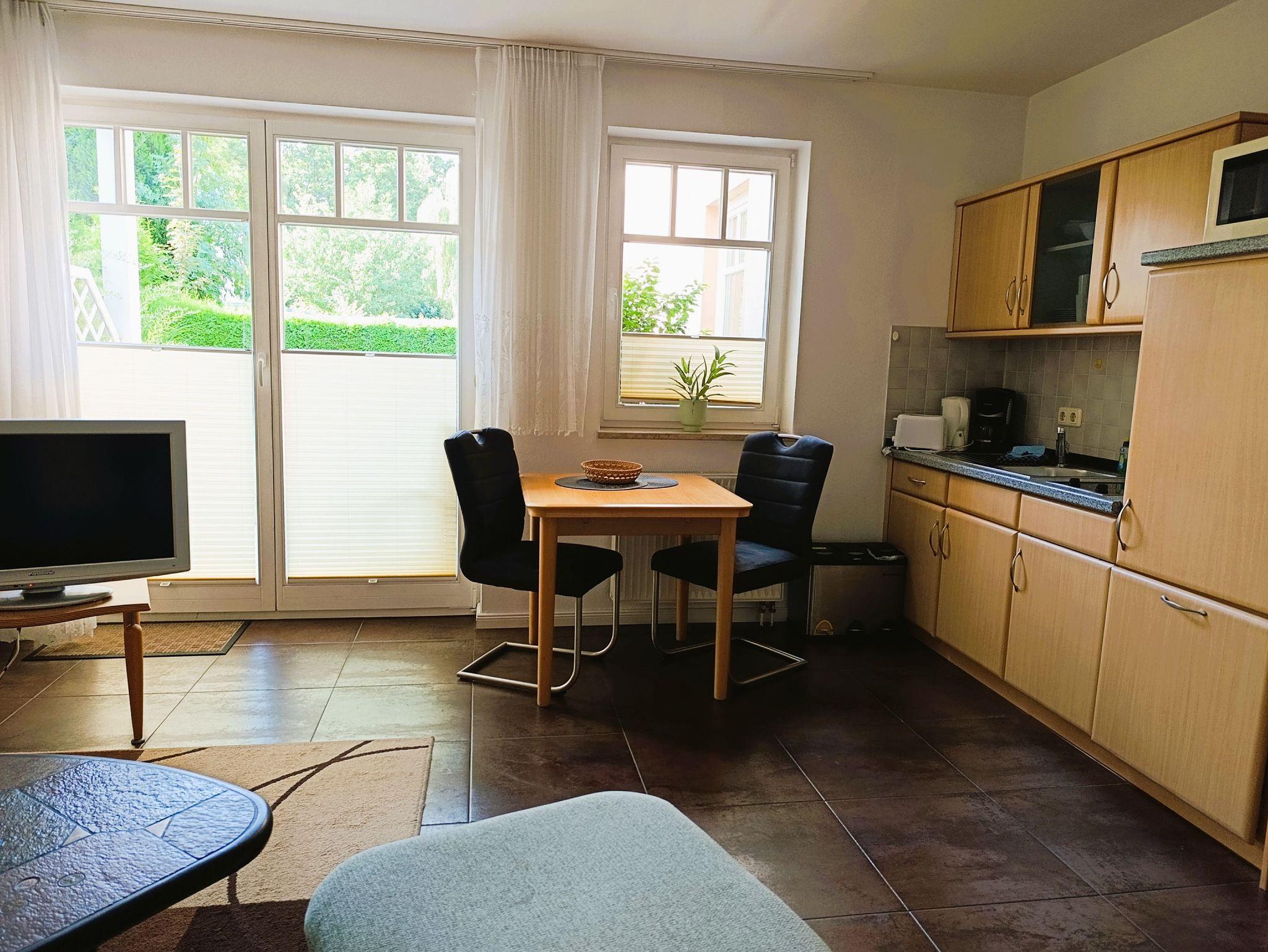 Nur 150 m vom Strand wohnen Sie in einer 2-Raum-Ferienwohnung. Die 34 qm große Wohnung liegt im Erdgeschoss. Das Wohnzimmer ist mit einer Couch, Couchtisch, Sessel, Anrichte, mit Kabel-TV (Flachbildschirm), Radio, Essbereich (Tisch und Stühle) und Küchenzeile ausgestattet. Die Terrasse mit Tisch und Stühle geht zur Südseite. Im Schlafzimmer stehen ein Doppelbett und eine kleine Anrichte. Die Küchenzeile wurde ausgestattet mit Mikrowelle, Kühlschrank, Kaffeemaschine, Zwei-Platten-Kochfeld, Toaster und Wasserkocher. Das Bad mit Dusche und WC komplettiert die Wohnung.