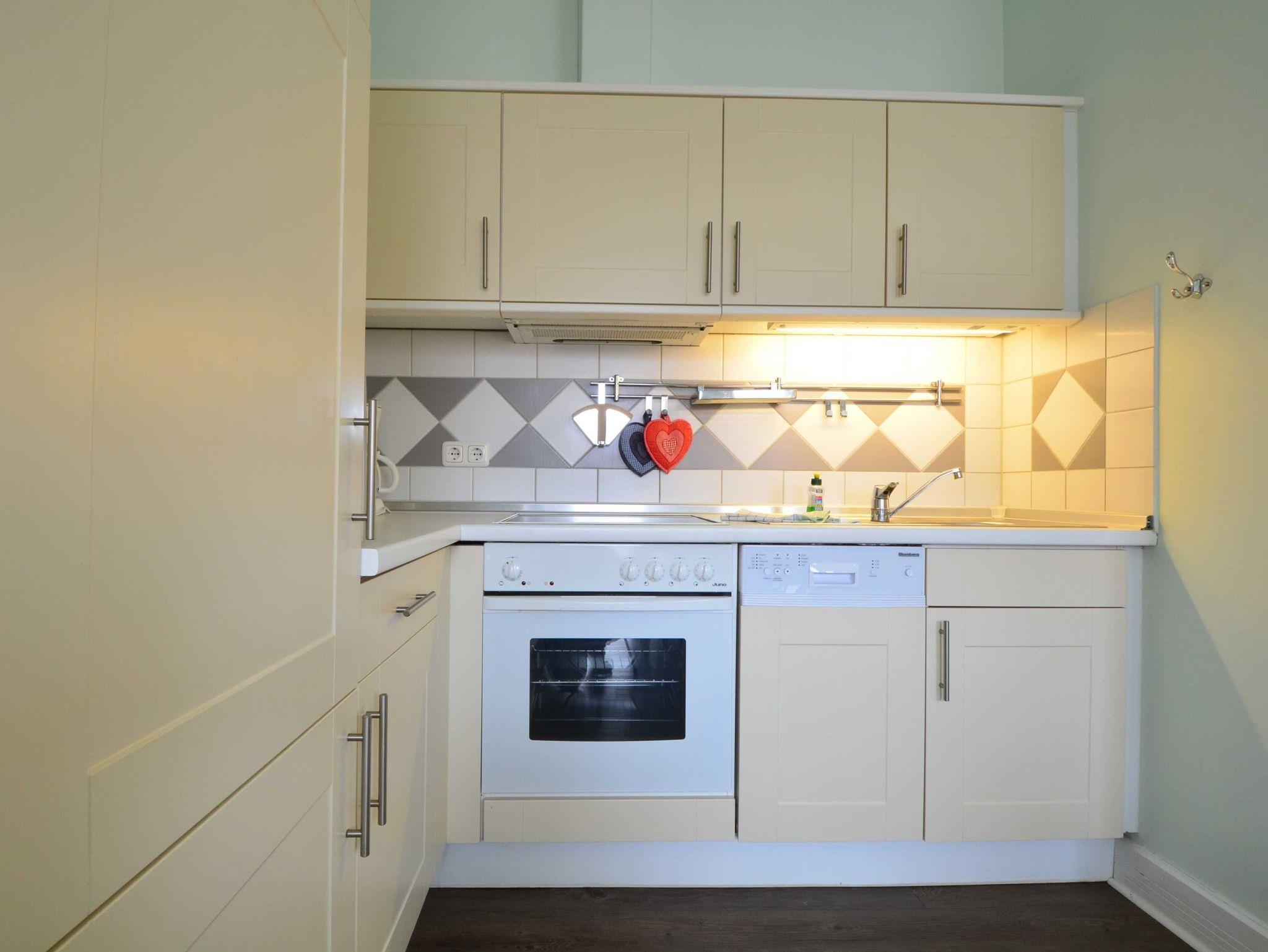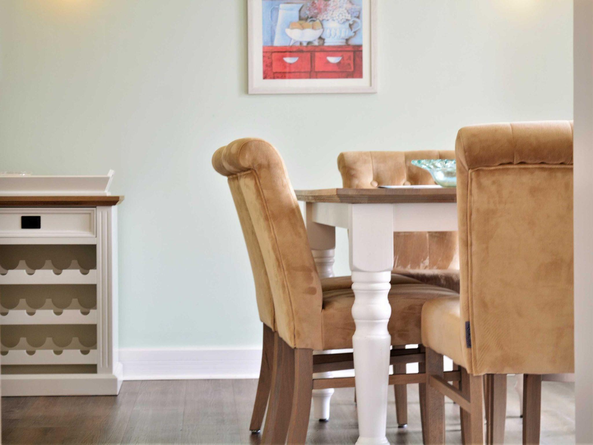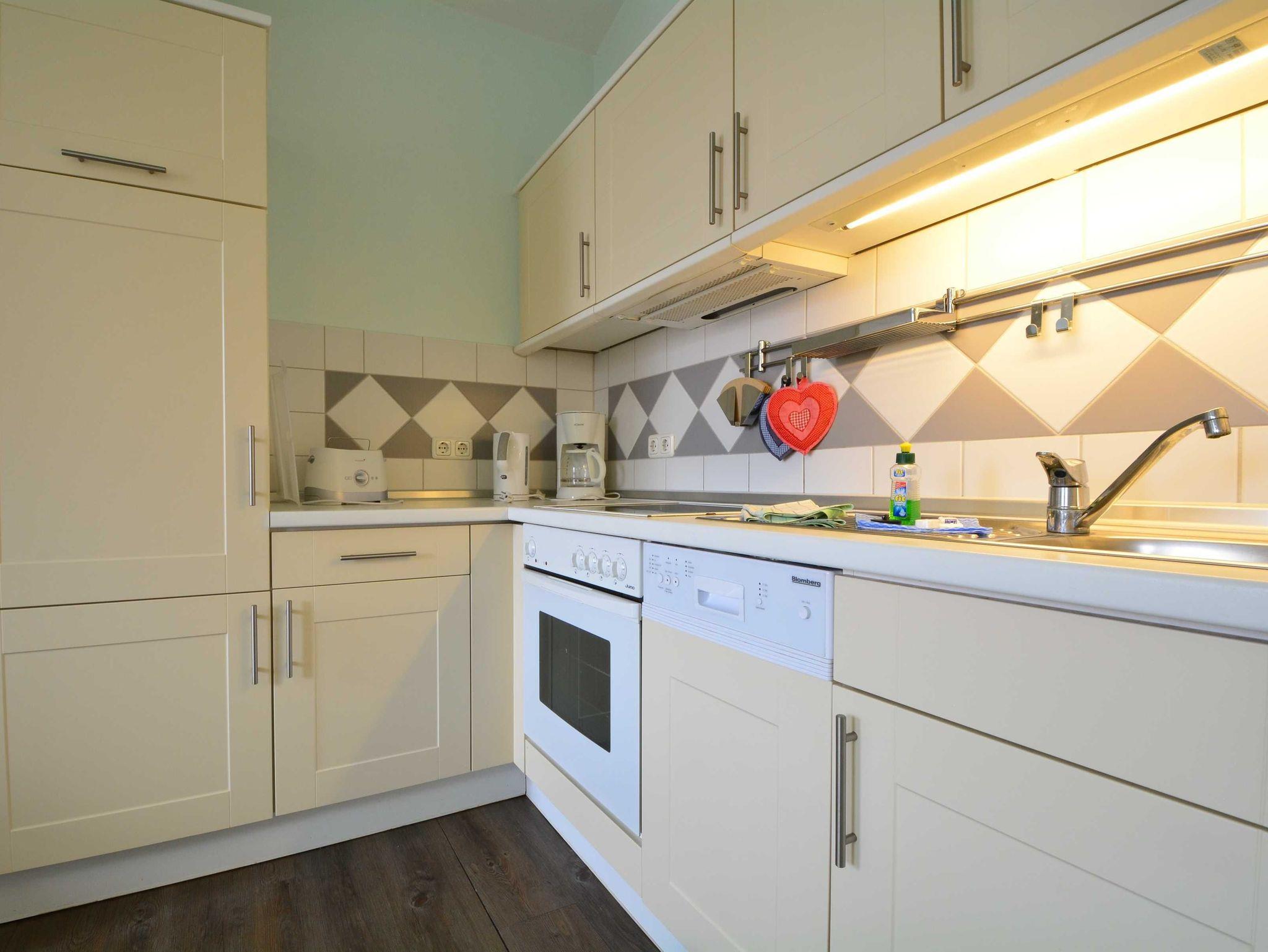 Sie können die Wohnung über 2 Türen betreten. Der Haupteingang führt Sie direkt zur offenen Wohnküche der geschmackvoll eingerichteten Ferienwohnung. Zentrales Element der Wohnküche ist der schöne große Esstisch mit 6 Stühlen. Die offene Küchenzeile bietet alle wichtigen Küchengeräte, die Sie für Ihren perfekten Urlaub an der Ostsee benötigen: Ein Backofen mit Dunstabzug und 4-Zonen-Ceranfeld, ein Geschirrspüler sowie ein Kühlschrank mit Gefrierfach befinden sich in der gut ausgestatteten Küche. Eine Kaffeemaschine, ein Wasserkocher, ein Toaster sowie genügend Geschirr und Kochutensilien komplettieren die Kücheneinrichtung. Von der Küche betreten Sie den kleineren, nach Westen ausgerichteten Balkon.