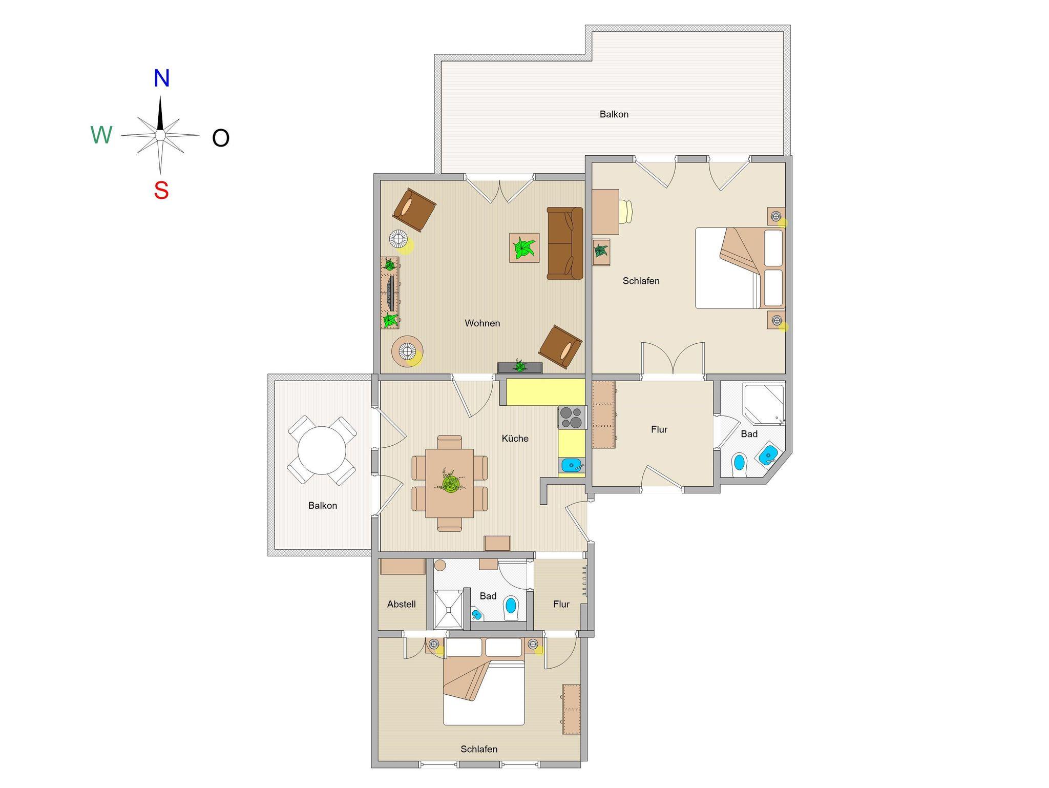 Im Anschluss an die Küche können Sie den Wohnraum betreten. Dieser ist ausgestattet mit einer großzügigen Wohnlandschaft, Stereoanlage und Flachbild-TV-Gerät. Den großzügigen nach Norden ausgerichteten Balkon können Sie von hier sowie vom anschließenden Schlafzimmer bequem erreichen. Hier können Sie den Abend nach einem erlebnisreichen Tag am Meer in Ruhe ausklingen lassen.