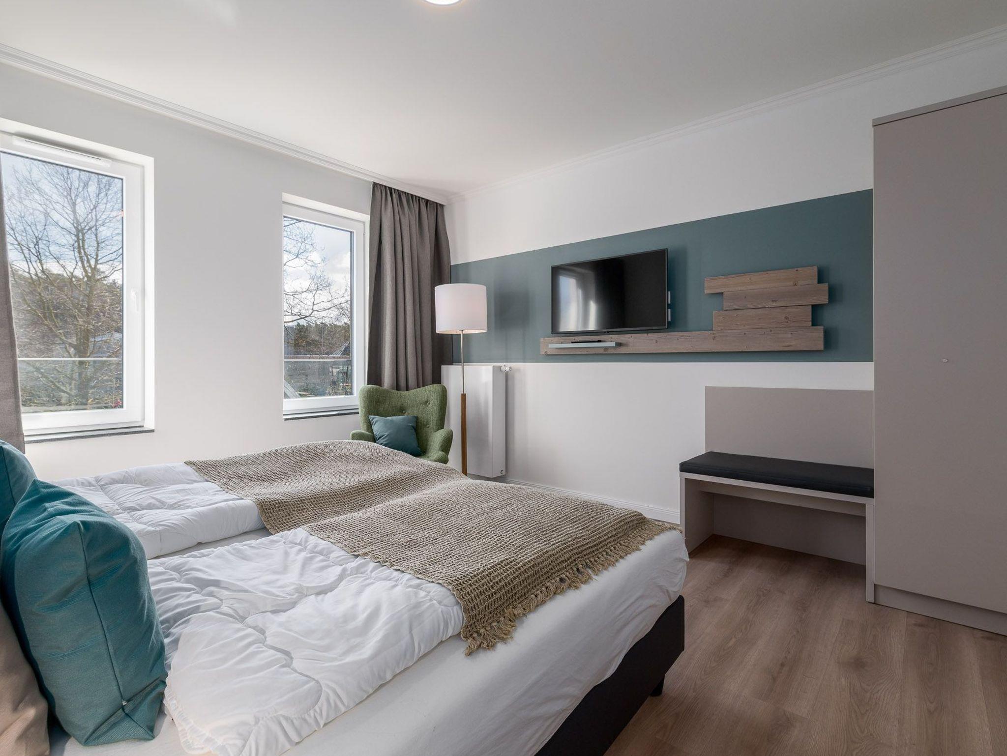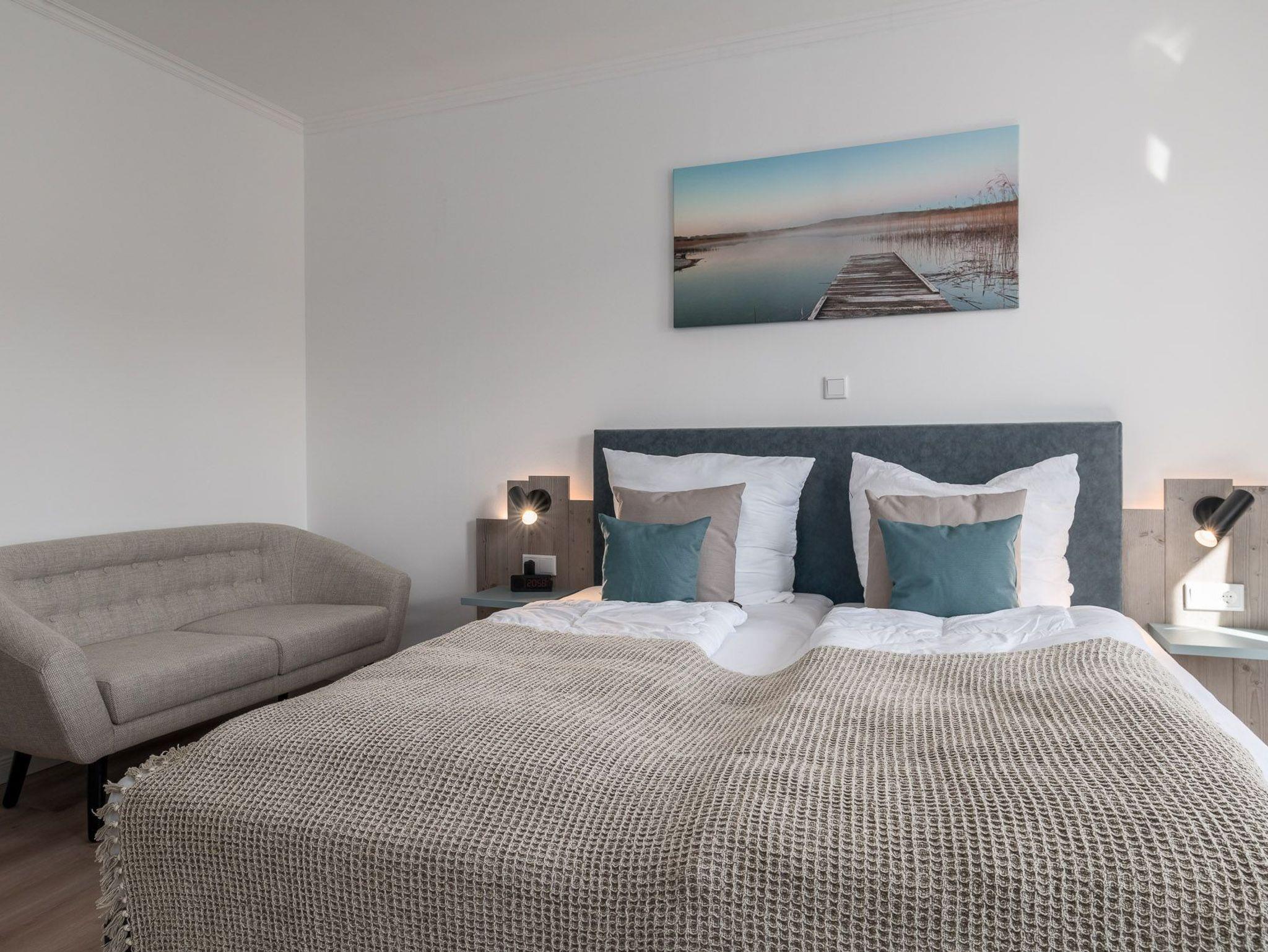 Das große Schlafzimmer verfügt über ein 1,80 x 2,00 m Bett, sowie über einen Kleiderschrank, ein 2-sitziges Sofa und ein TV-Gerät. In dem bequemen Lounge-Sessel können Sie ich entspannen oder mit einem Buch zurückziehen.