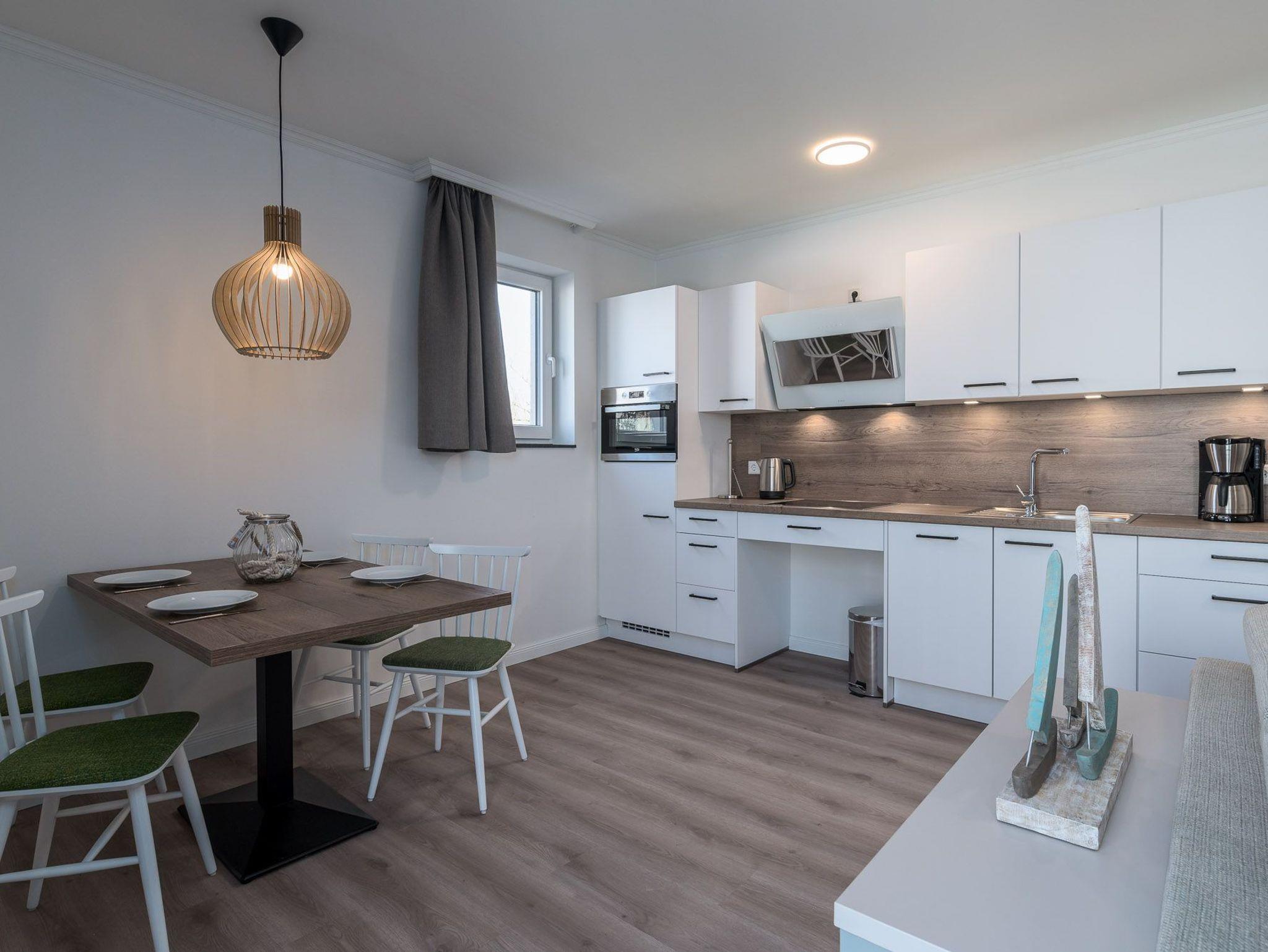 Zu Ihrem Apartment gehört ebenfalls ein großer und lichtdurchfluteter Wohn- und Essbereich mit offener Pantry-Küche. Die sehr gut ausgestattete Küche mit Geschirrspüler, 4-Platten Glaskeramik-Kochfeld, Backofen, Kühlschrank mit Gefrierfach, Kaffeemaschine, Wasserkocher sowie Toaster, macht das Zubereiten Ihrer Mahlzeiten zu einer Freude.