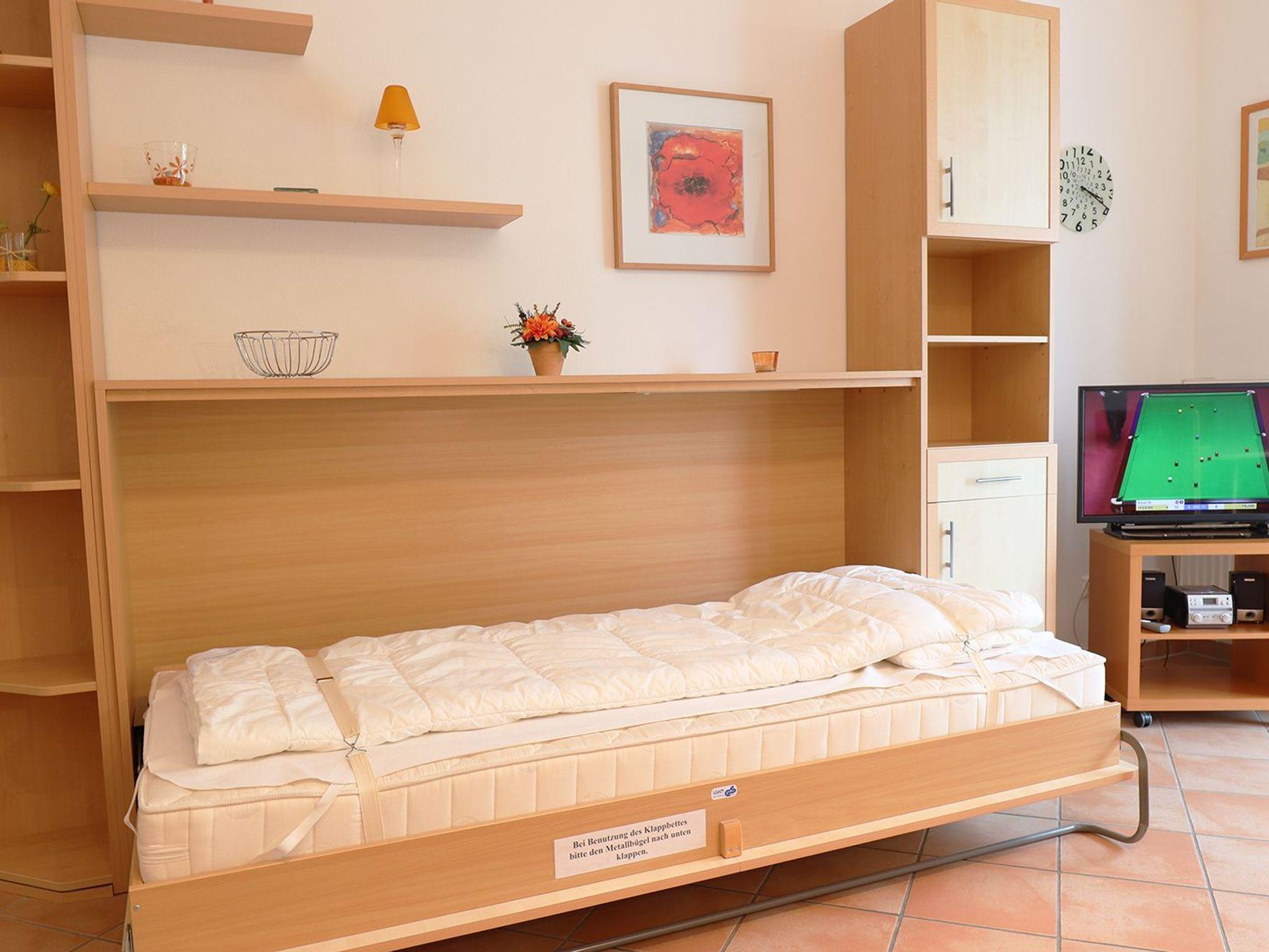 Im großen Schlafzimmer finden Sie ein Doppelbett. Hell und freundlich eingerichtet verfügt der Wohnbereich über eine Sitzgruppe und Esstisch sowie eine ausziehbare Couch und ein Schrankbett.