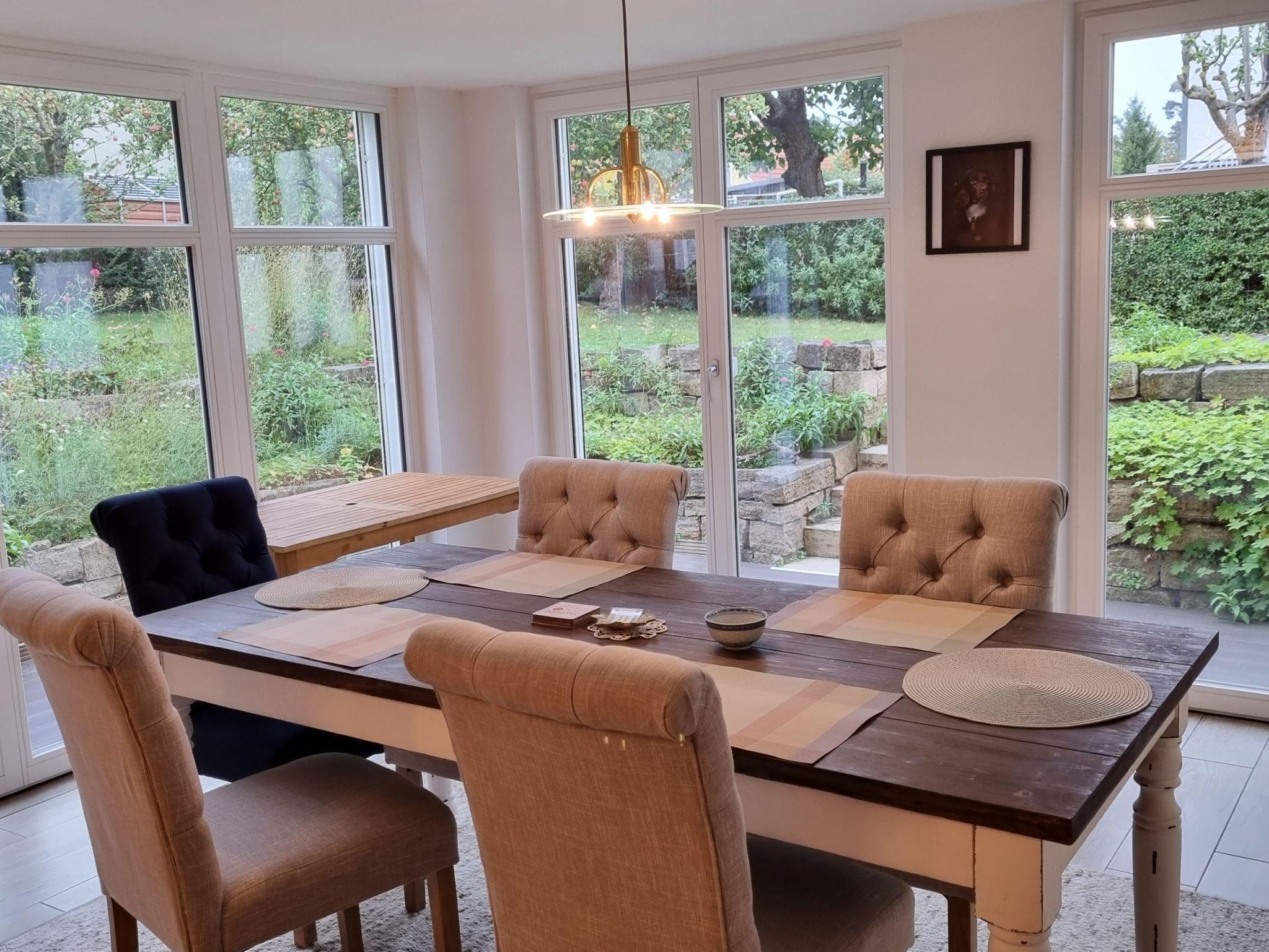 Durch die großen Glasfronten im Essbereich, blicken Sie auf Ihre Terrassen, sowie den Garten, den Sie gern nutzen dürfen.