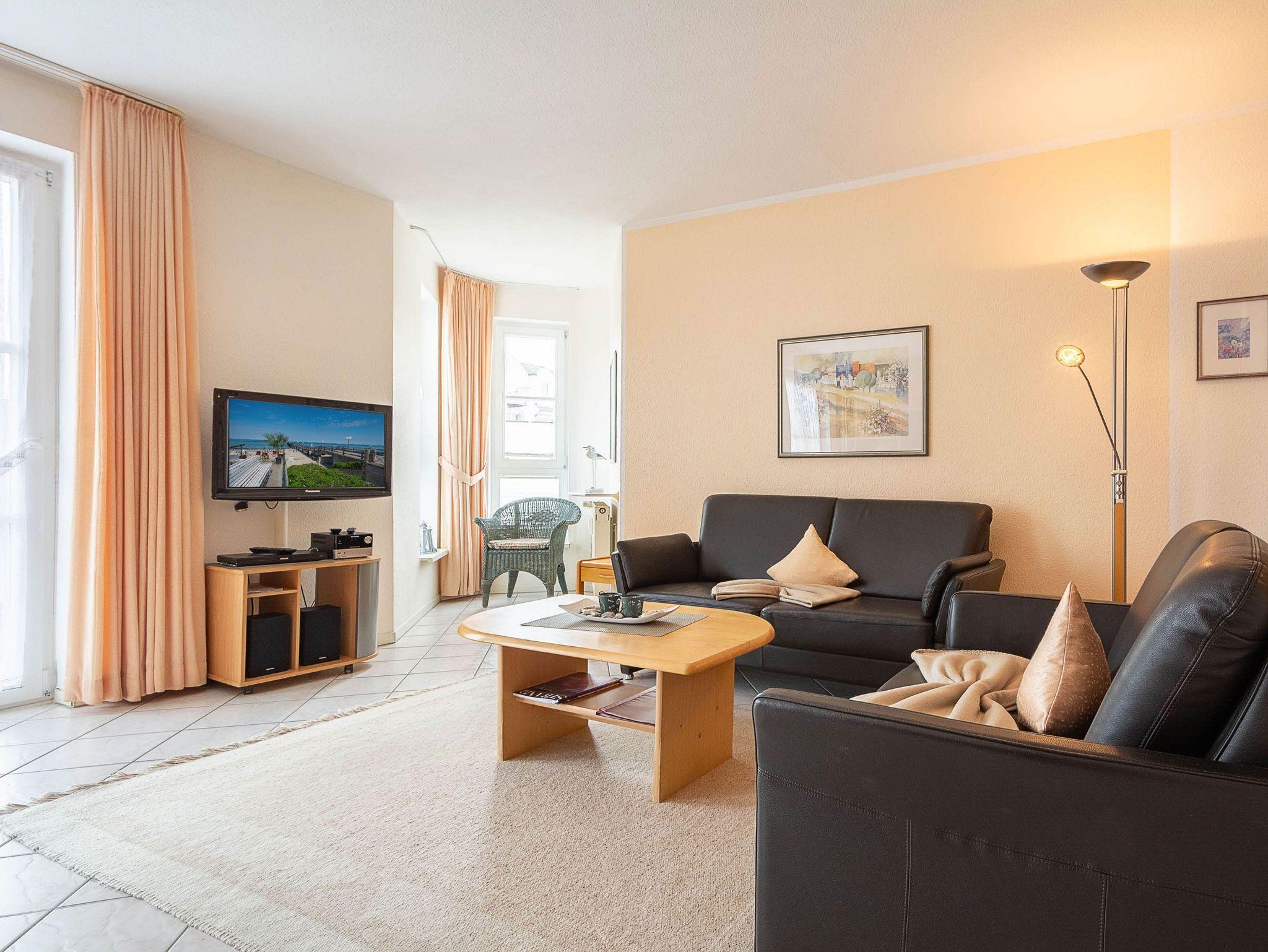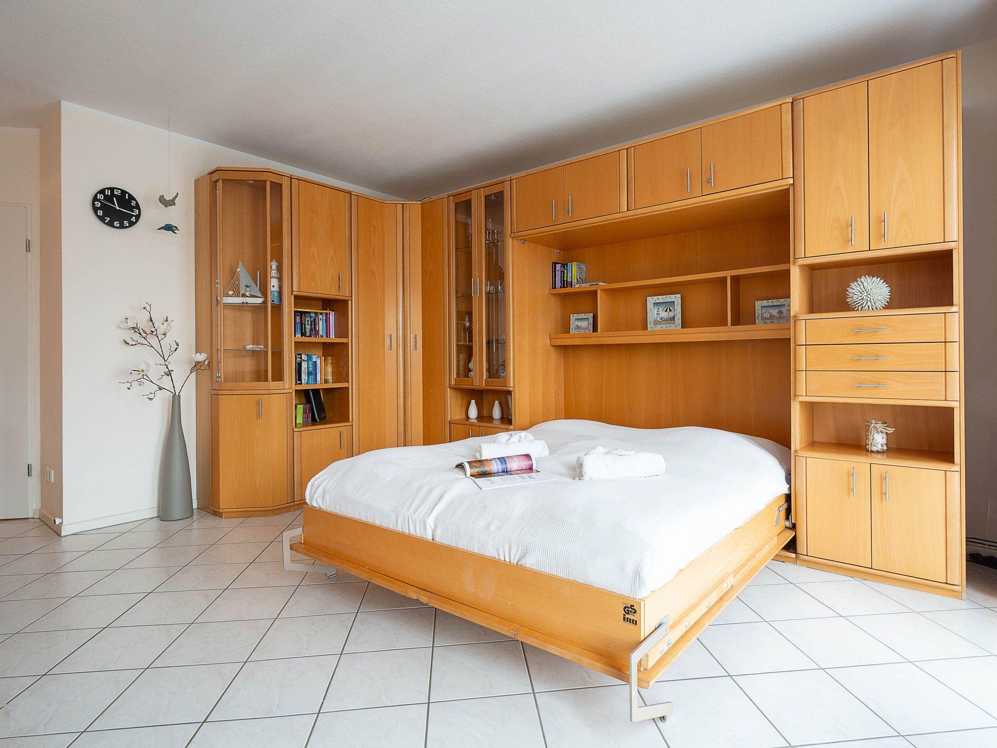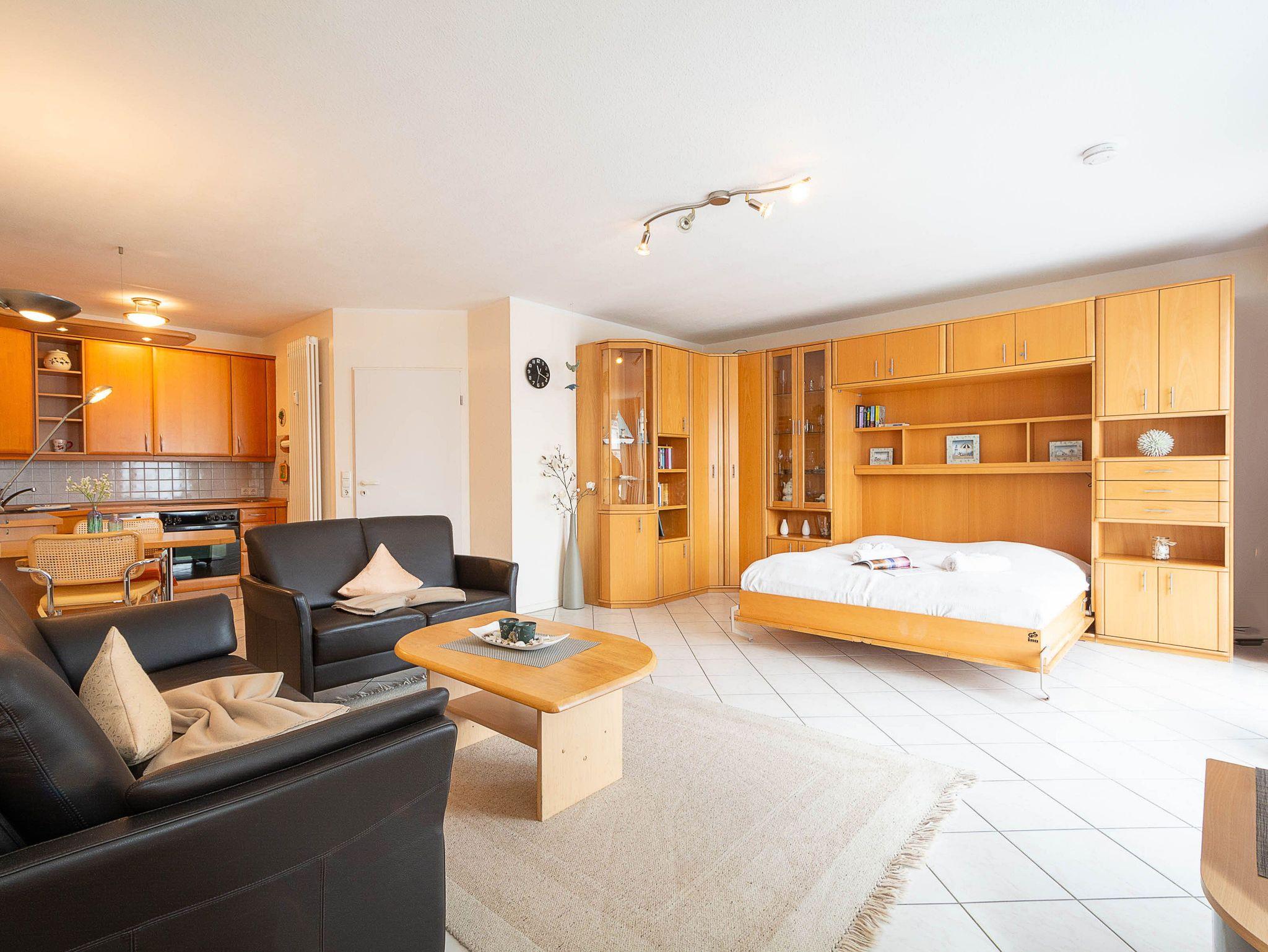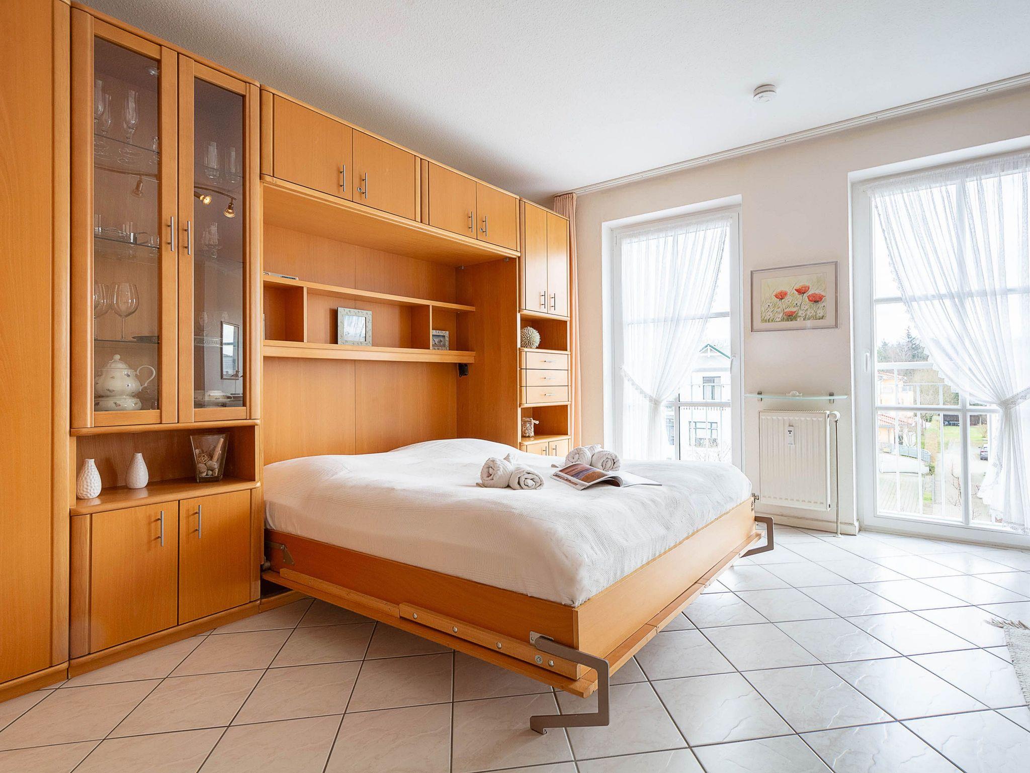 Der gemütliche Wohnbereich der Ferienwohnung ist für Sie mit einer Couchgarnitur sowie einem 32-Zoll-Flatscreen-TV und einer Stereoanlage ausgestattet. Das Schrankbett lässt sich mit wenigen, einfachen Handgriffen in einen komfortablen Schlafplatz (Liegefläche 2 x 80 cm x 200 cm) verwandeln.