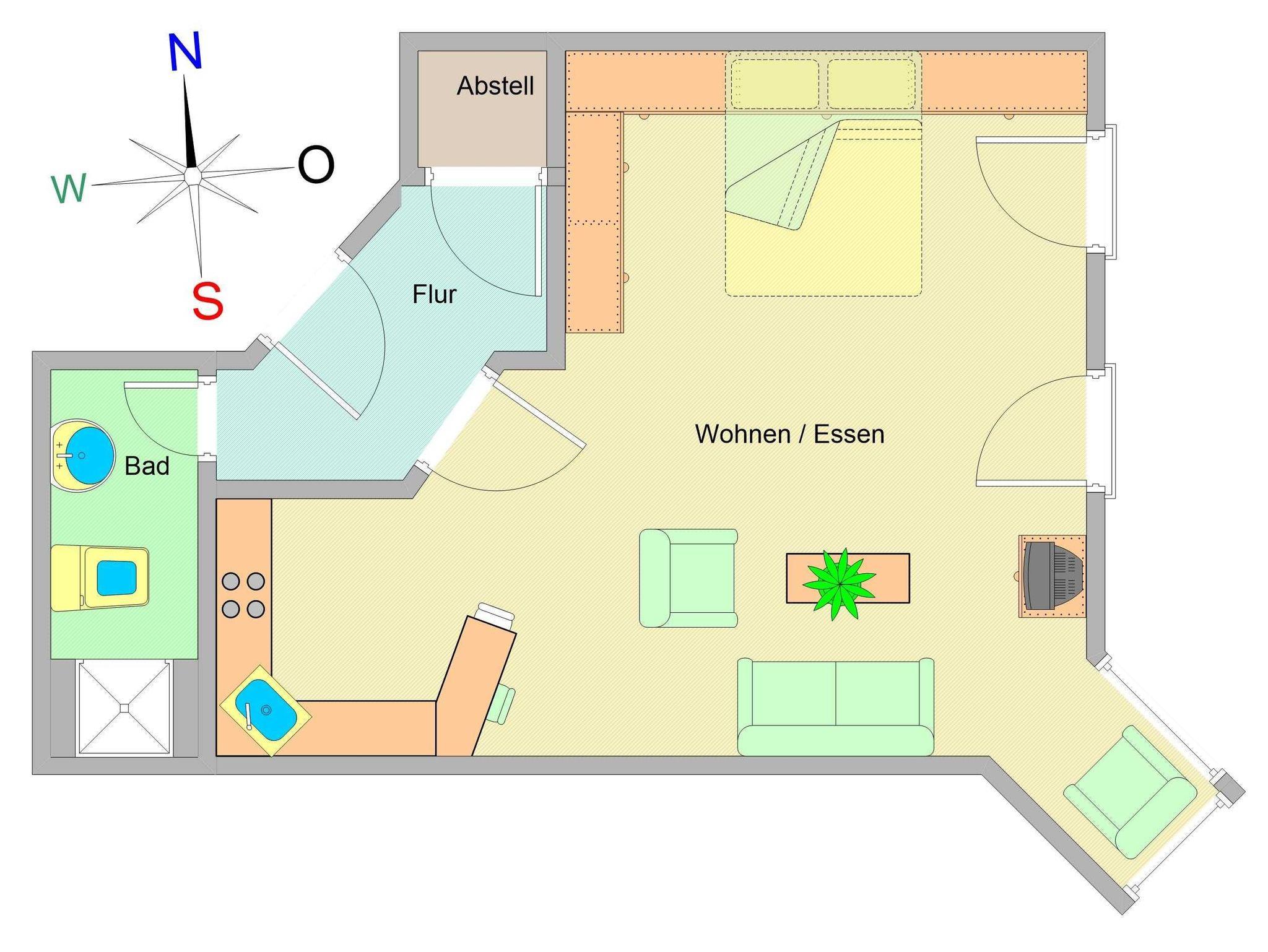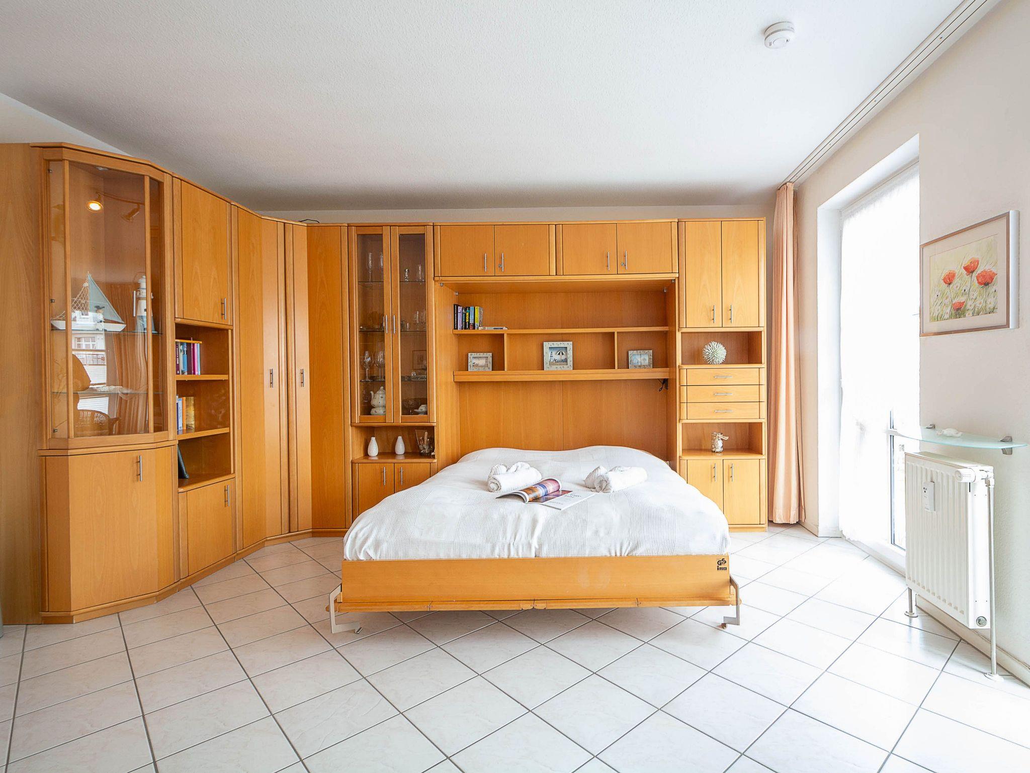 Herzlich willkommen in der Ferienwohnung Nr. 23 im Haus Olymp! Die gemütlich eingerichtete 1-Raum-Ferienwohnung befindet sich im zweiten Obergeschoss des Hauses. Auf 45 qm Wohnfläche können hier bis zu 2 Personen erholsame Urlaubstage genießen. Es empfangen Sie ein heller offener Wohn- und Schlafbereich mit einer Küchenzeile sowie ein kleiner Flurbereich, ein Duschbad und ein Abstellraum.