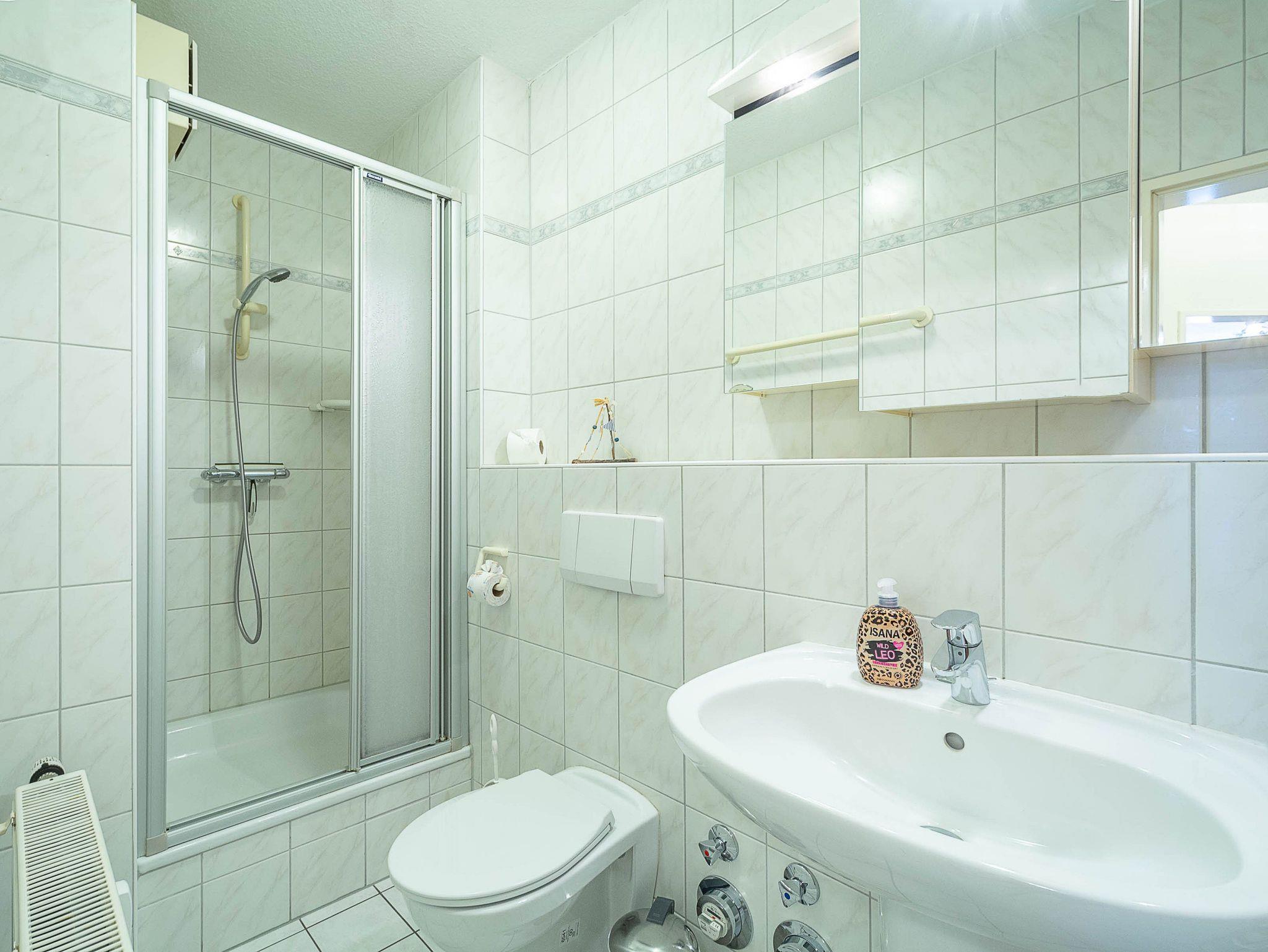 Das geflieste Bad mit einer Duschkabine, Waschbecken und WC sowie eine kleine Diele und ein Abstellraum vervollständigen das Gesamtbild dieser Wohnung.