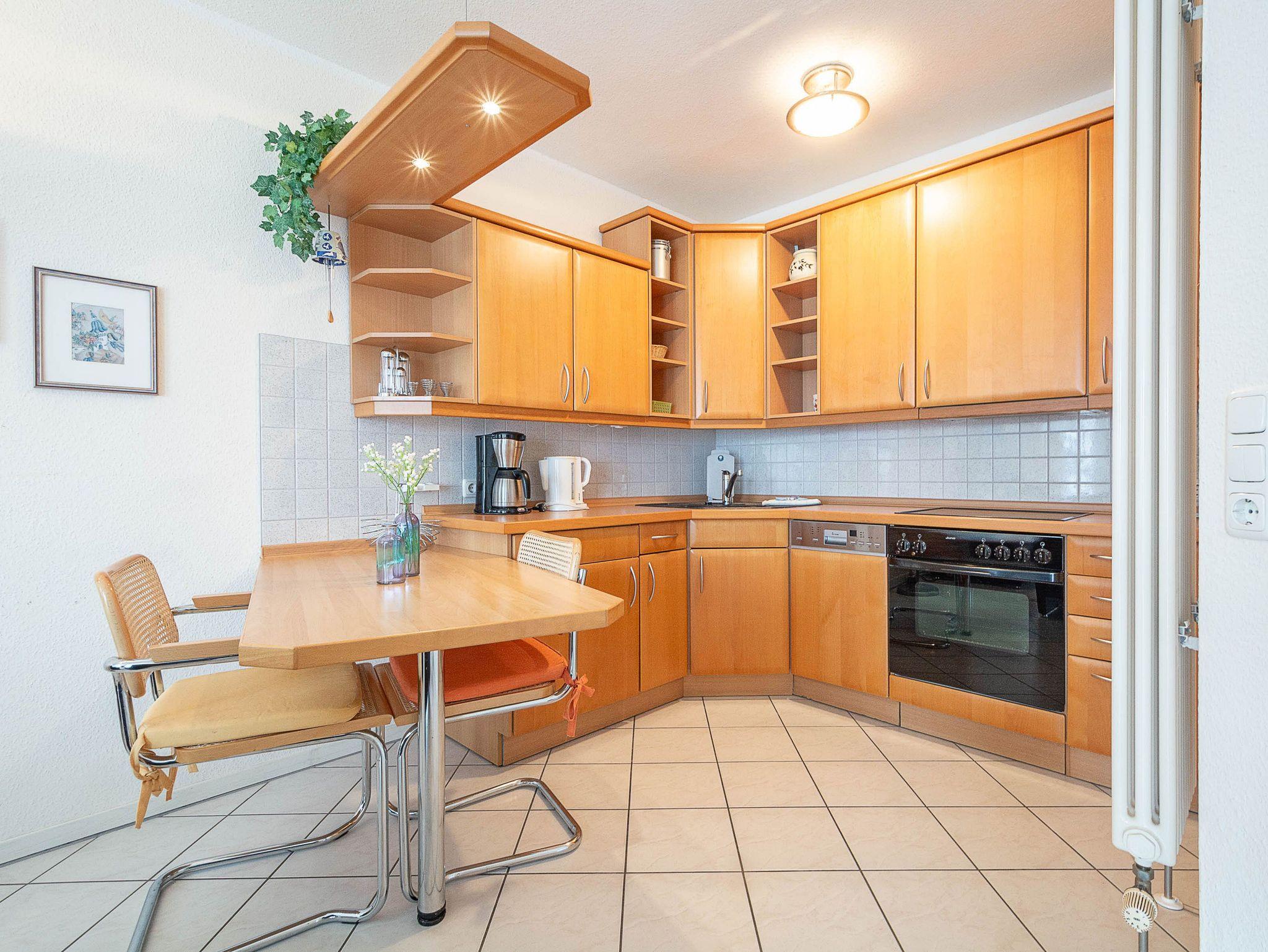 Der integrierte Essbereich bietet Ihnen reichlich Platz für gemeinsame Mahlzeiten und grenzt an die offene Küchenzeile. Die rustikal eingerichtete Küchenzeile hält für Sie alle wichtigen Küchengeräte und -utensilien bereit, die Sie für Ihr perfektes Dinner benötigen: Ein 4-Zonen-Cerankochfeld, ein Backofen, ein Geschirrspüler sowie ein Kühlschrank mit Gefrierfach befinden sich in der Küche. Eine Kaffeemaschine, ein Wasserkocher und ein Toaster sowie genügend Koch- und Essgeschirr vervollständigen die Kücheneinrichtung.