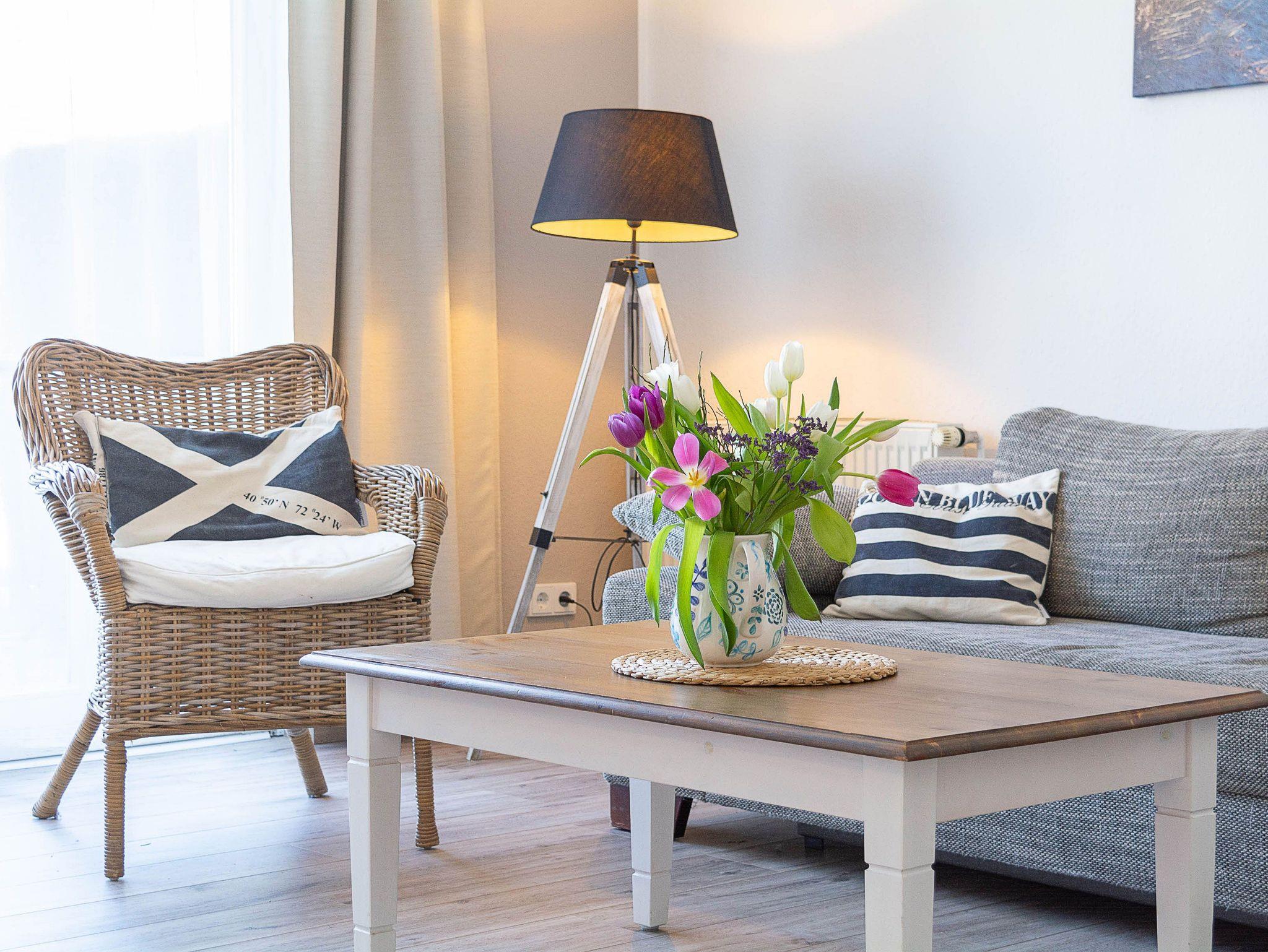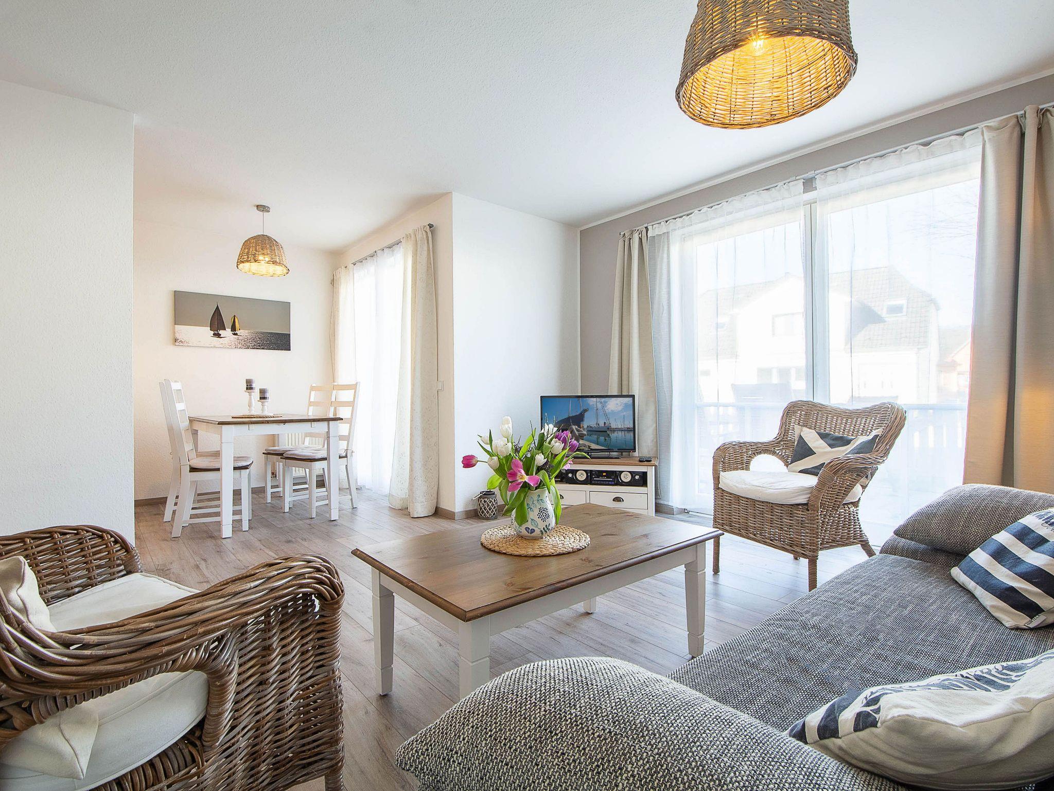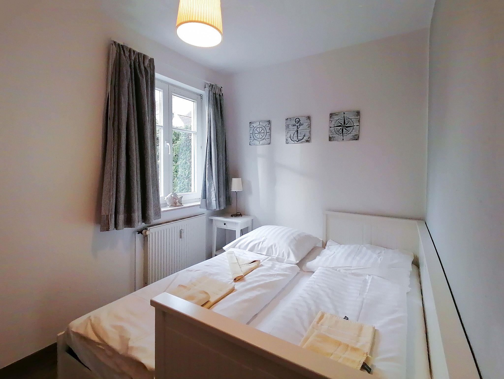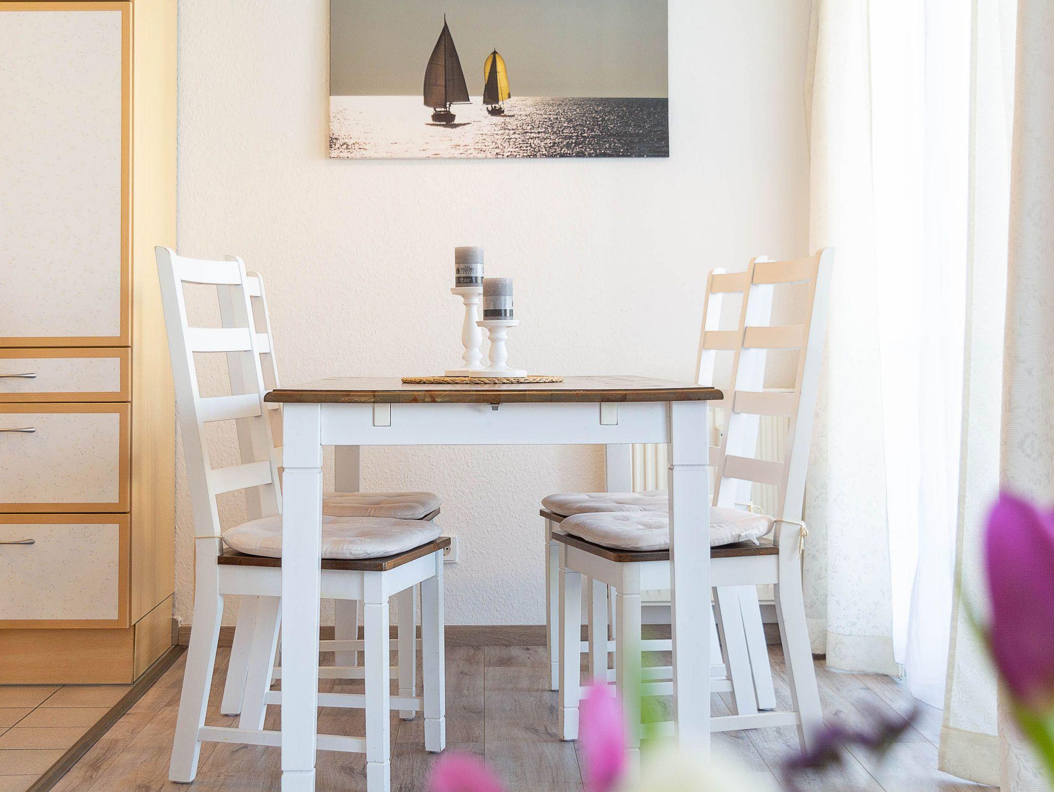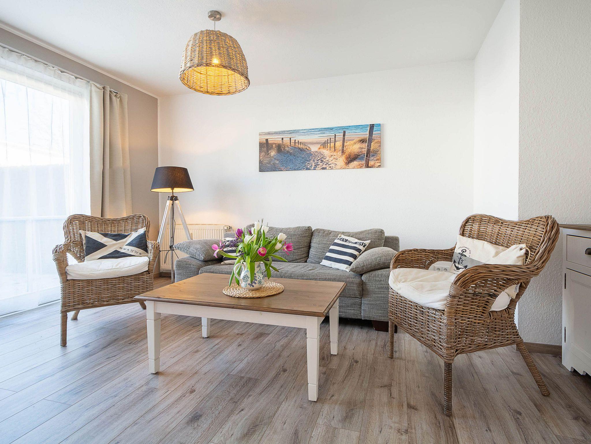 Ankommen und Wohlfühlen: Die liebevoll eingerichtete 3-Raum-Wohnung von 62qm Größe befindet sich im Erdgeschoss und empfängt Sie mit einem gemütlichen offenen Wohnbereich. Hier finden Sie eine bequeme Couchgarnitur vor sowie einen 31-Zoll-Flachbild-Fernseher und eine Musikanlage. Ein gemütlicher Esstisch mit 4 Stühlen lädt zum langen Frühstück und schönen gemeinschaftlichen Mahlzeiten ein. Von hier können Sie die möblierte West-Terrasse betreten, welche im Sommer die warme Abendsonne für Sie einfängt. Eine optisch vom Wohnbereich getrennte Küchenzeile mit allen wichtigen Küchengeräten (4-Platten-Herd, Ofen, Geschirrspüler, Mikrowelle, Kaffeemaschine und Wasserkocher, Kühlschrank mit kleinem Tiefkühlfach) schließt sich dem Sitzbereich an. Das große Schlafzimmer mit Doppelbett /180 cm x 200 cm) und großem Kleiderschrank bietet Ihnen den Zugang zur möblierten Ost-Terrasse, auf der Sie Ihr Frühstück in der Morgensonne genießen können. Im kleinen Schlafzimmer direkt nebenan befindet sich ein ausziehbares Kojenbett (80x200m / ausgezogen 160x200m) und eine Kleiderkommode. Das Bad ist ausgestattet mit Dusche und WC.
