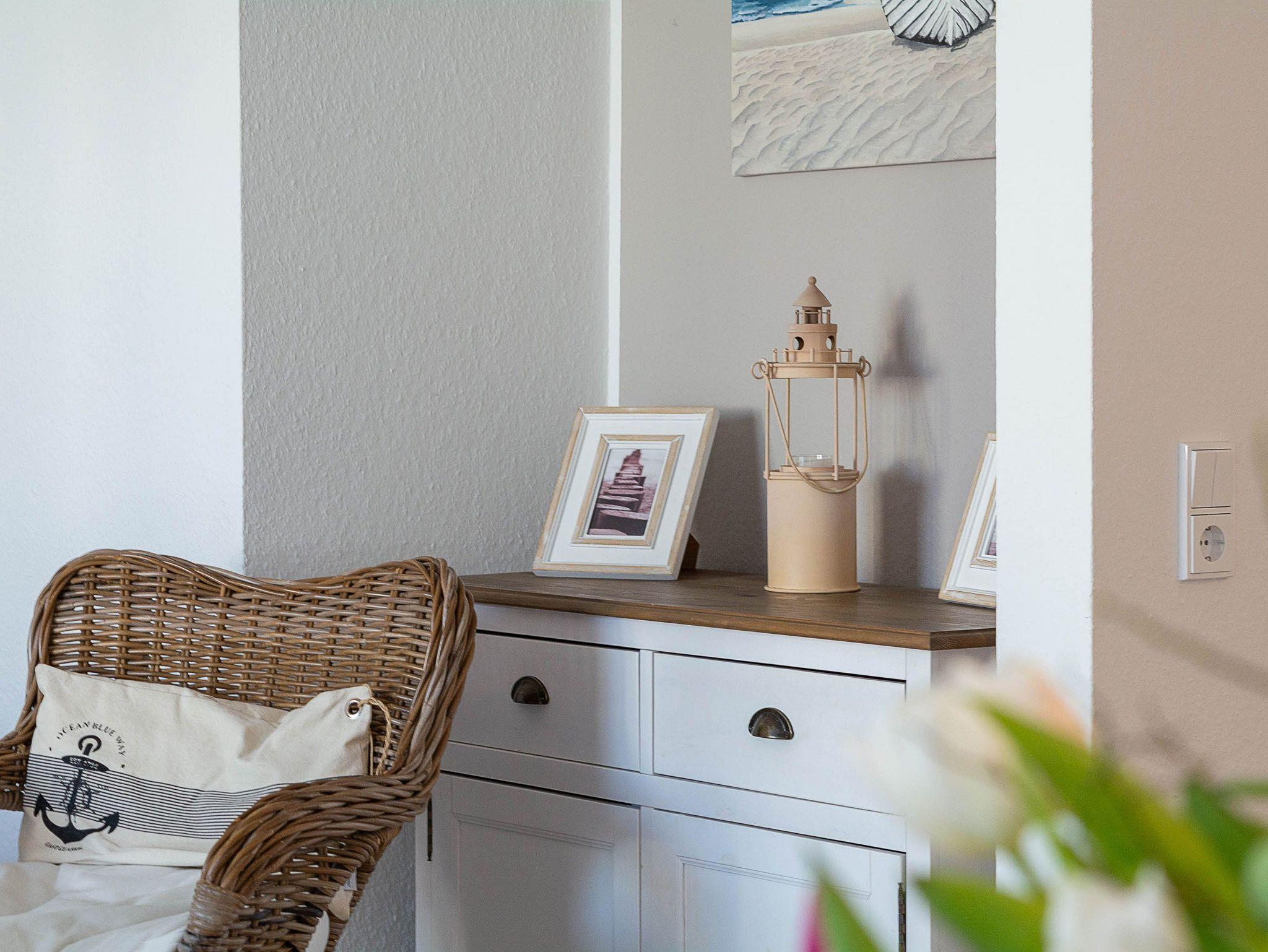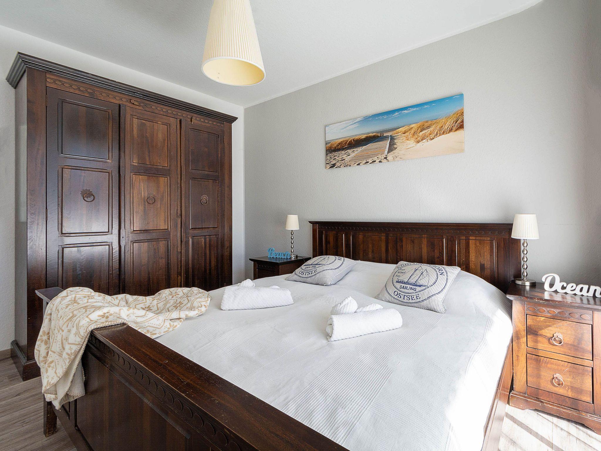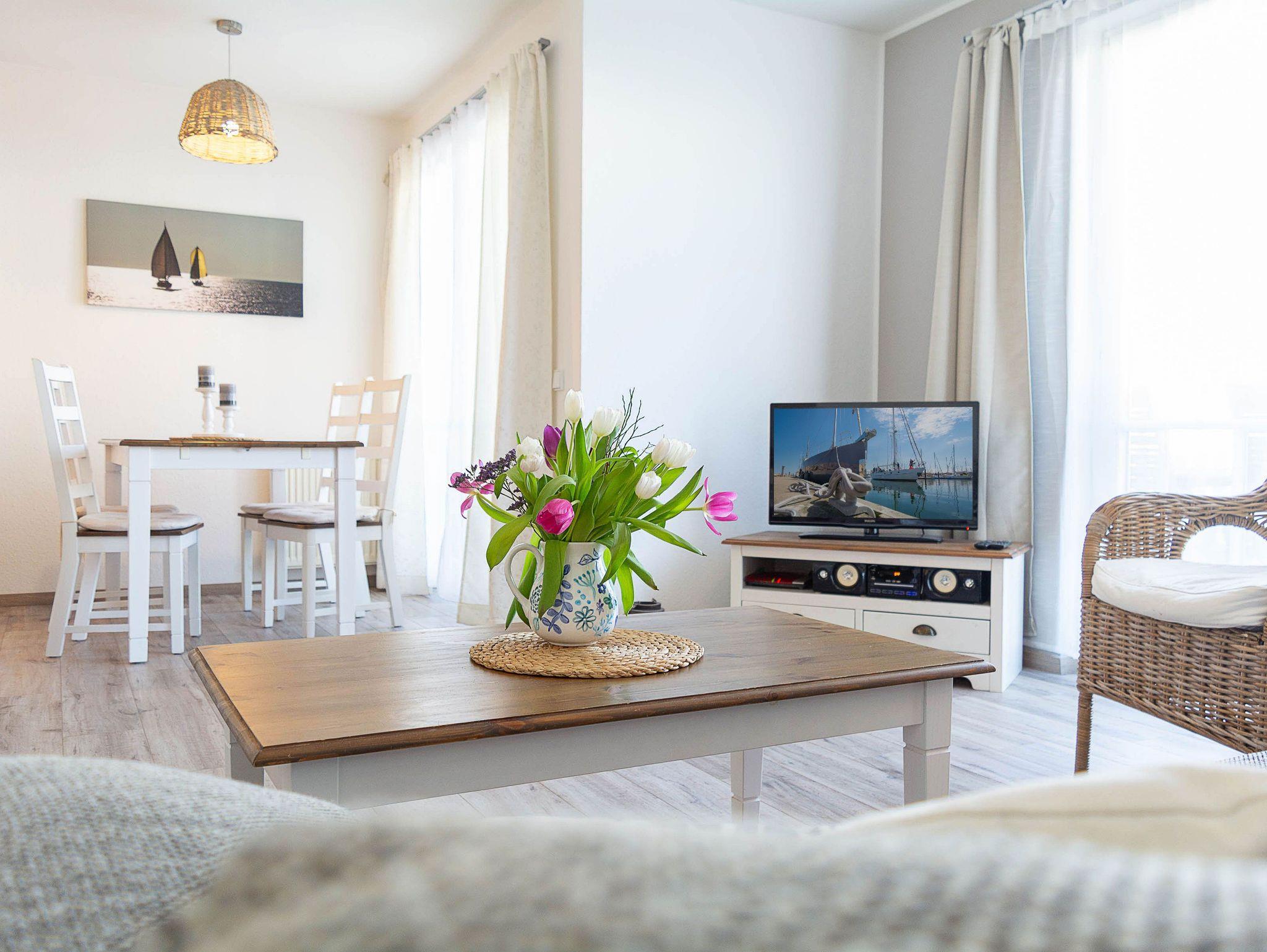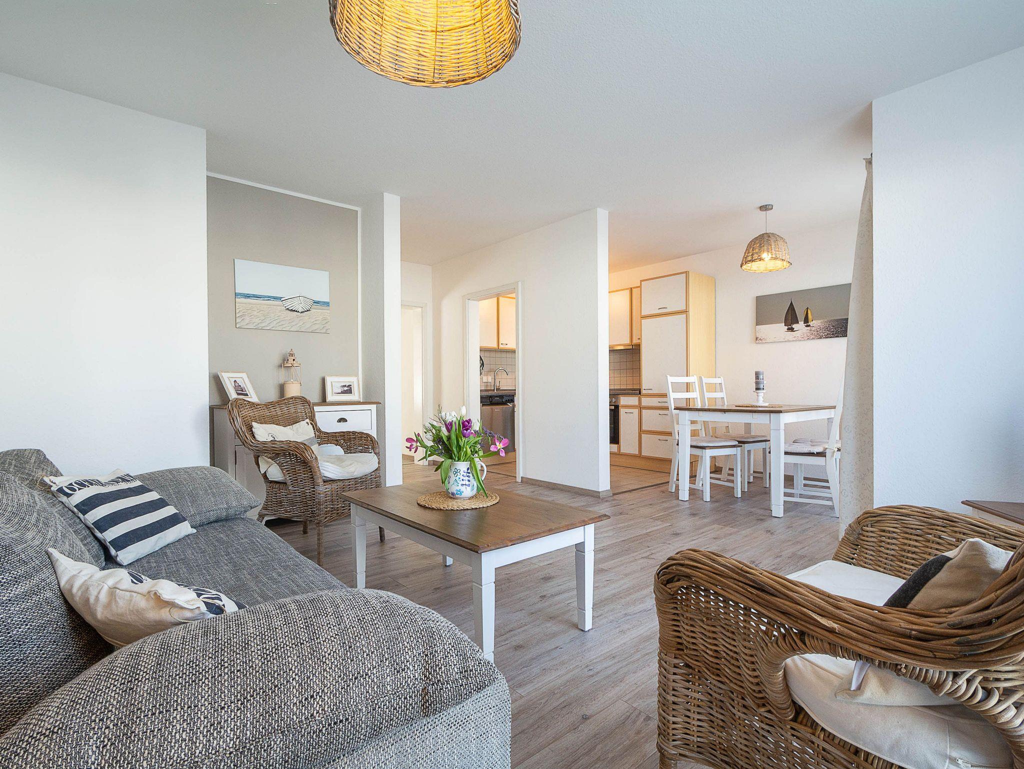 Ankommen und Wohlfühlen: Die liebevoll eingerichtete 3-Raum-Wohnung von 62qm Größe befindet sich im Erdgeschoss und empfängt Sie mit einem gemütlichen offenen Wohnbereich. Hier finden Sie eine bequeme Couchgarnitur vor sowie einen 31-Zoll-Flachbild-Fernseher und eine Musikanlage. Ein gemütlicher Esstisch mit 4 Stühlen lädt zum langen Frühstück und schönen gemeinschaftlichen Mahlzeiten ein. Von hier können Sie die möblierte West-Terrasse betreten, welche im Sommer die warme Abendsonne für Sie einfängt. Eine optisch vom Wohnbereich getrennte Küchenzeile mit allen wichtigen Küchengeräten (4-Platten-Herd, Ofen, Geschirrspüler, Mikrowelle, Kaffeemaschine und Wasserkocher, Kühlschrank mit kleinem Tiefkühlfach) schließt sich dem Sitzbereich an. Das große Schlafzimmer mit Doppelbett /180 cm x 200 cm) und großem Kleiderschrank bietet Ihnen den Zugang zur möblierten Ost-Terrasse, auf der Sie Ihr Frühstück in der Morgensonne genießen können. Im kleinen Schlafzimmer direkt nebenan befindet sich ein ausziehbares Kojenbett (80x200m / ausgezogen 160x200m) und eine Kleiderkommode. Das Bad ist ausgestattet mit Dusche und WC.