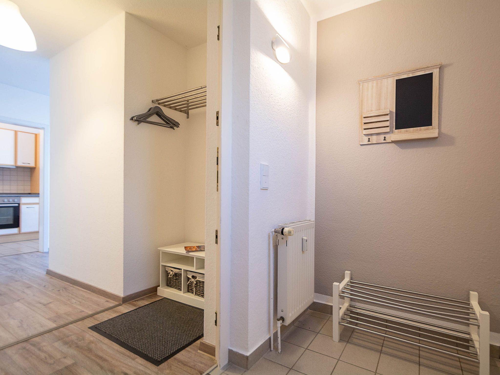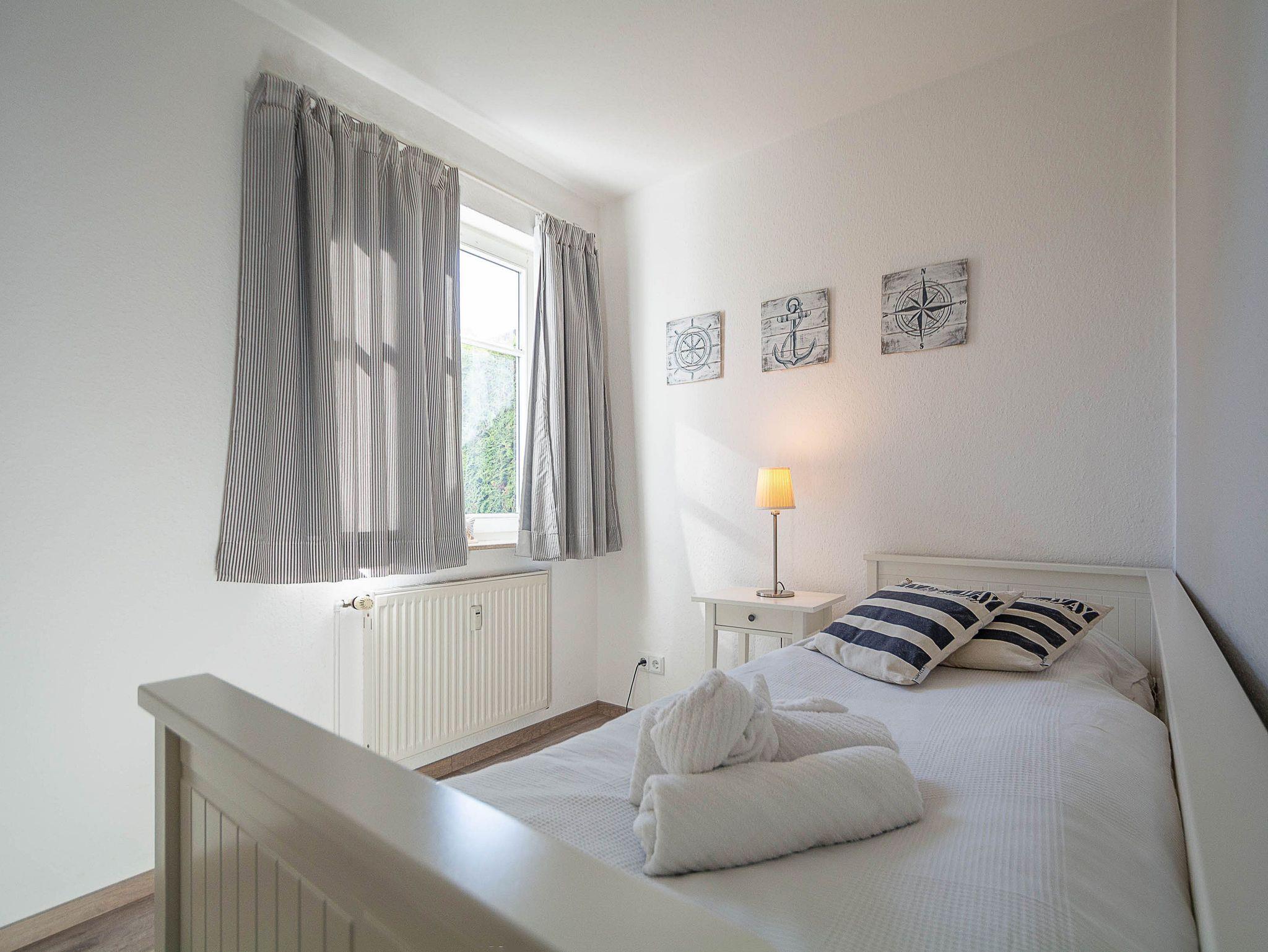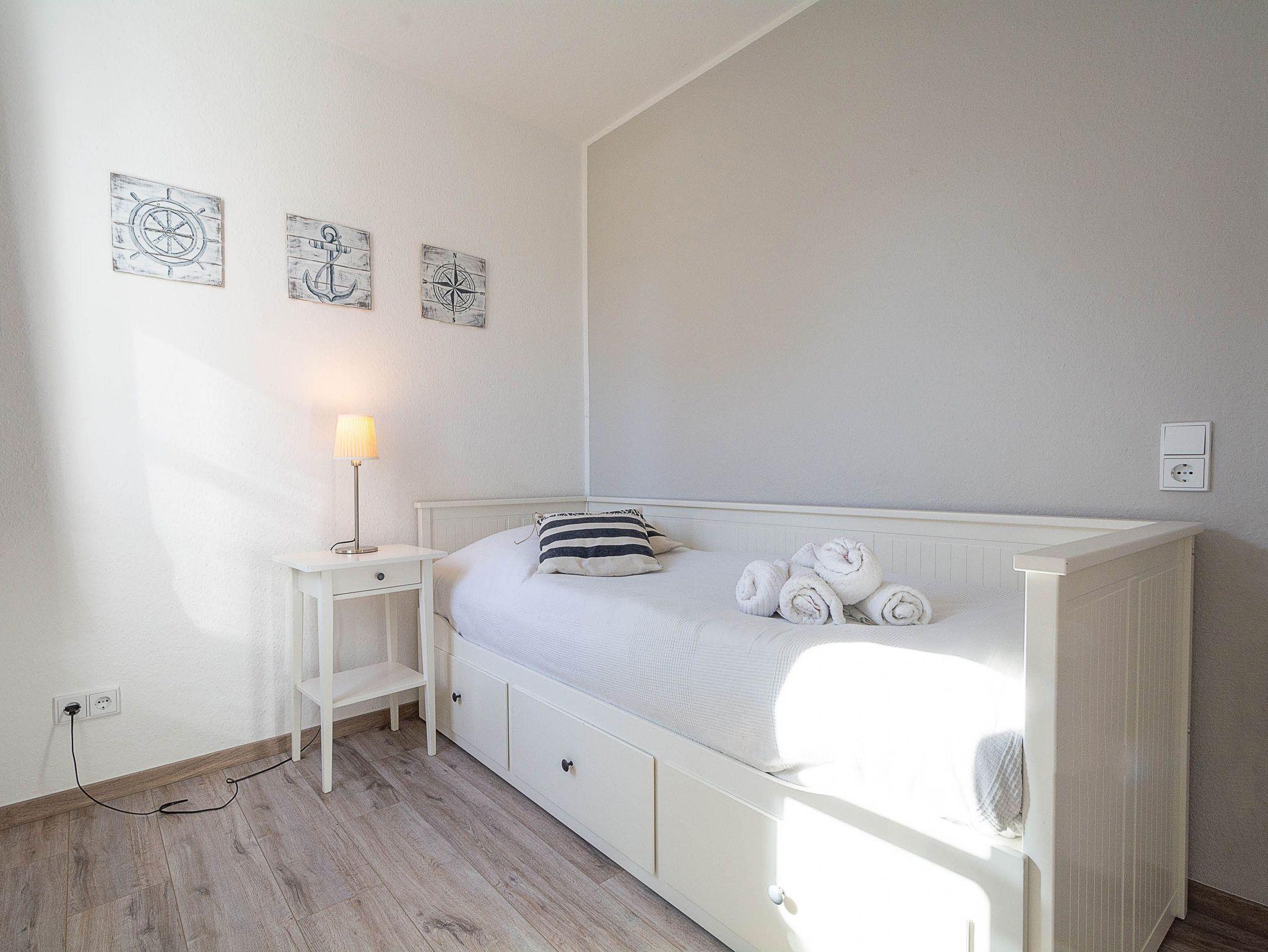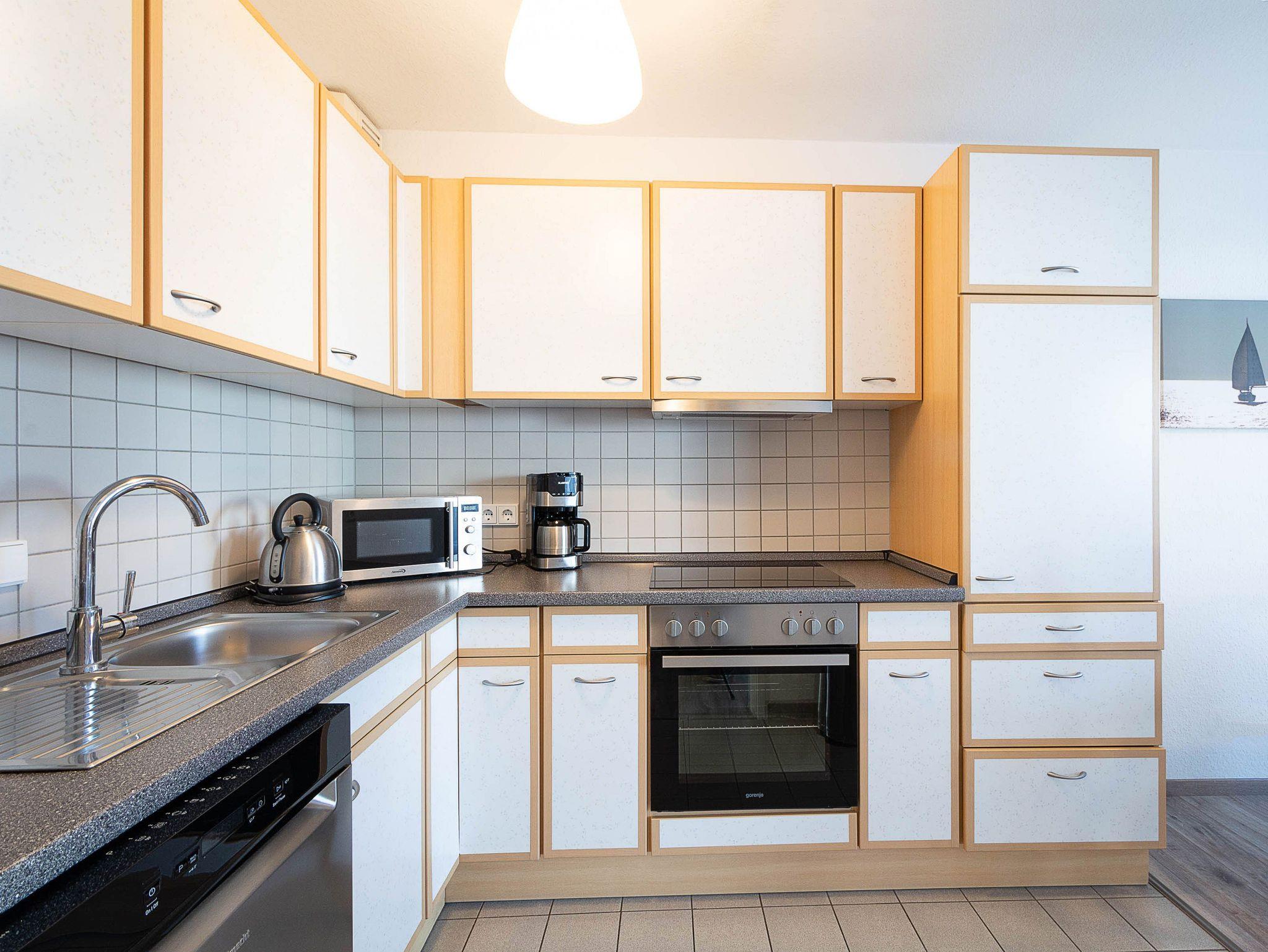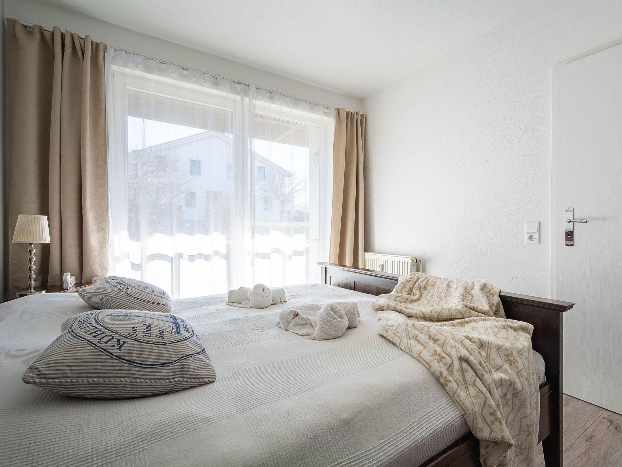 Ankommen und Wohlfühlen: Die liebevoll eingerichtete 3-Raum-Wohnung von 62qm Größe befindet sich im Erdgeschoss und empfängt Sie mit einem gemütlichen offenen Wohnbereich. Hier finden Sie eine bequeme Couchgarnitur vor sowie einen 31-Zoll-Flachbild-Fernseher und eine Musikanlage. Ein gemütlicher Esstisch mit 4 Stühlen lädt zum langen Frühstück und schönen gemeinschaftlichen Mahlzeiten ein. Von hier können Sie die möblierte West-Terrasse betreten, welche im Sommer die warme Abendsonne für Sie einfängt. Eine optisch vom Wohnbereich getrennte Küchenzeile mit allen wichtigen Küchengeräten (4-Platten-Herd, Ofen, Geschirrspüler, Mikrowelle, Kaffeemaschine und Wasserkocher, Kühlschrank mit kleinem Tiefkühlfach) schließt sich dem Sitzbereich an. Das große Schlafzimmer mit Doppelbett /180 cm x 200 cm) und großem Kleiderschrank bietet Ihnen den Zugang zur möblierten Ost-Terrasse, auf der Sie Ihr Frühstück in der Morgensonne genießen können. Im kleinen Schlafzimmer direkt nebenan befindet sich ein ausziehbares Kojenbett (80x200m / ausgezogen 160x200m) und eine Kleiderkommode. Das Bad ist ausgestattet mit Dusche und WC.