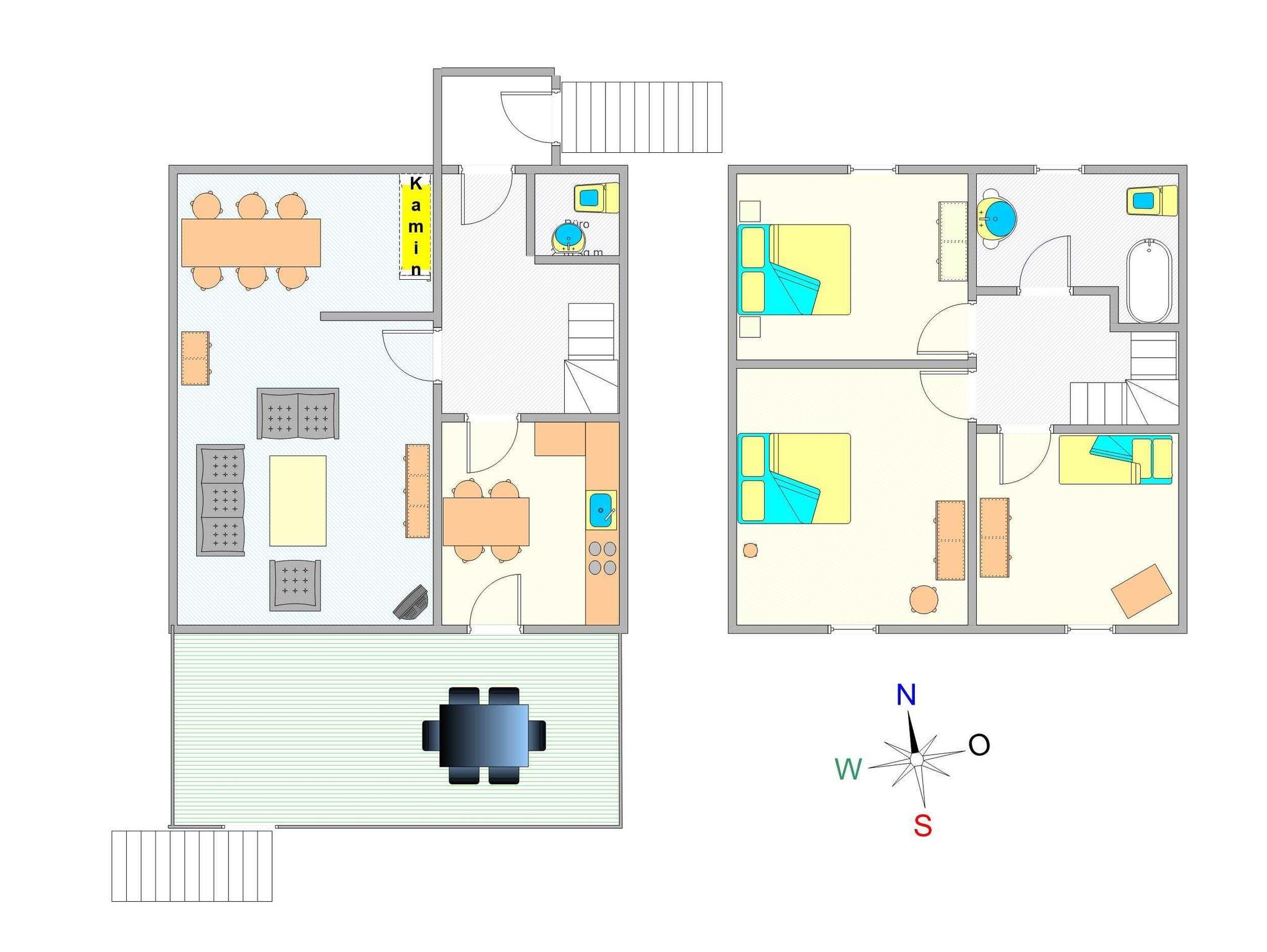 Sie wohnen in einem ca. 120 m² großen Ferienhaus, das über 2 Etagen verläuft. In der 1. Etage befindet sich der große Wohnraum mit einem geräumigen Essbereich und die separate moderne Küche mit 4-Platten Ceranfeld, Backofen, Geschirrspüler, Kühlschrank etc.. Von der Küche gelangen Sie auf den großzügigen Balkon und haben einen fantastischen Blick auf eine angrenzende Koppel. Auf dieser Etage befindet sich ebenfalls ein Gäste-WC. In der 2. Etage befinden sich die 3 Schlafräume (2x ein Doppelbett, 1x ein Kojenbett) und das Bad mit Badewanne, Dusche und WC, was das Gesamtbild dieses Hauses vervollständigen.