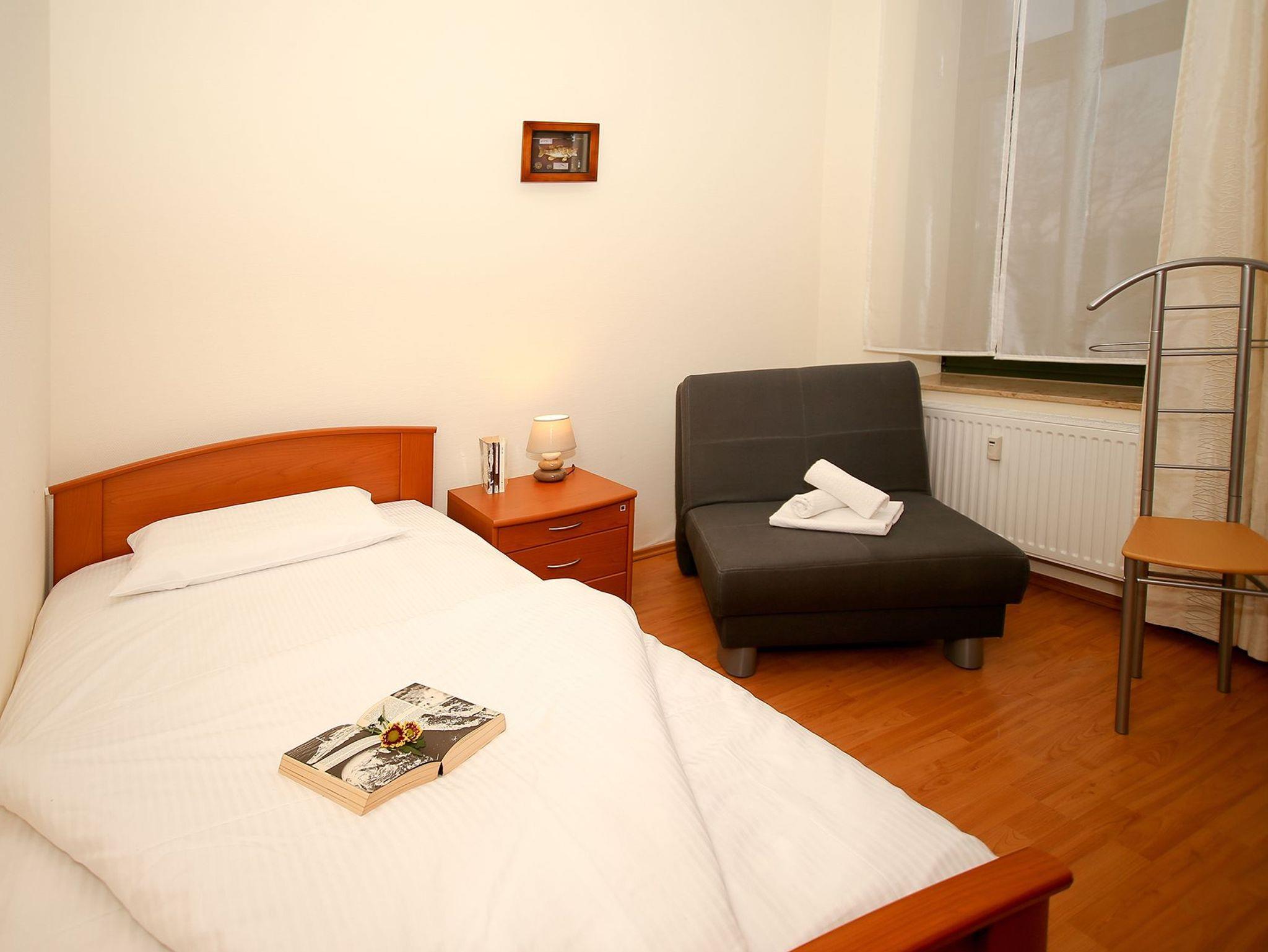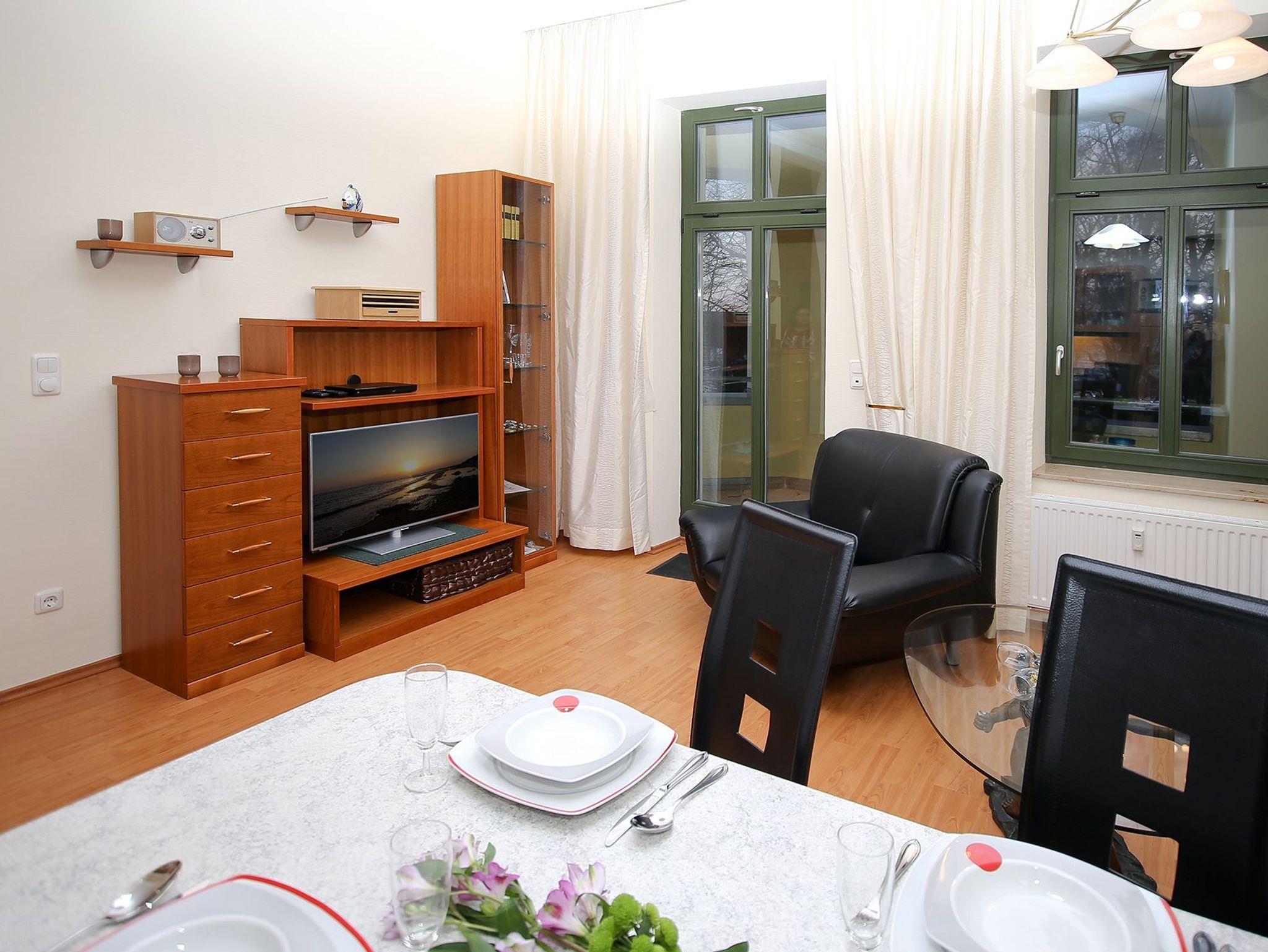 Die Wohnung liegt im 1.OG des Hauses mit einer Loggia sowie einem Balkon zur Nordseite und einem Balkon zur Westseite. Sie bietet für 4 Personen ein Schlafzimmer mit Doppelbett und ein Schlafzimmer (durch einen Raumteiler vom Wohnbereich getrennt) mit Einzelbett sowie einem Schlafsessel.