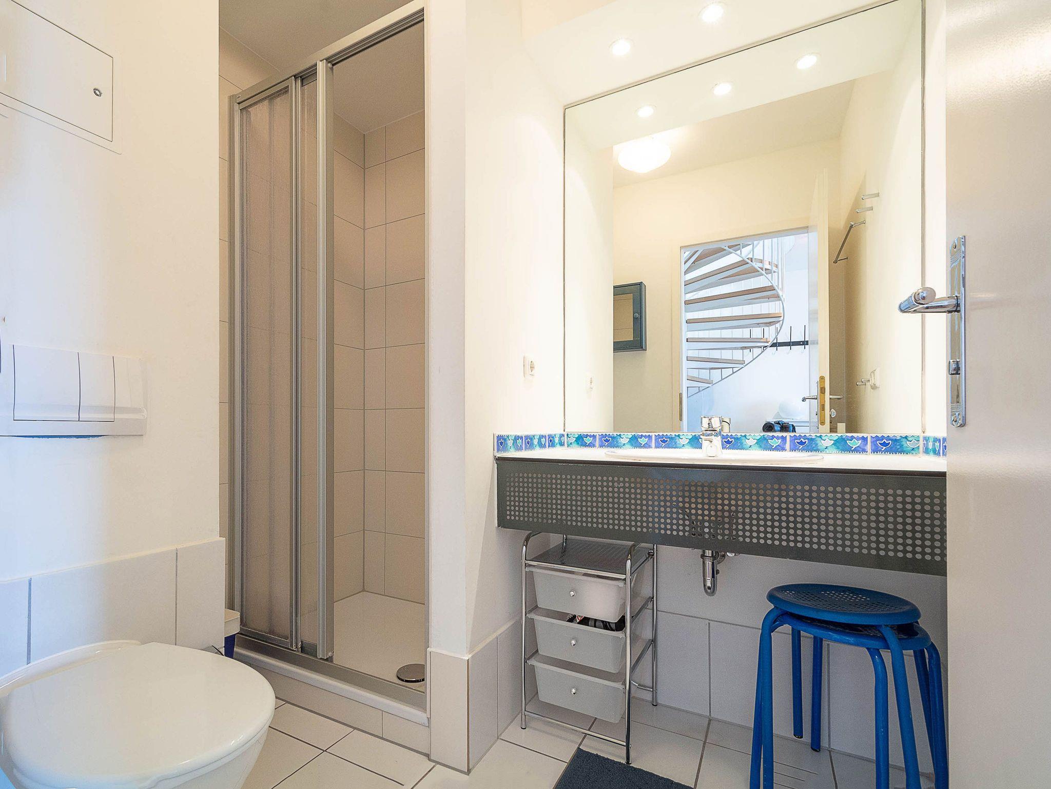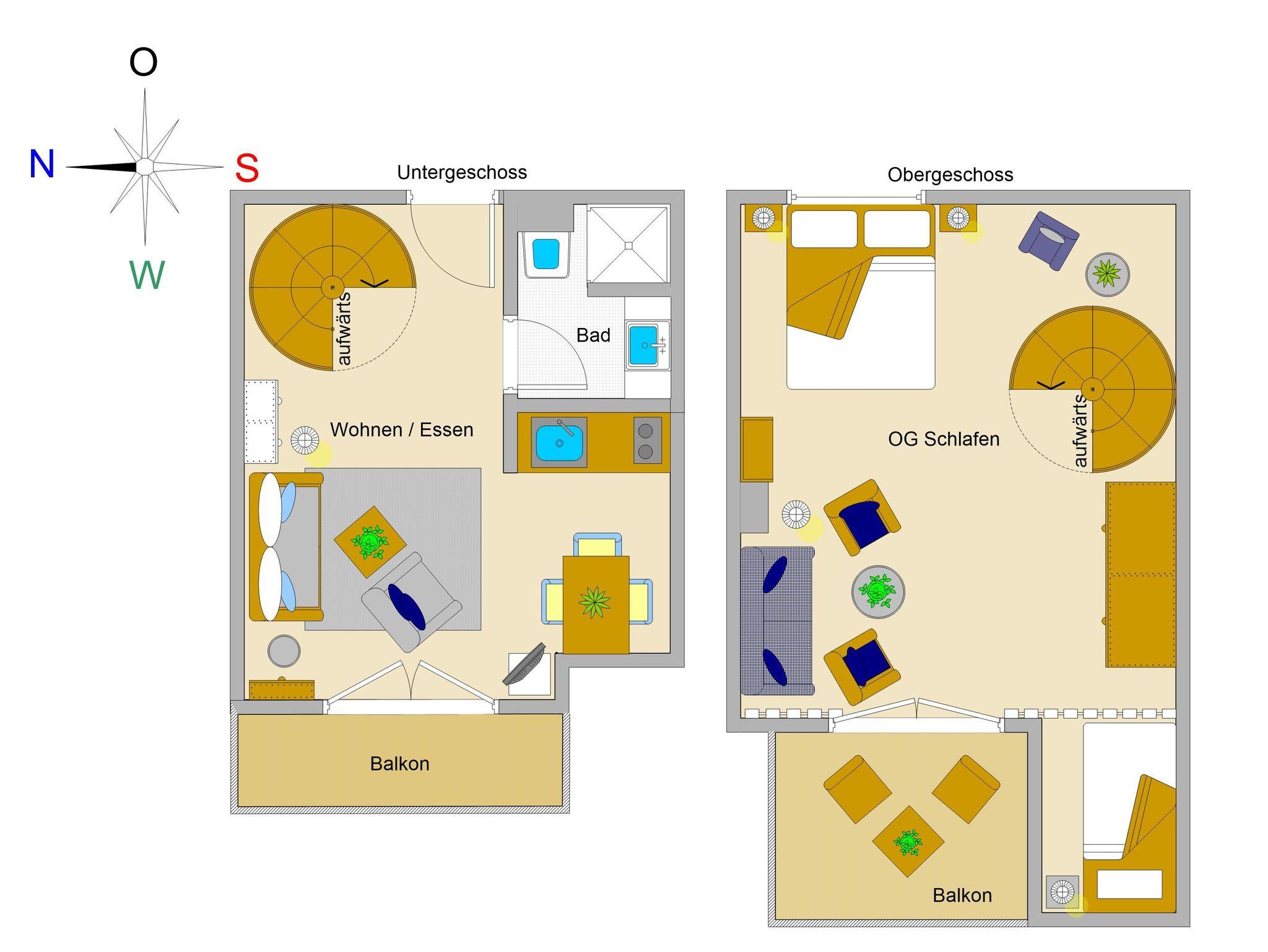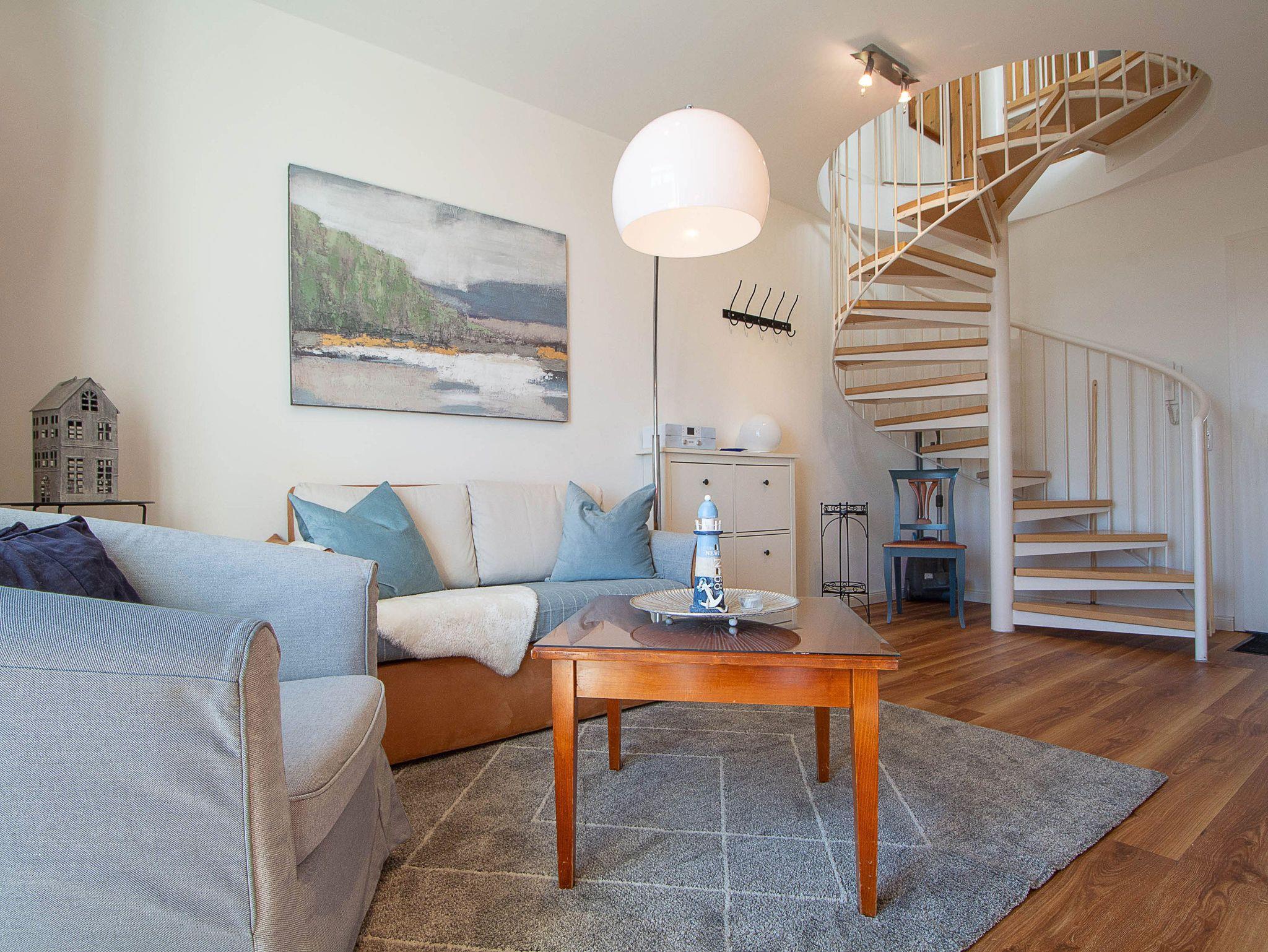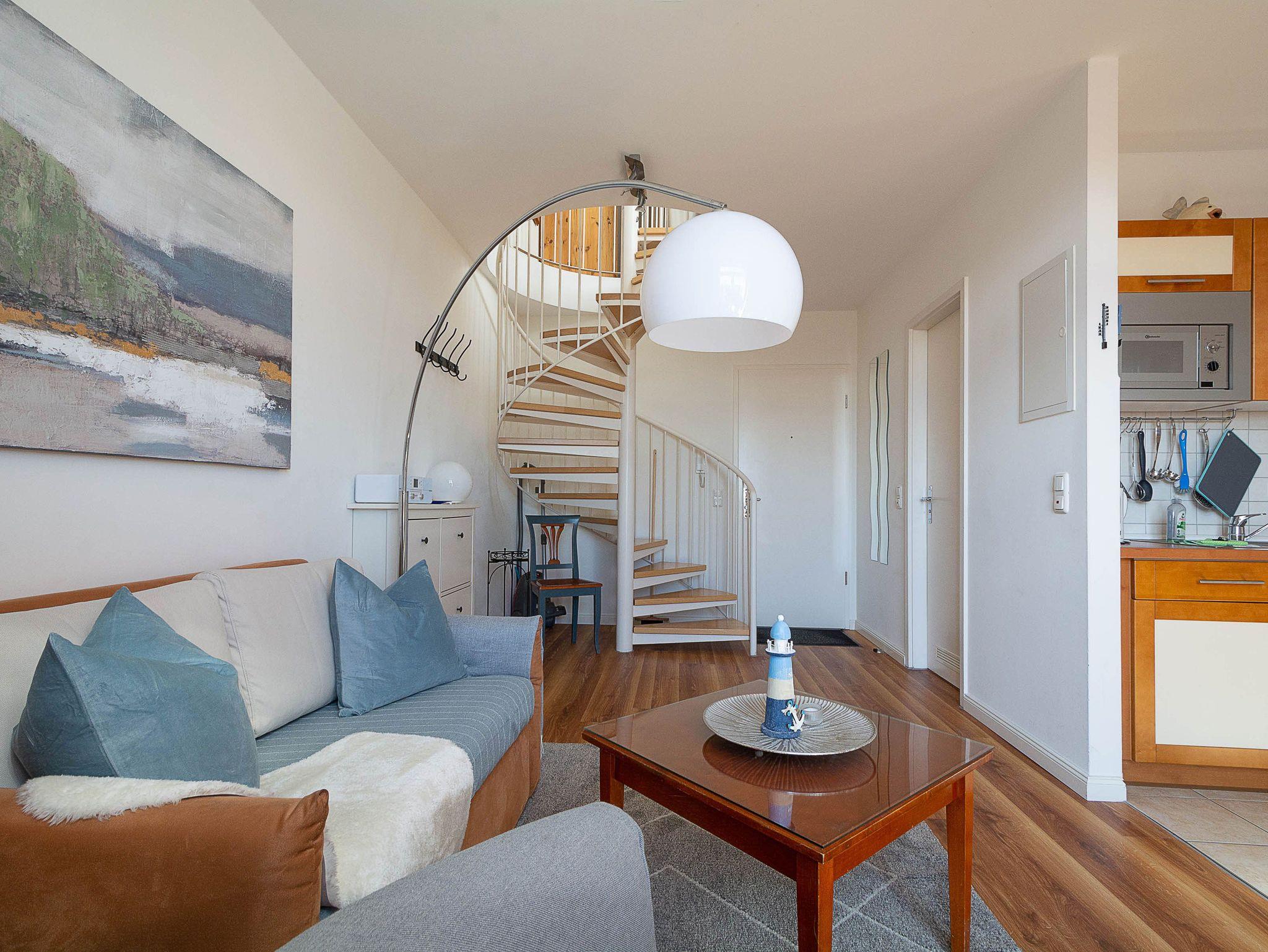 Sie wohnen in einer 2-Raum-Wohnung von ca. 51 qm Größe, die über das zweite und dritte Obergeschoss verläuft. Im unteren Bereich befindet sich das Wohnzimmer mit Küchenzeile (2-Platten-Herd, Mikrowelle), Schlafcouch, Stereoanlage und TV-Gerät. Über eine Wendeltreppe gelangen Sie in den oberen offenen Schlafbereich mit Doppel- und Einzelbett. Von dort aus betreten Sie auch die Loggia, die in Richtung Westen ausgerichtet ist. Das Bad mit Dusche und WC vervollständigt das Gesamtbild dieser Wohnung.