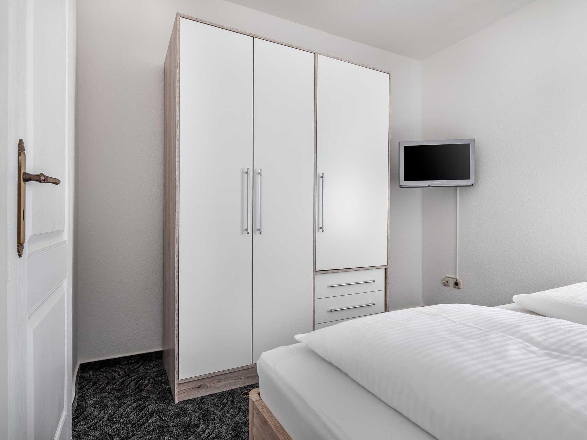 Schlafzimmer mit Doppelbett und Kleiderschrank
