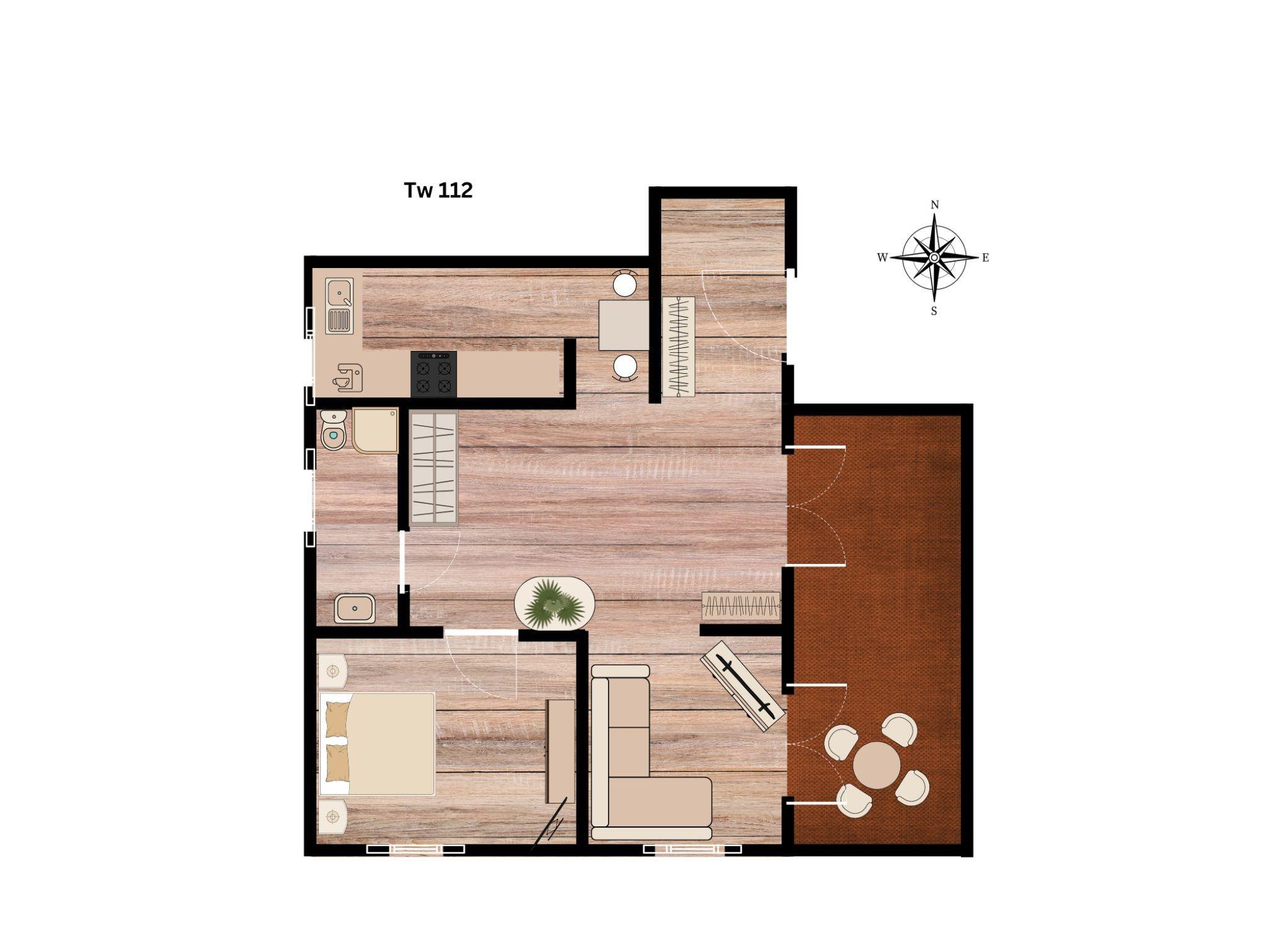 Die Wohnung TW112 ist eine funktionale Zweiraum-Wohnung mit Balkon zur Ostseite und ca. 50 qm groß.