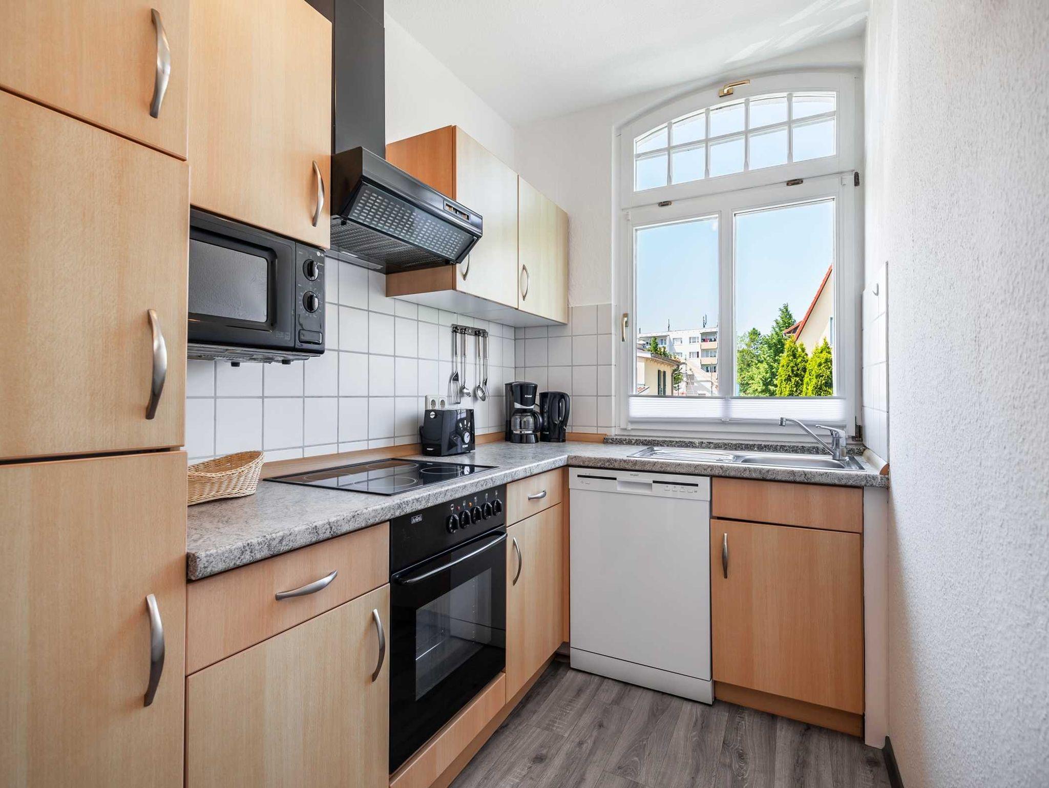 Küche mit Mikrowelle, 4-Platten-Ceran-Herd, Kühlschrank, kleiner Gefrierschrank, Geschirrspüler und Kaffeemaschine