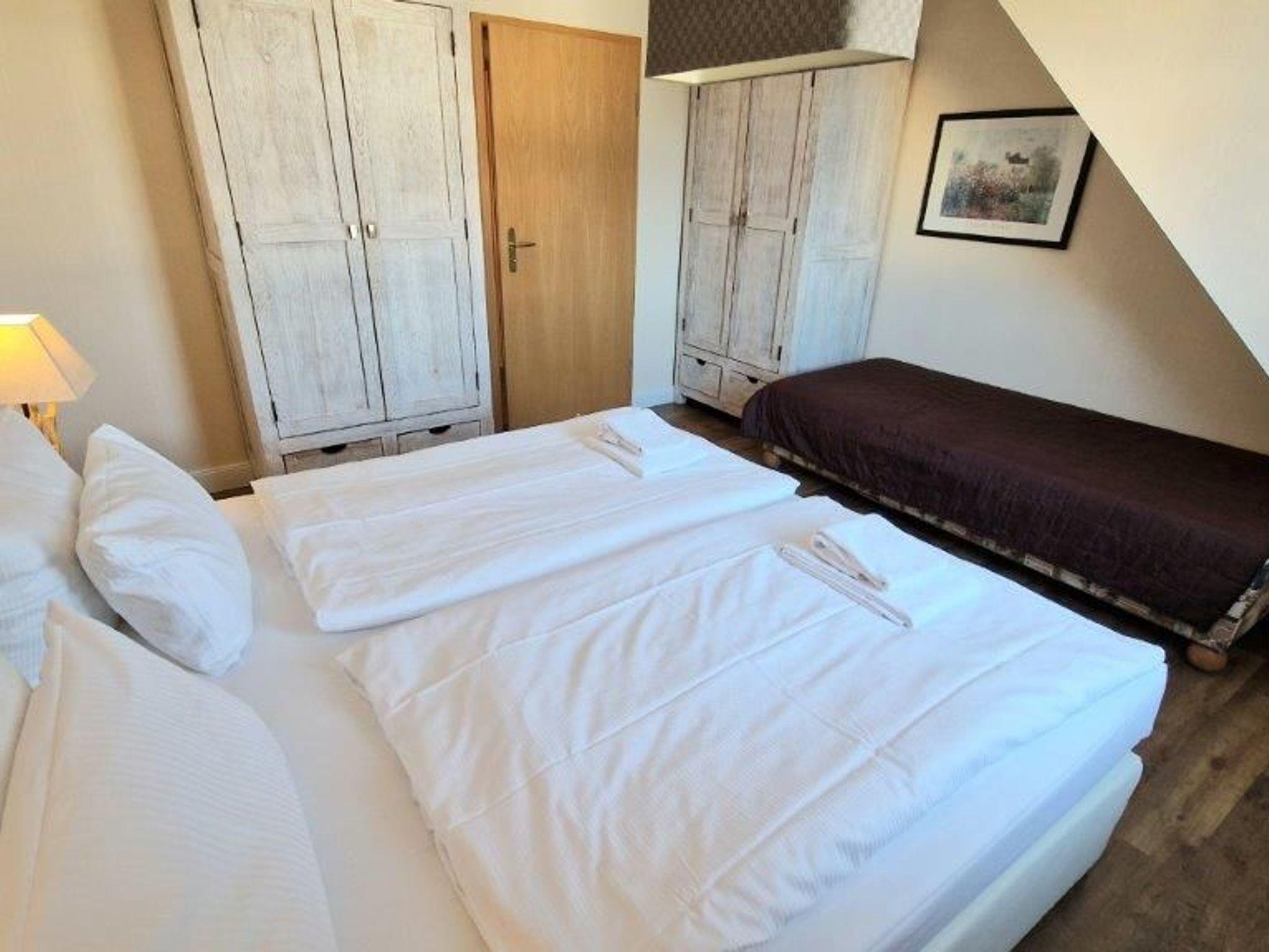 Das 1,80 Meter breite Doppelbett und ein Kleiderschrank komplettieren die Einrichtung.