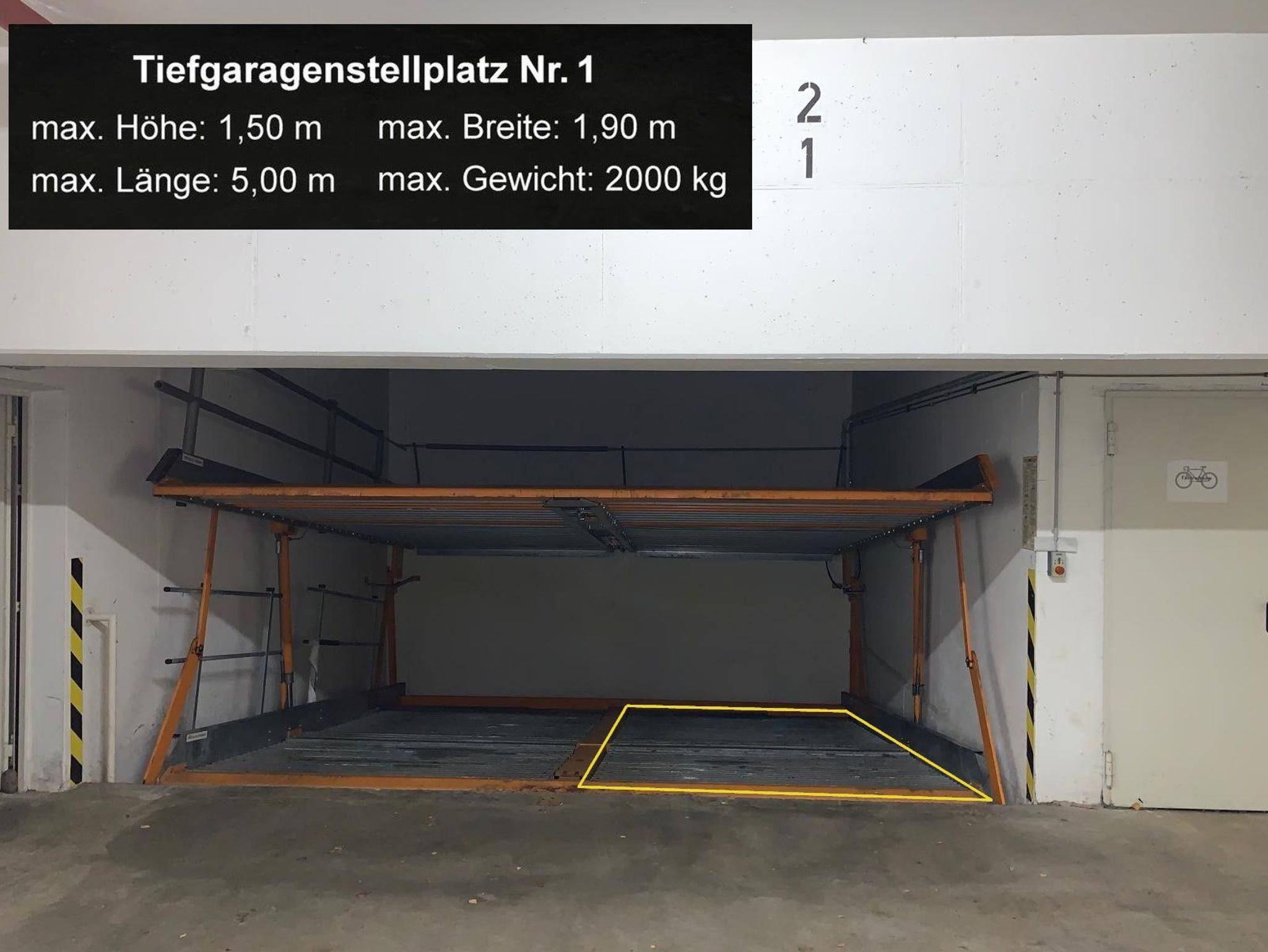 Zur Wohnung gehört ein Duplex-Stellplatz in der Tiefgarage, auf dem PKWs bis zu 1,50 m Höhe / 1,90 m Breite / 5 m Länge und einem Gewicht bis zu 2000 kg geparkt werden können.
