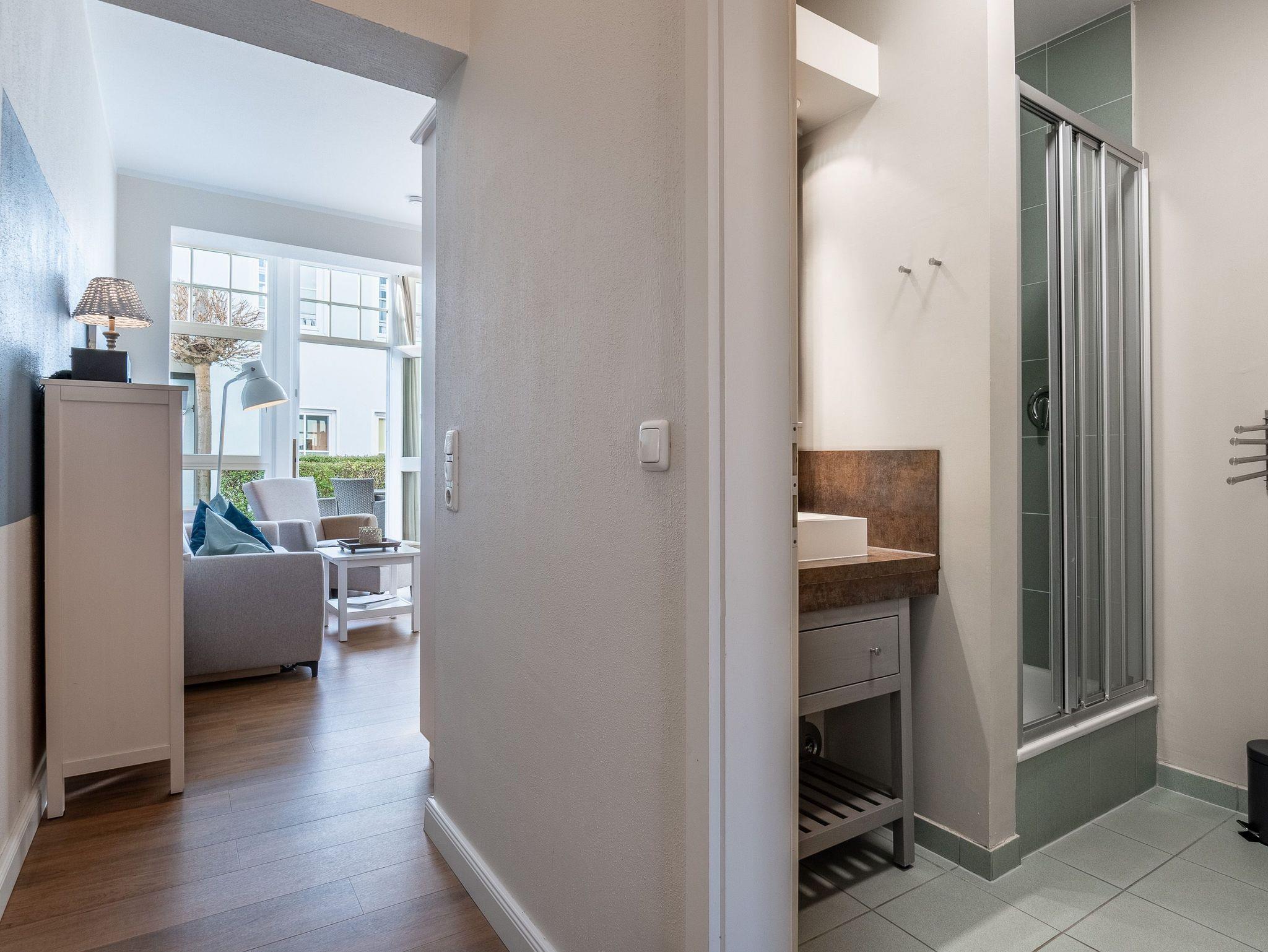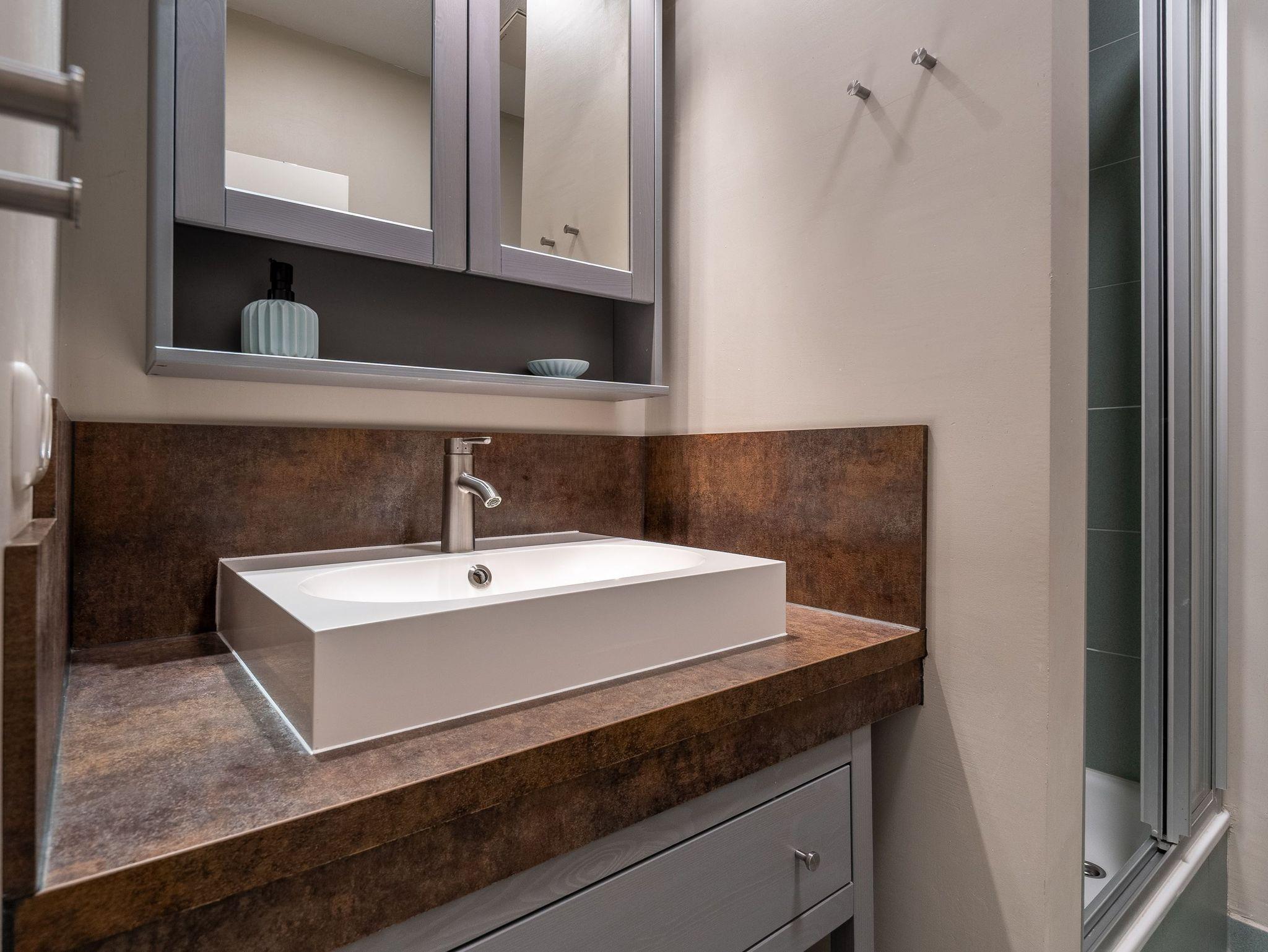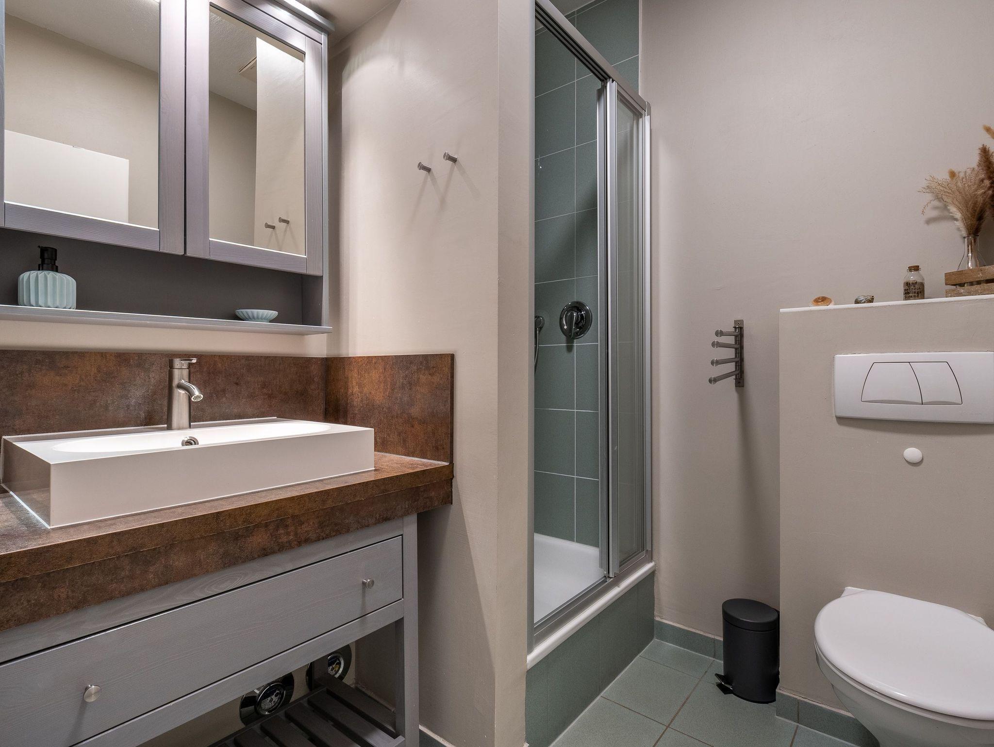 Das Bad verfügt über eine Dusche und einen Haartrockner.