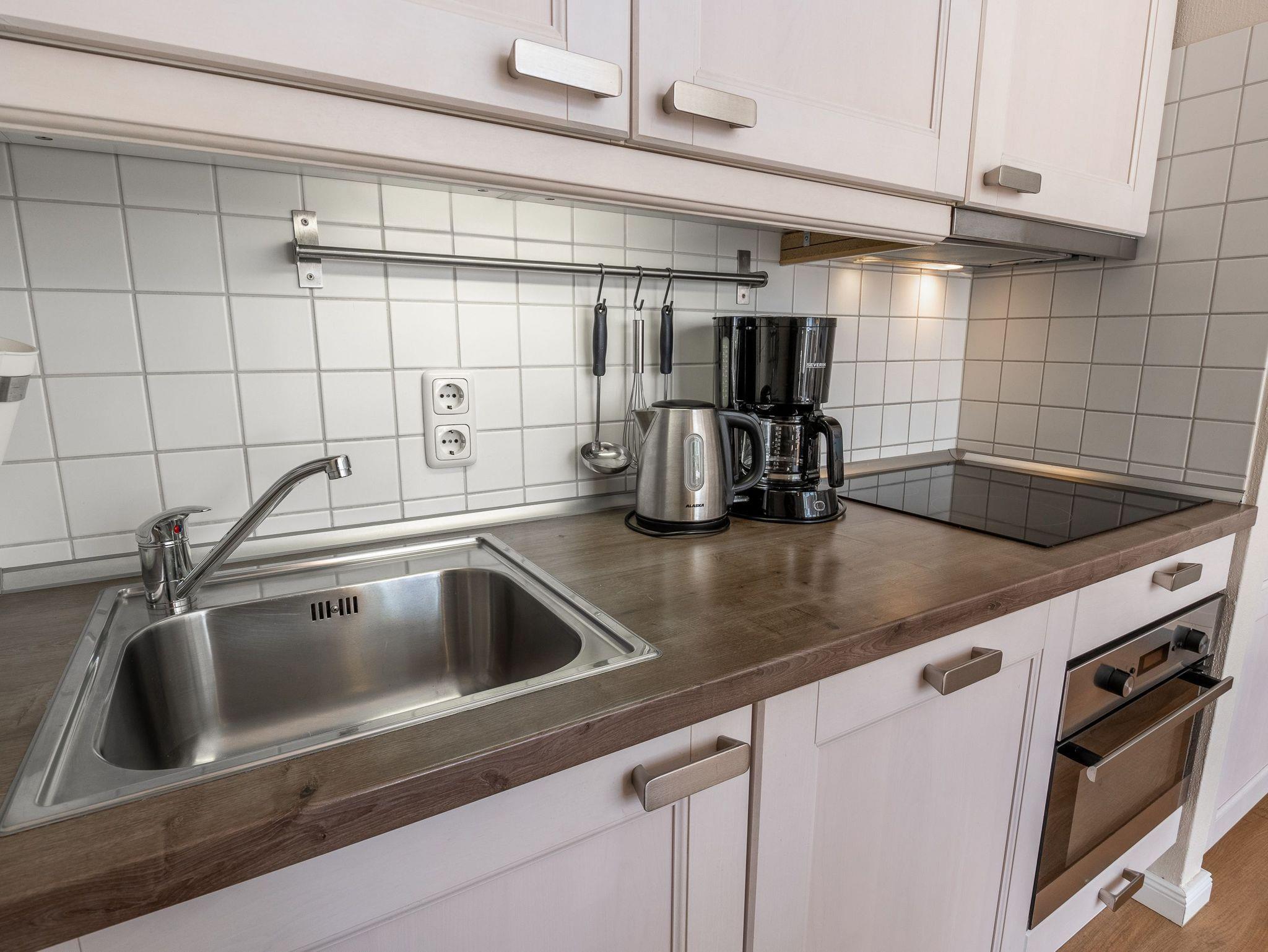 Die Küchenzeile ist vollständig ausgestattet[nbsp] mit Herd mit Cerankochfeld, Mikrowelle/Backofen, Geschirrspüler, Toaster und Wasserkocher. Zudem erwarten Sie eine Kaffeemaschine für Filterkaffee und eine Senseo-Maschine für Kaffee-Pads.