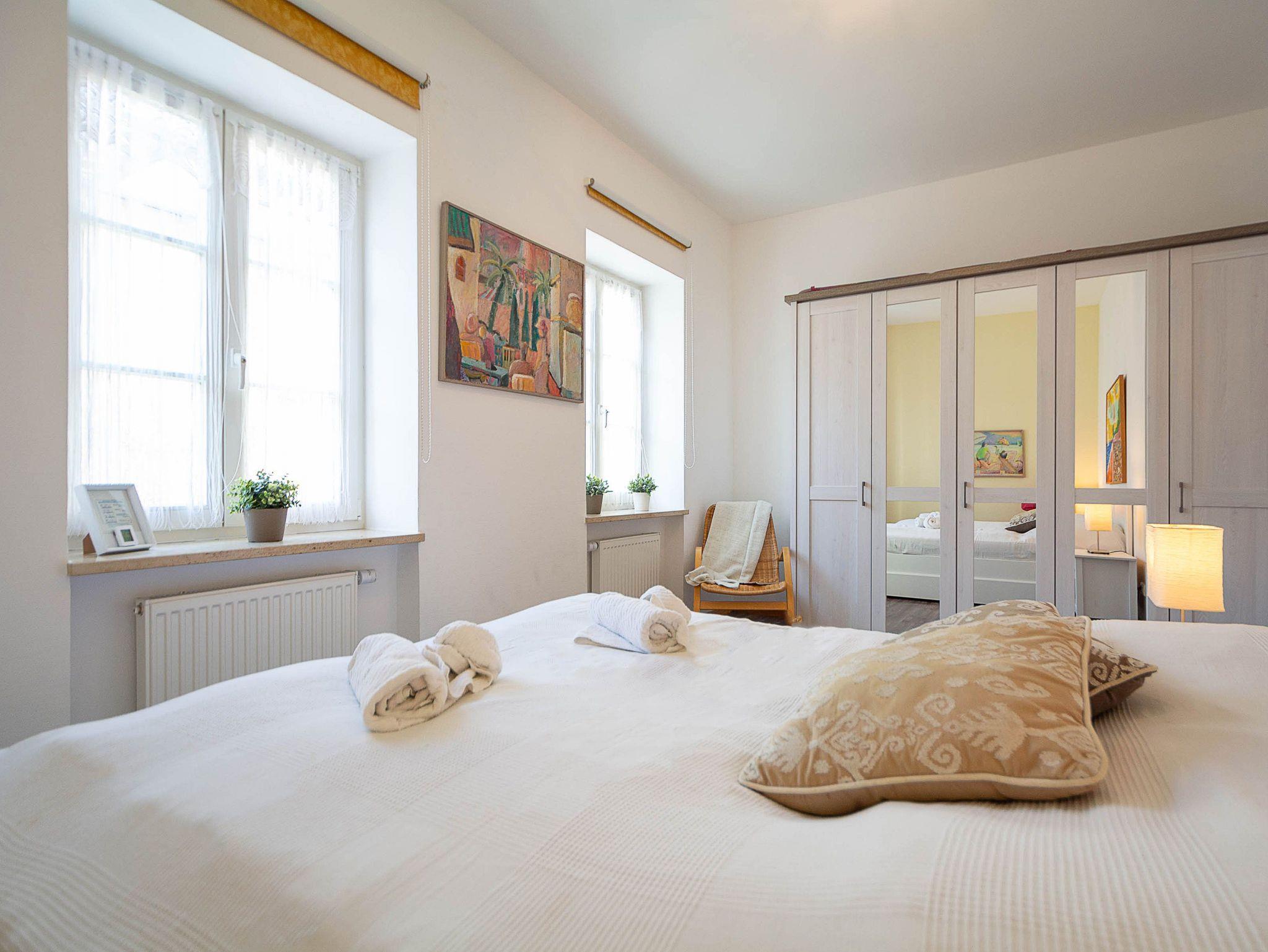 Die Unterkunft verfügt über zwei Schlafzimmer mit komfortablen Doppelbetten. Das größere, erste Schlafzimmer ist mit einem Bett in der Größe 160 × 200 cm ausgestattet. In beiden Schlafzimmern stehen großzügige Kleiderschränke für Ihre Urlaubsgarderobe zur Verfügung.