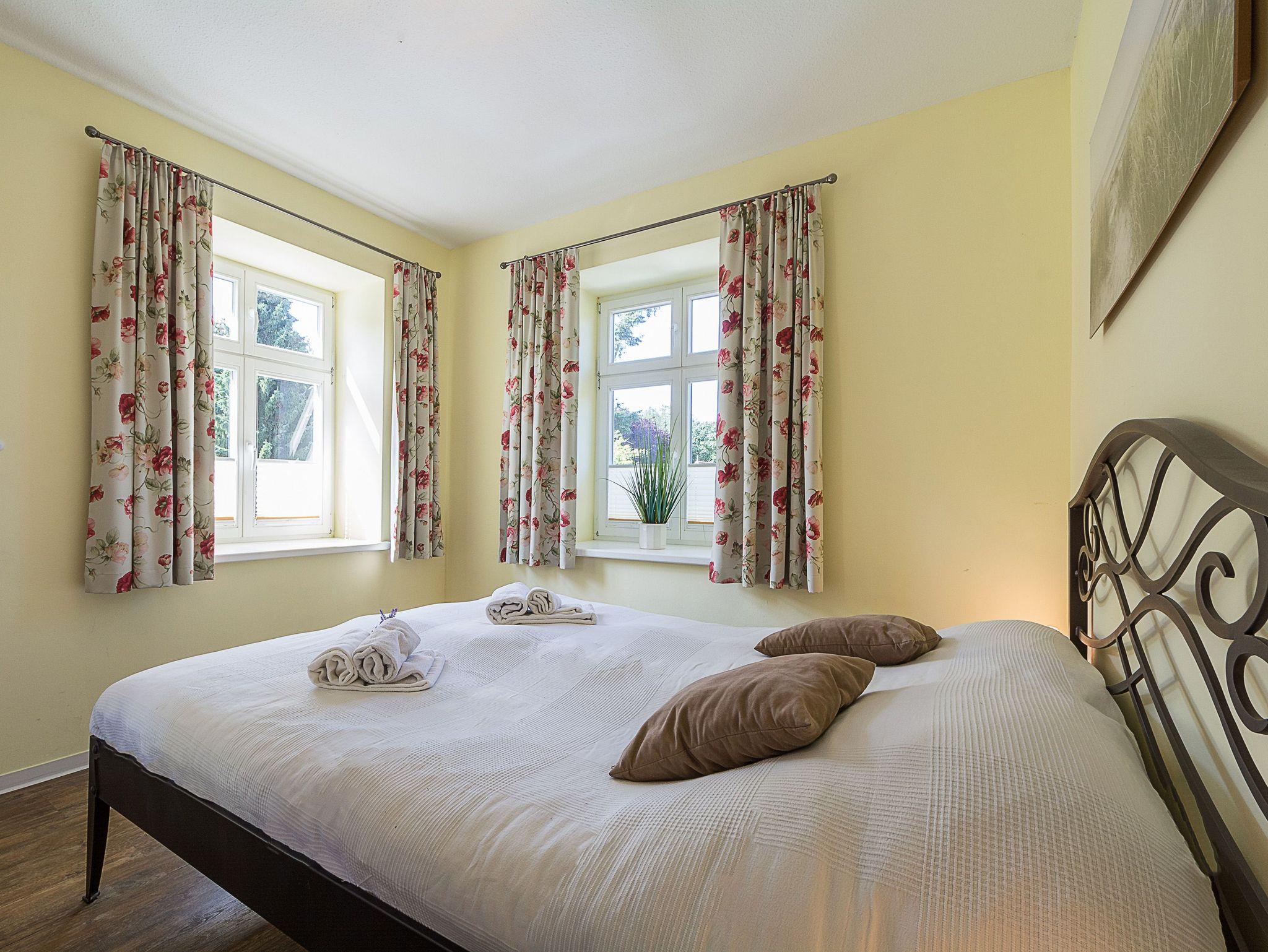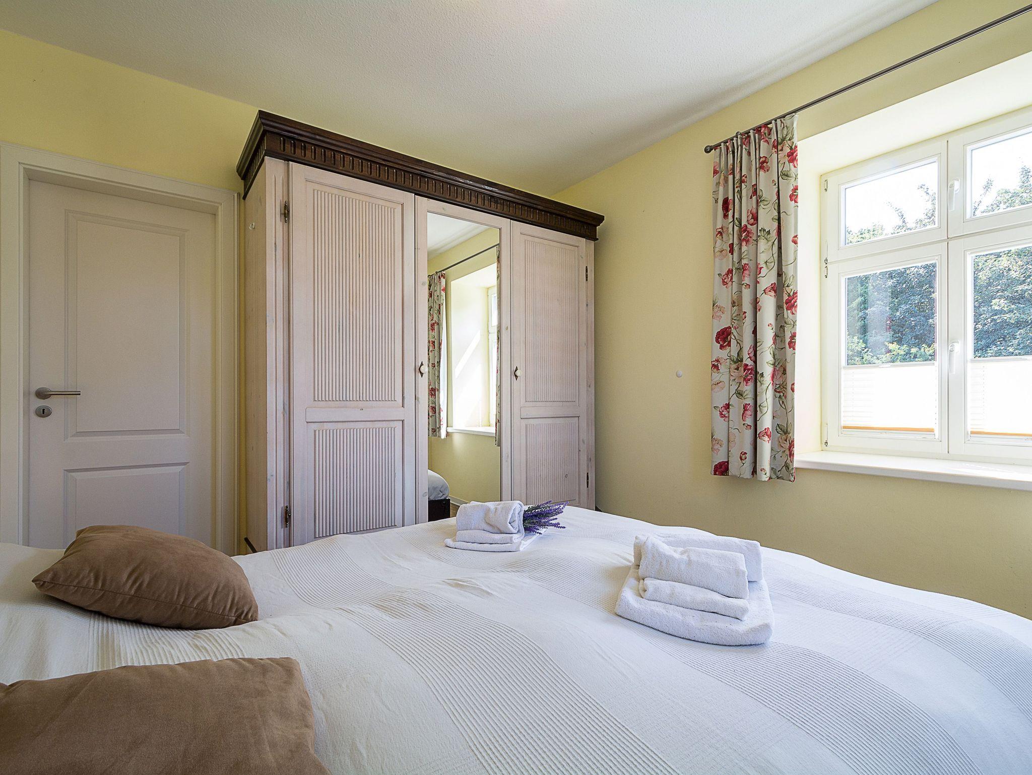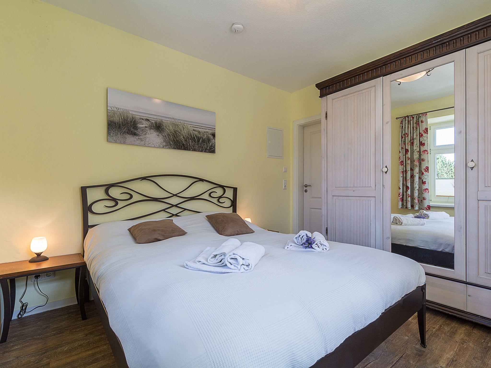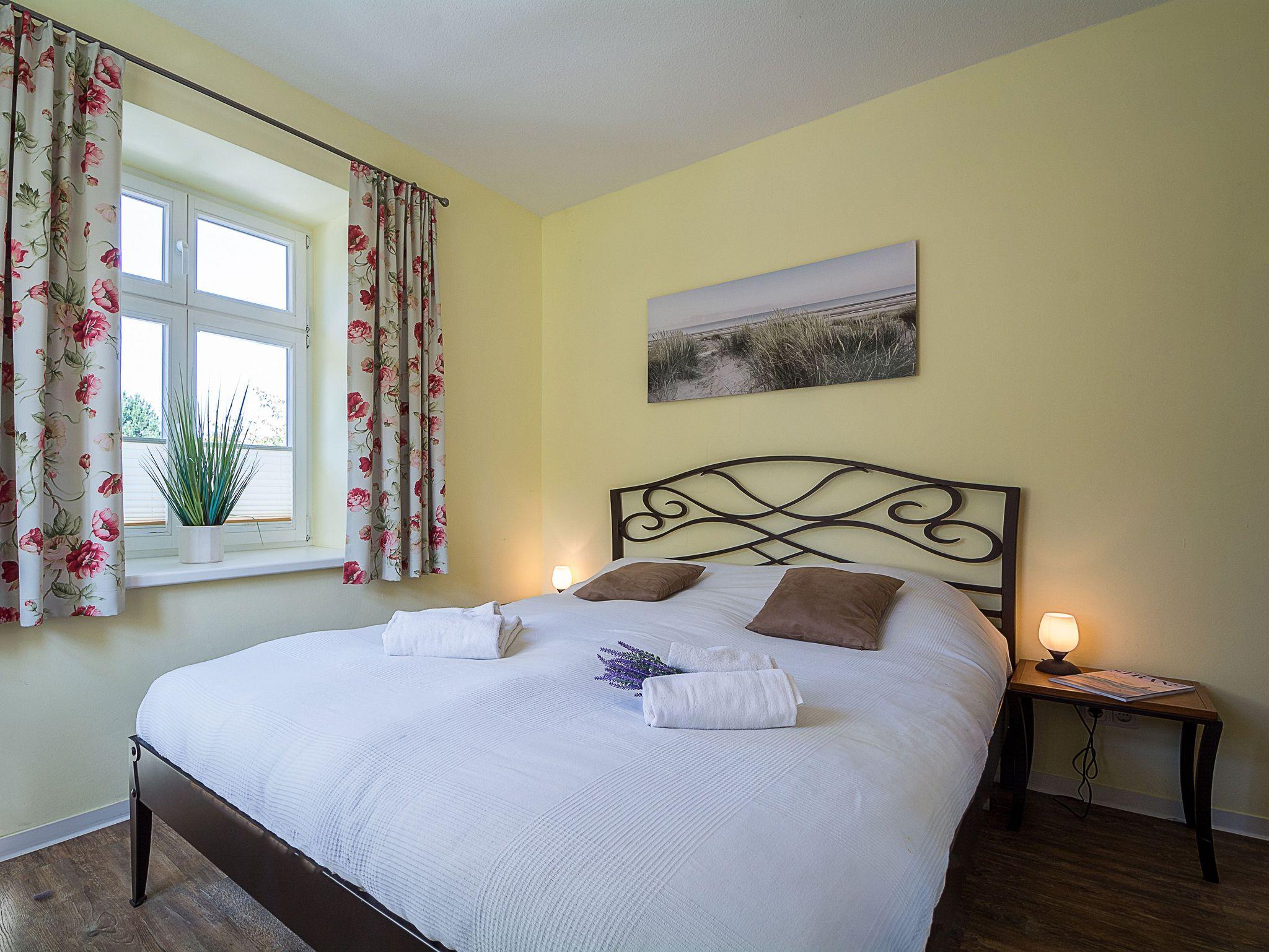Im Schlafzimmer lädt Sie ein komfortables Doppelbett (2 x 80 x 200 cm) zur Nachtruhe ein. Der großzügige Kleiderschrank im Landhausstil mit Ganzkörperspiegel bietet ausreichend Platz für Ihre Urlaubsgarderobe. Als Sichtschutz bzw. zum Verdunkeln sind im Schlafzimmer und im Wohnbereich Plissees und Vorhänge an den Fenstern angebracht.
