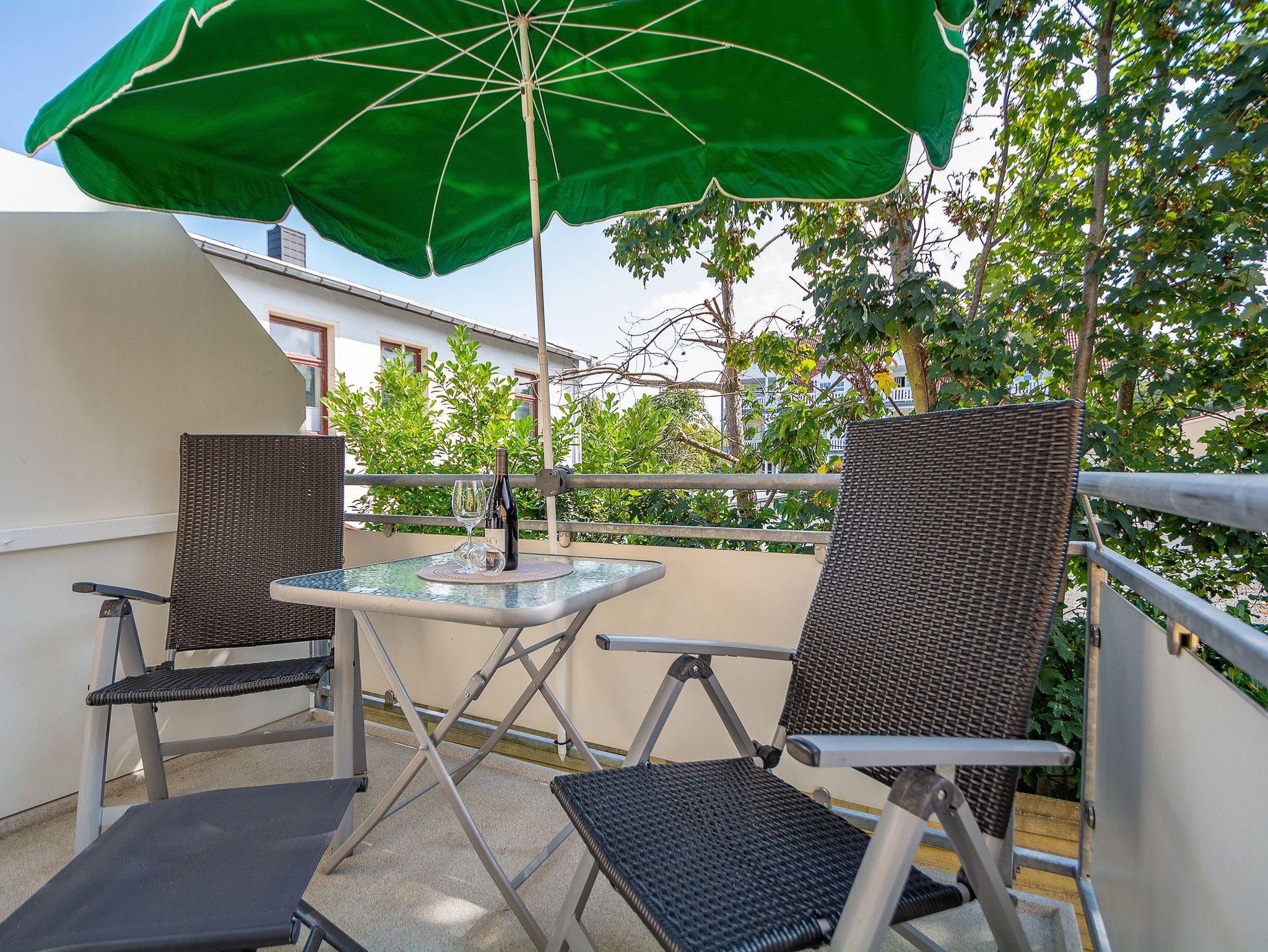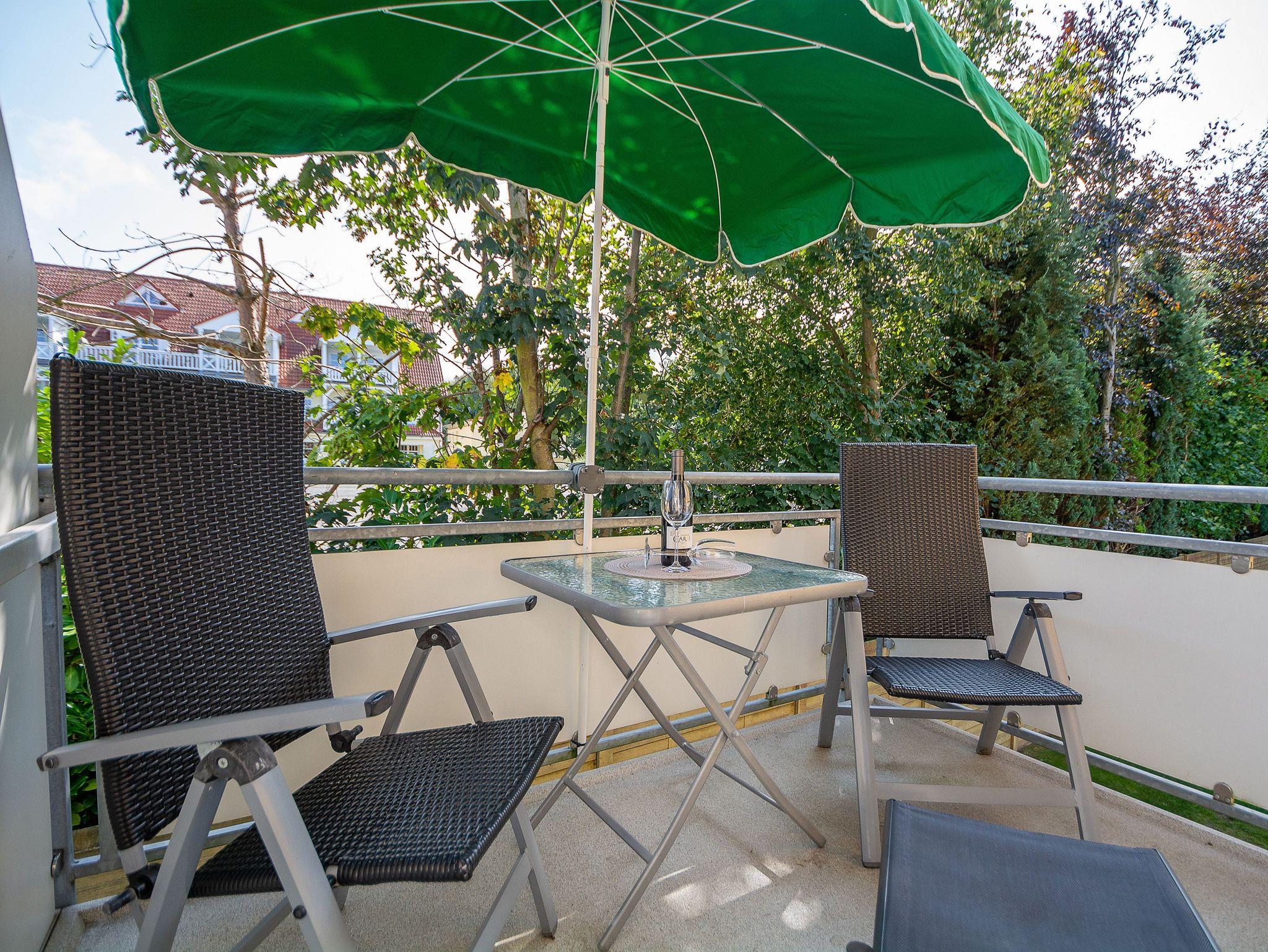 Vom Wohnbereich betreten Sie den möblierten Balkon, der nach Süd-Osten ausgerichtet ist. Hier können Sie Sonne tanken, relaxen und den Abend nach einem schönen Tag am Meer ausklingen lassen.