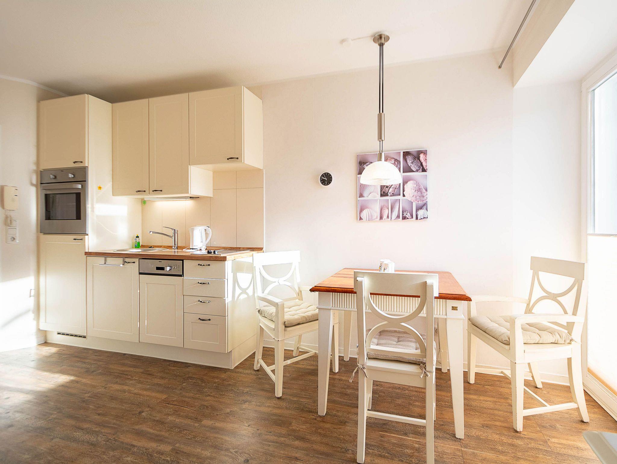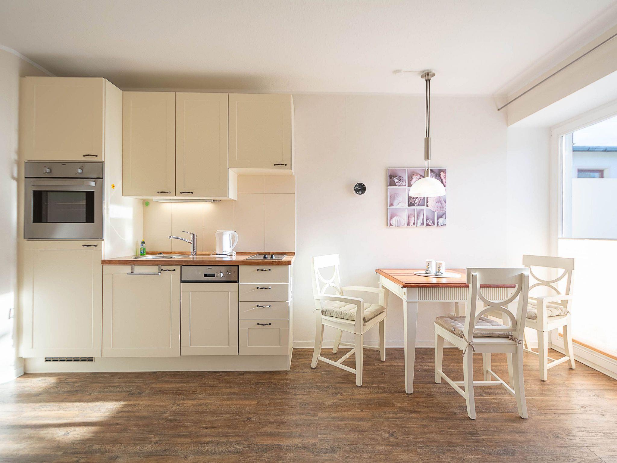 Im angrenzenden Essbereich haben Sie reichlich Platz für gemeinsame Mahlzeiten. Die im modernen Landhausstil eingerichtete Küchenzeile hält für Sie alle wichtigen Küchengeräte und -utensilien bereit, die Sie für Ihr perfektes Dinner benötigen: Ein 2-Zonen-Cerankochfeld, ein Backofen in bequemer Stehhöhe, ein Geschirrspüler sowie ein Kühlschrank mit Gefrierfach befinden sich in der Küche. Eine Kaffeemaschine, ein Wasserkocher und ein Toaster sowie genügend Koch- und Essgeschirr komplettieren die Küchenausstattung.