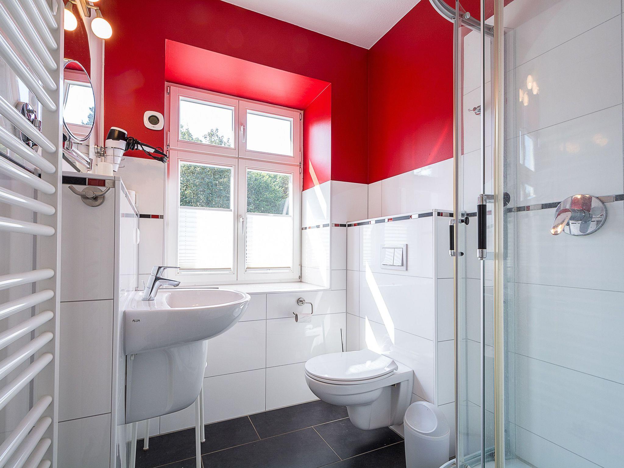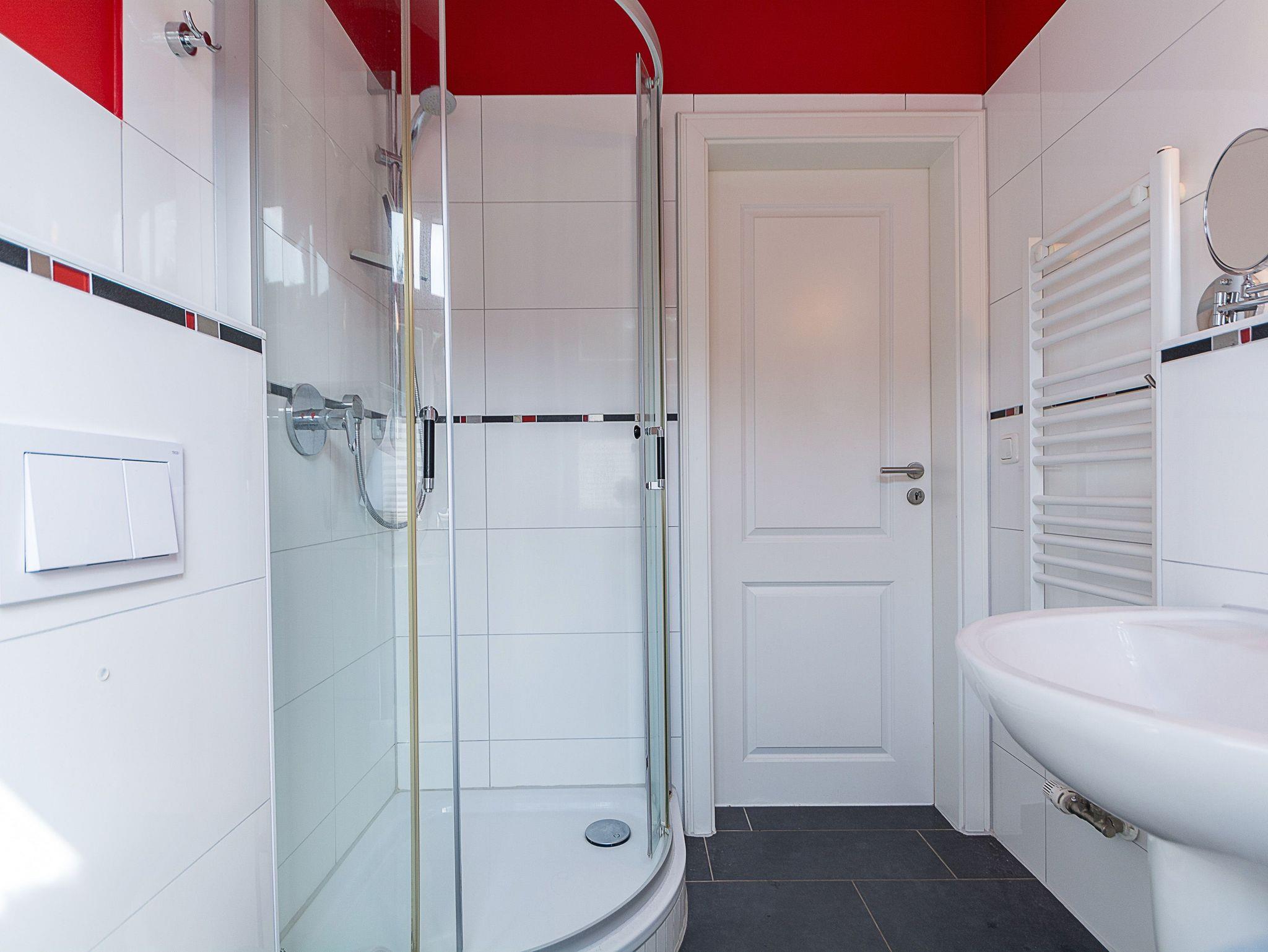 Das modern geflieste Tageslichtbad ist mit einer bodengleichen Duschkabine, Waschbecken und WC eingerichtet. Ein Handtuchheizkörper sorgt für kuschelig warme Handtücher. Ein Föhn und ein Kosmetikspiegel sowie Plissees zum Sichtschutz vervollständigen die Badeinrichtung.