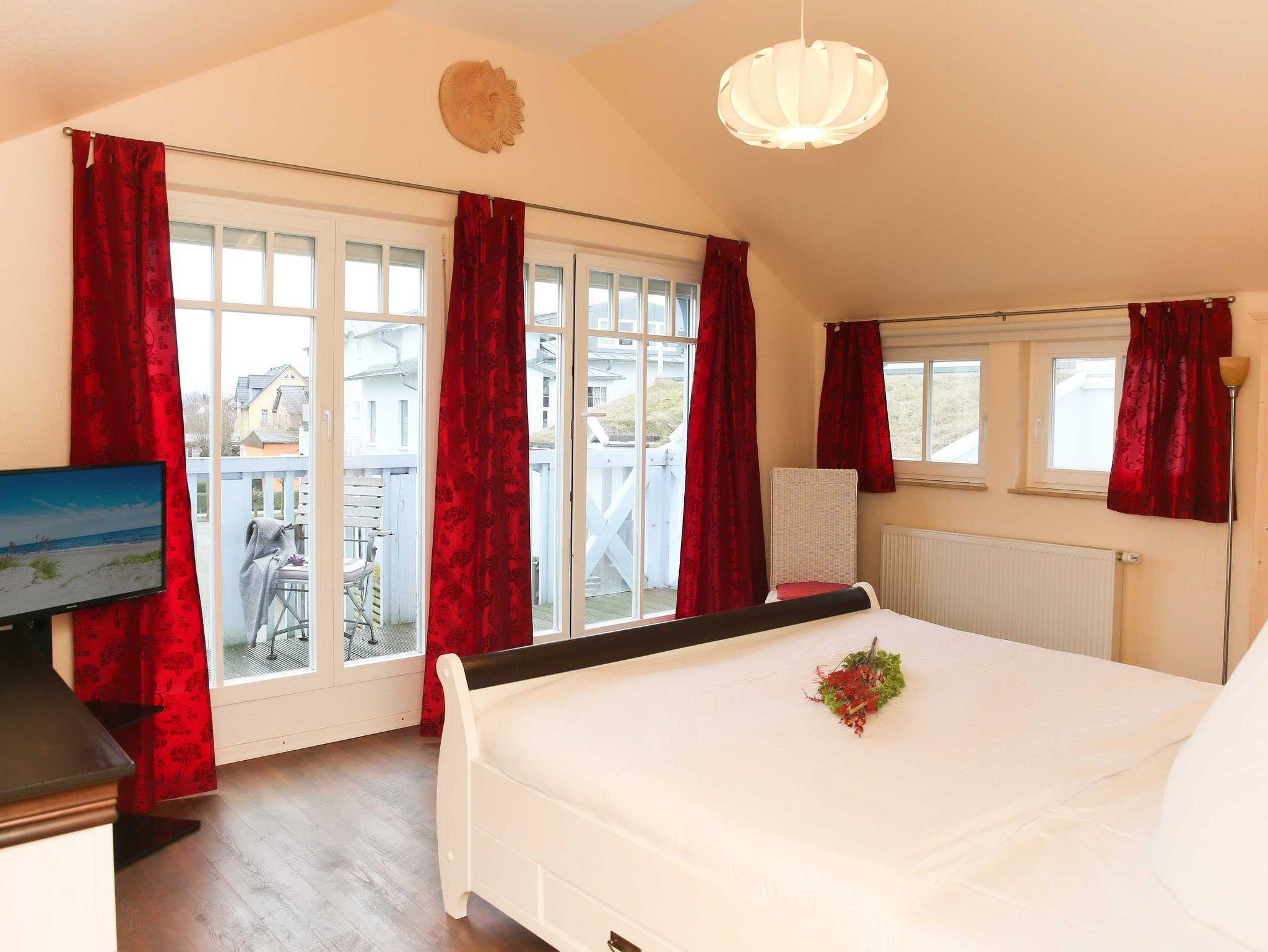 Sie wohnen in einer hochwertig eingerichteten 4-Raum-Ferienwohnung von 93 m² Größe, die sich im ersten Dachgeschoß befindet. Das Wohnzimmer ist ausgestattet mit einer bequemen Sitzgarnitur, Essecke, Flatscreen-TV und Dolby Surround-Anlage mit DVD Player. Vom Wohnraum aus betreten Sie die Südwestdachterrasse, die zum Entspannen einlädt. Die Küche ist ausgestattet mit Geschirrspüler, Mikrowelle, Ceranfeld mit Backofen u.v.m. Die Wohnung verfügt über zwei Schlafzimmer mit Doppelbett, Kleiderschrank und Flatscreen-TV (vom großen Schlafzimmer können Sie den Südostbalkon betreten) sowie ein Schlafzimmer mit Etagenbett. Das Bad mit Eckbadewanne, Dusche und WC vervollständigt das Gesamtbild dieser Wohnung.