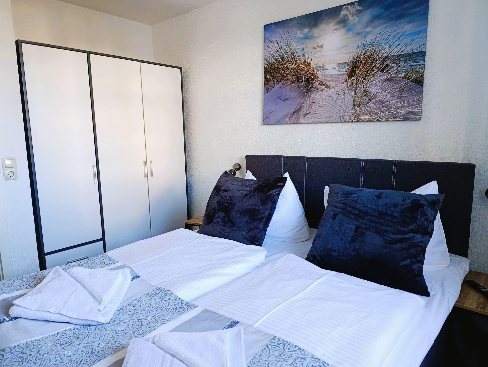 Schlafzimmer mit Doppelbett und Kleiderschrank