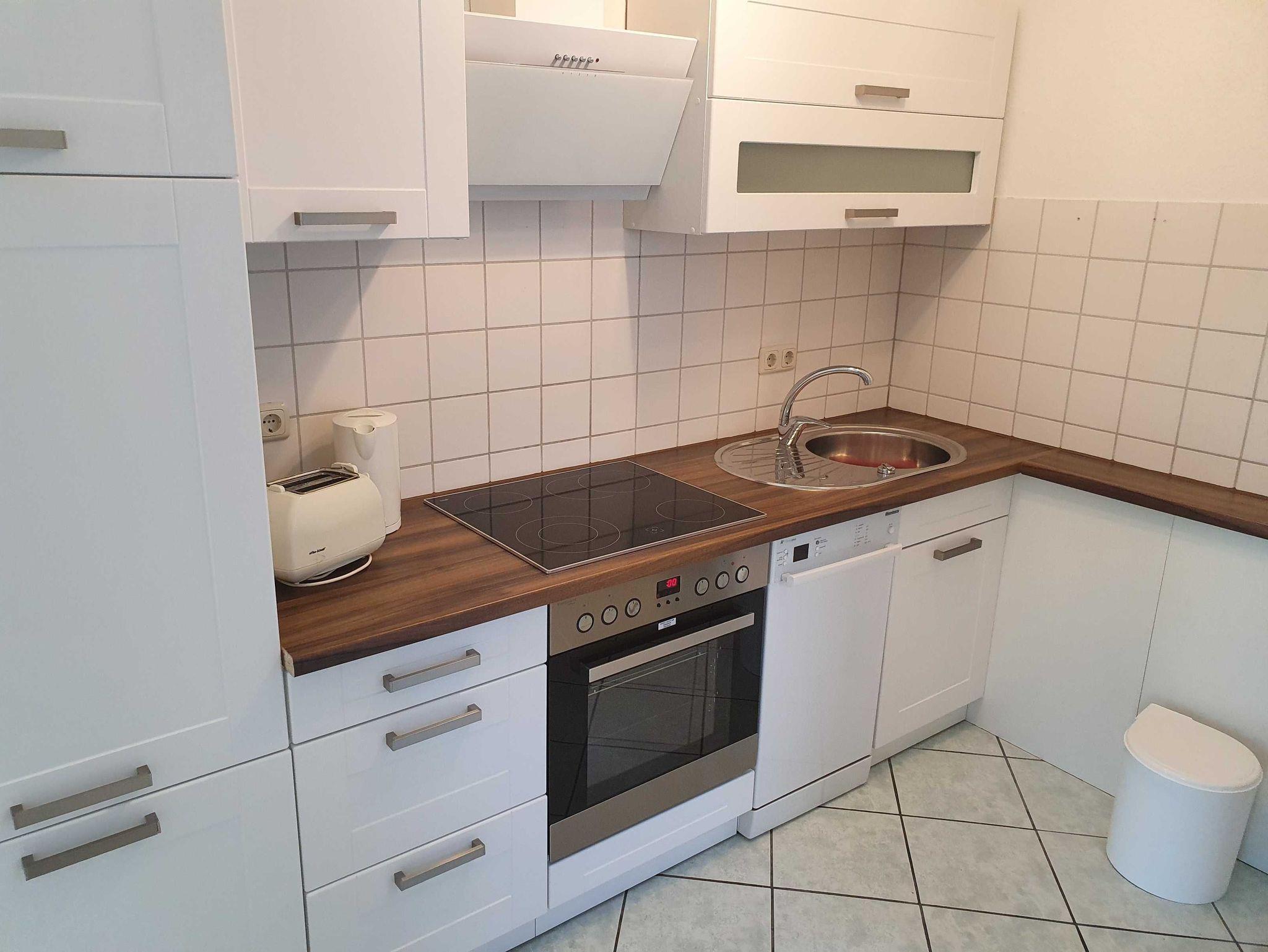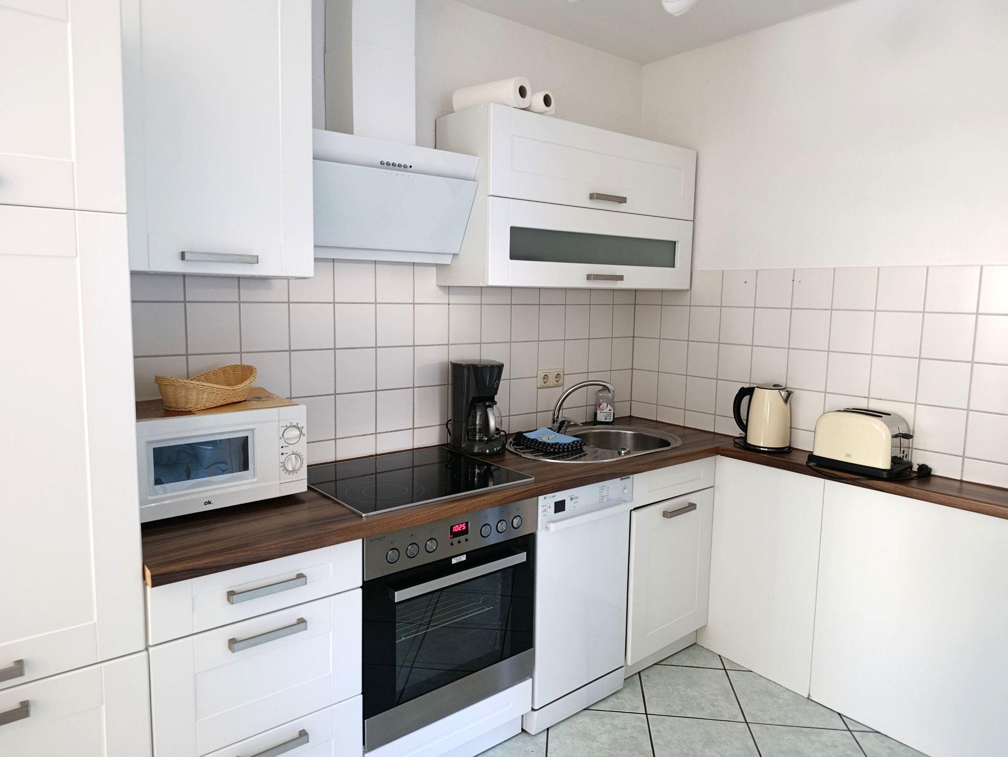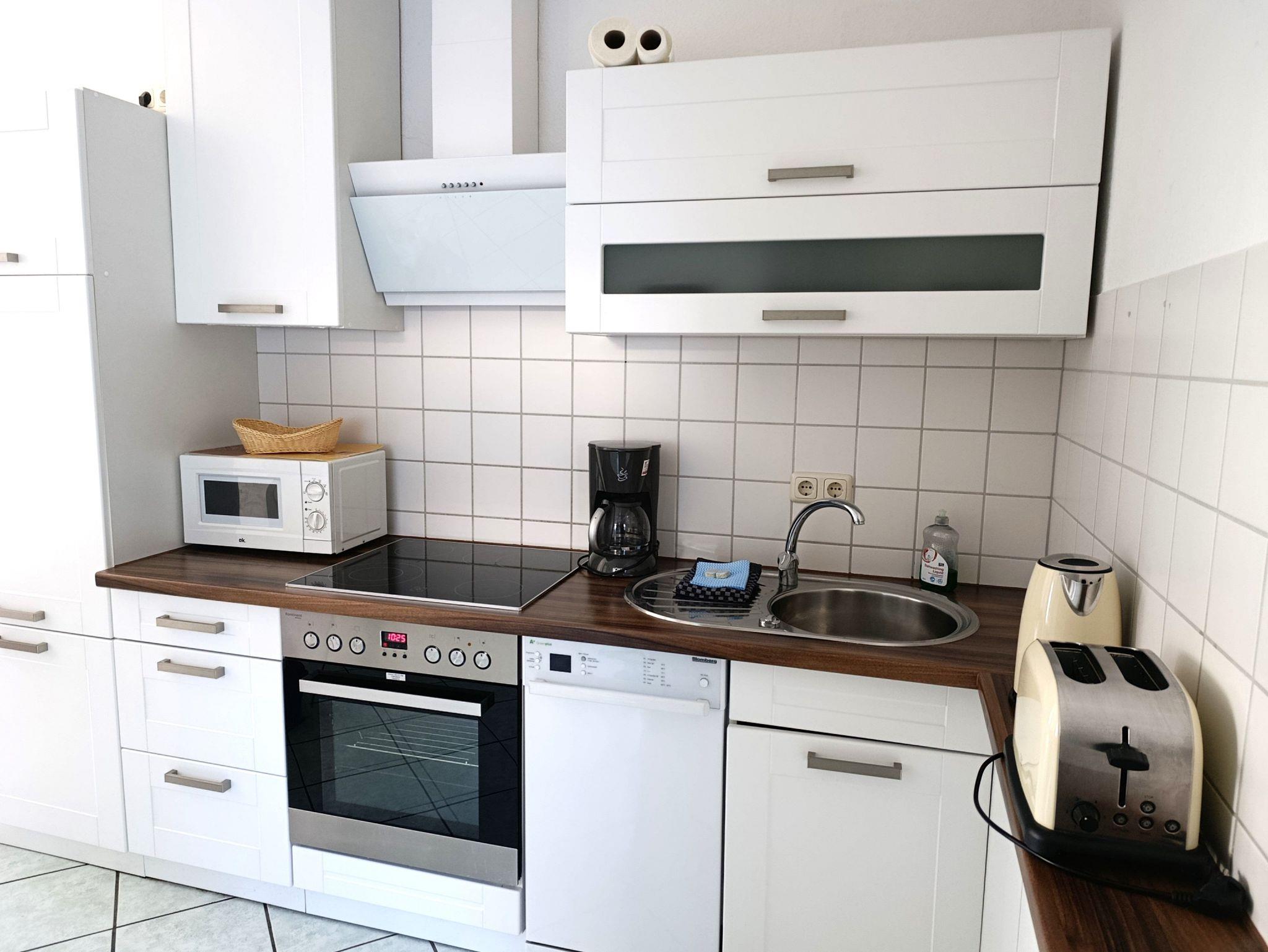 Küchezeile mit Mikrowelle, 4-Platten-Ceran-Herd, Kühlschrank, kleiner Gefrierschrank, Geschirrspüler und Kaffeemaschine