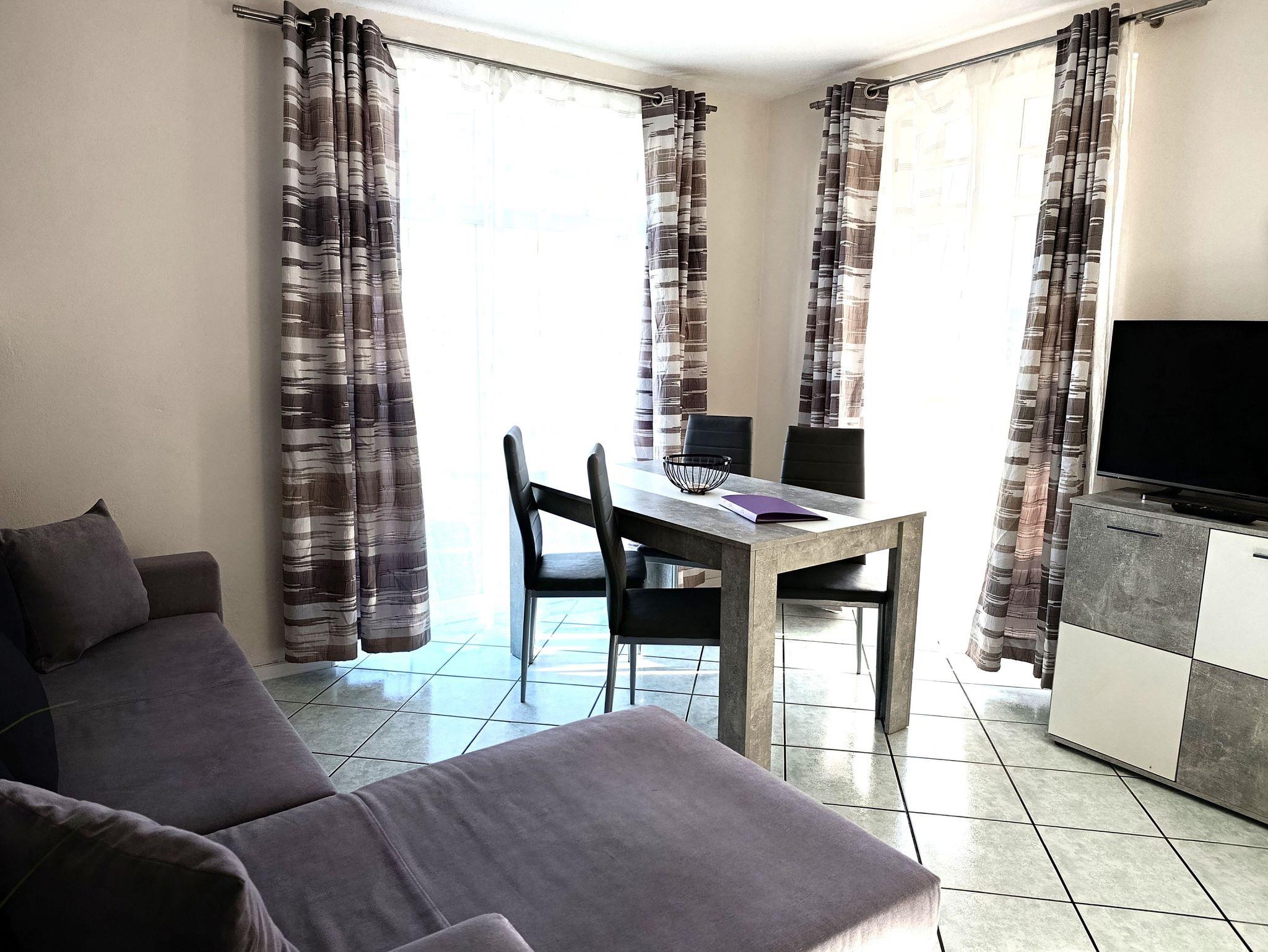 Wohnzimmer mit Couch, Esstisch, Anrichte, Kabel-TV und Radio